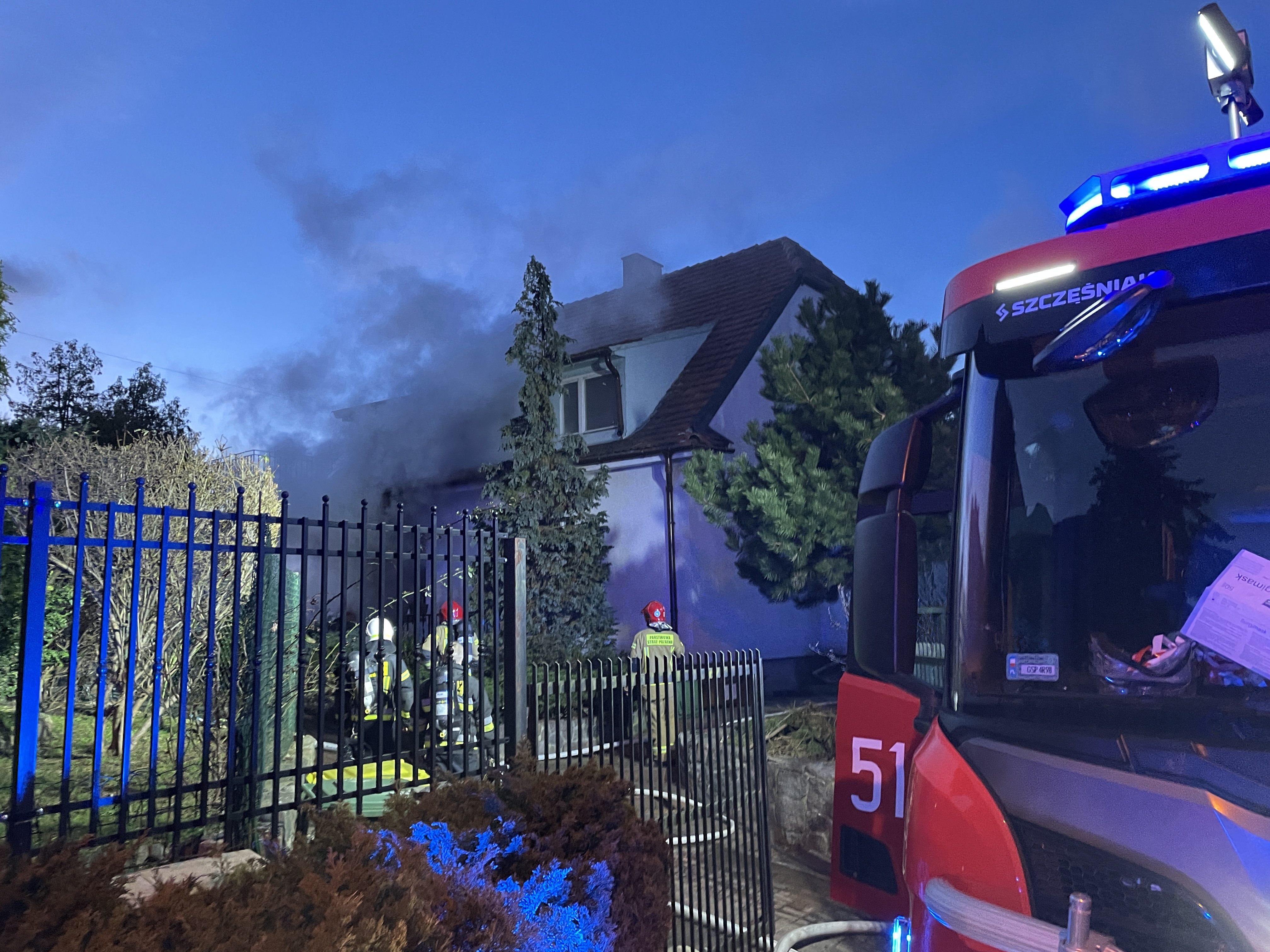 Na miejsce zadysponowano zastepy z JRG PSP Sopot i OSP Sopot, prowadzące cały czas działania związane z usuwaniem skutków silnego wiatru oraz zastępy JRG PSP Gdańsk. Po dojeździe widoczne były płomienie wychodzące na zewnątrz przez drzwi tarasowe. Na miejscu obecna była już Policja. Odłączono w budynku energię elektryczna oraz gaz Podano dwa prądy wody w natarciu. Pierwsza rota w sprzęcie UOU wprowadziła linię gaśniczą do budynku w miejscu gdzie płomienie wychodziły na taras budynku, druga rota w sprzęcie UOU wprowadziła linie gaśniczą przez otwarte drzwi wejściowe do budynku. Następnie oddymiono poddasze i ponownie przeszukano, brak zagrożeń i osób poszkodowanych. Po ugaszeniu pożaru na parterze przeszukano pomieszczenia - brak osób poszkodowanych. Sprawdzono również pomieszczenia piwniczne - brak osób poszkodowanych. Po zakończeniu działań budynek przekazano do zabezpieczenia Policji.