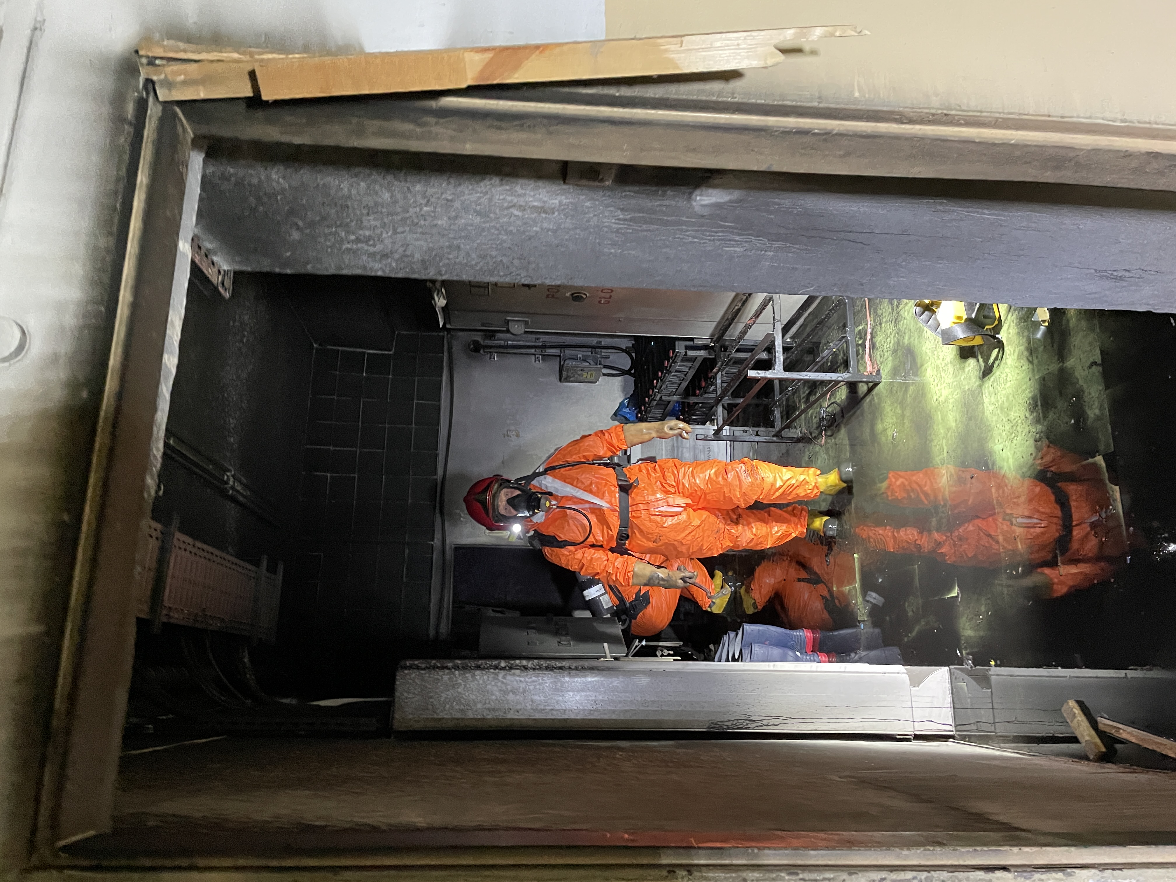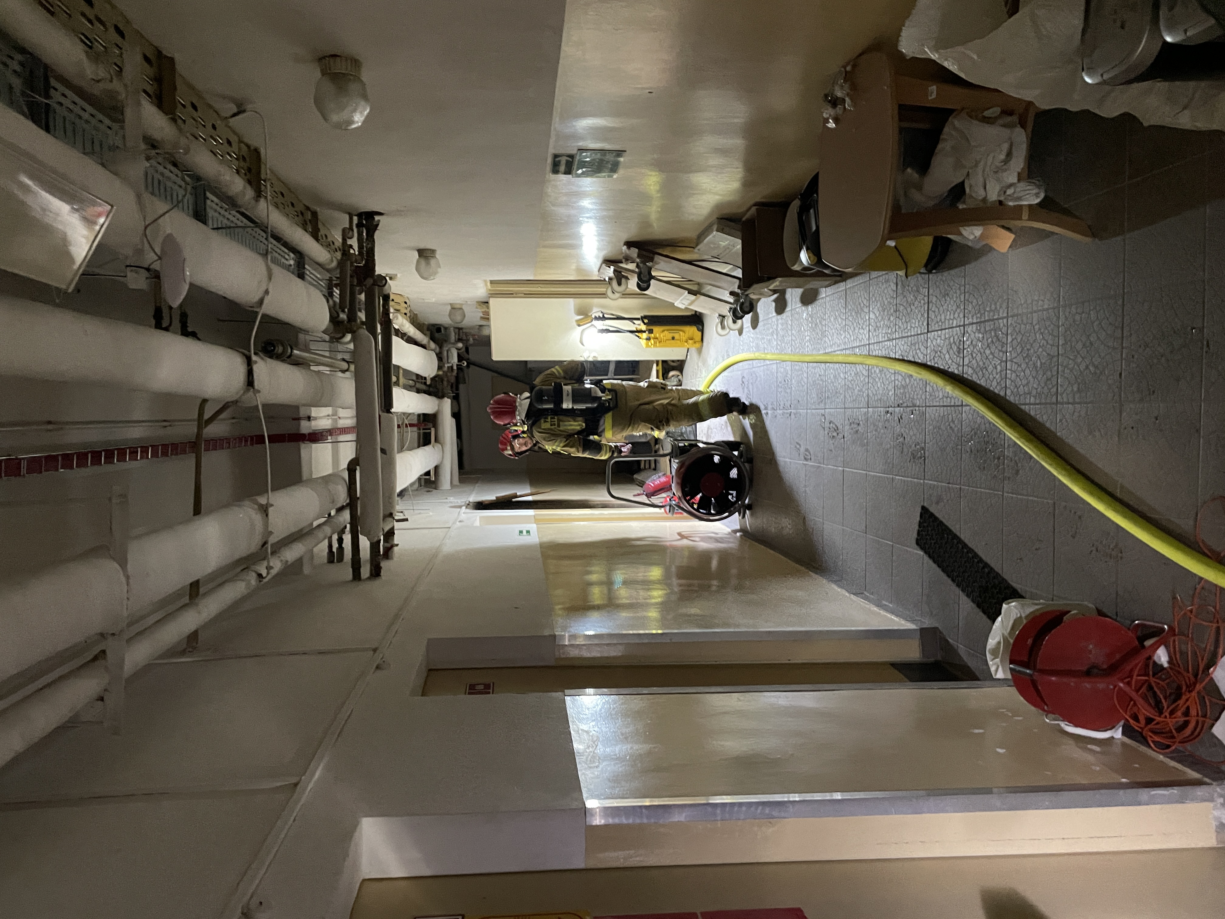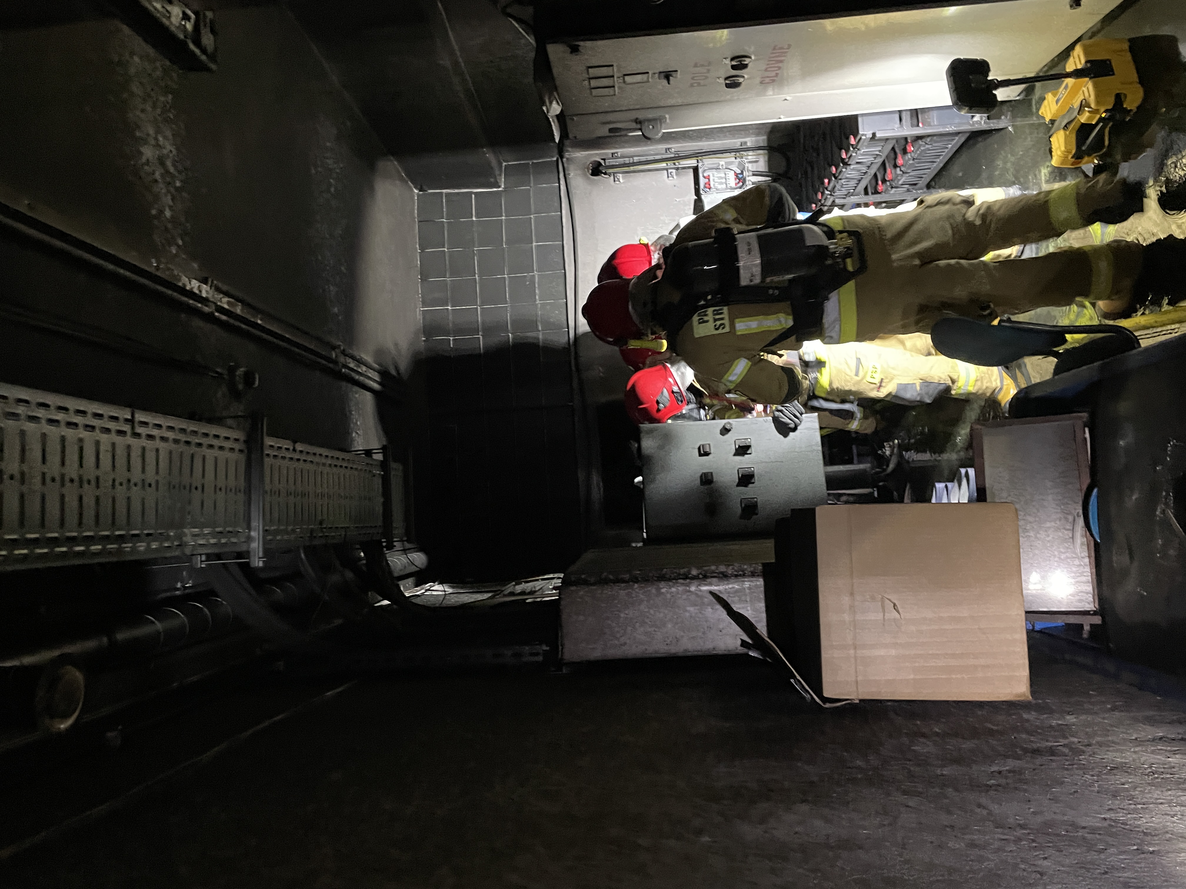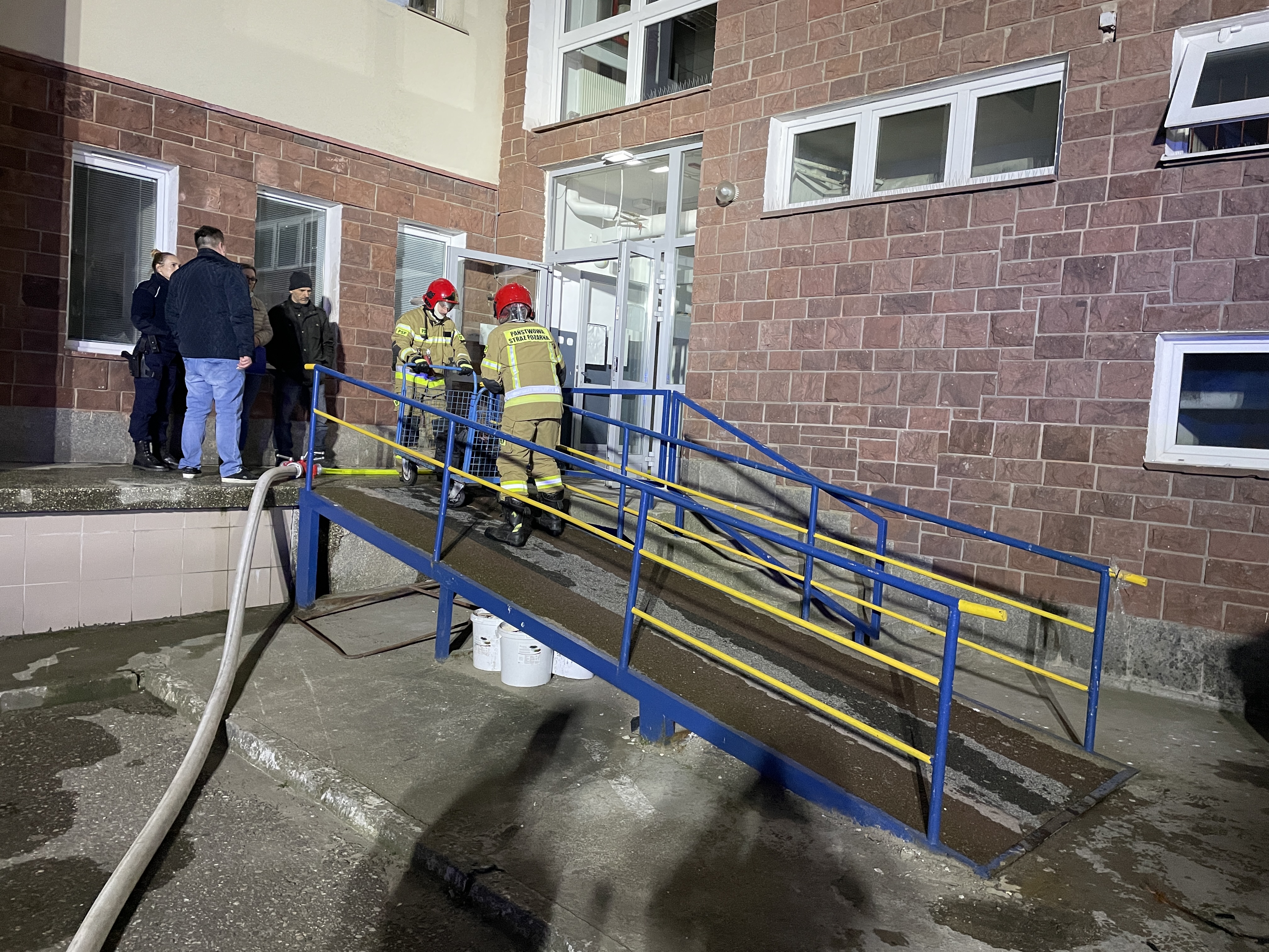 Po przybyciu na miejsce zdarzenia stwierdzono, że na poziomie "0" w części magazynowo-technicznej doszło do zadymienia. W obiekcie uruchomiony został alarm pożarowy oraz dzwiękowy system ostrzegawczy oraz prowadzona była ewakuacja pensjonariuszy przez personel obiektu. Zabezpieczono miejsce zdarzenia i odłączony został prąd w obiekcie. Strażacy w aparatach powietrznych, wyposażeni w linię gaśniczą, weszli do strefy zadymionej (korytarz), a następnie do pomieszczenia gdzie wybuchł pożar. Wewnątrz poza instalacjami elektrycznymi znajdowały się zestawy baterii (akumulatorów) UPS.Równolegle nadzorowano ewakuację osób przebywających w budynku. Ewakuacji poddano ok. 200 osób. Po ugaszeniu pożaru i przewietrzeniu, wszystkie kondygnacje powyżej oraz pomieszczenia obok miejsca zdarzenia zostały sprawdzone detektorem wielogazowym oraz kamerą. Miejsce zdarzenia zabezpieczyła Policja