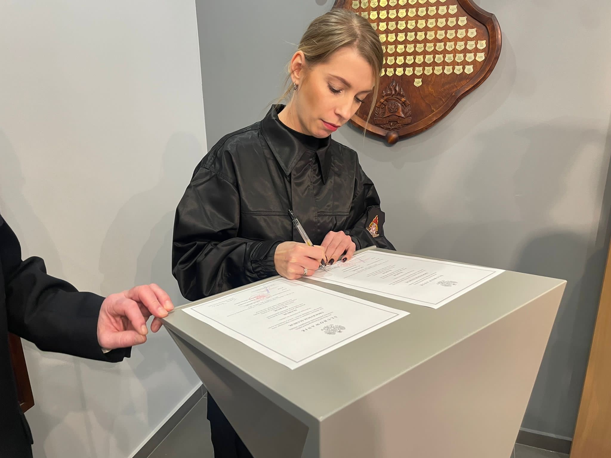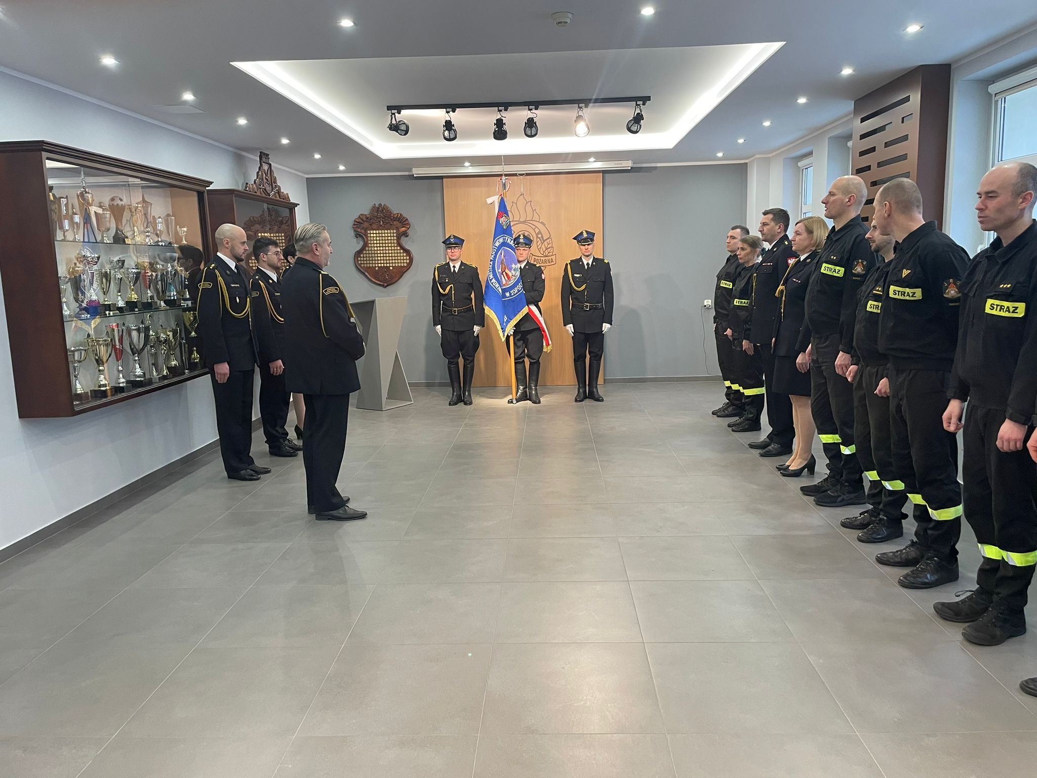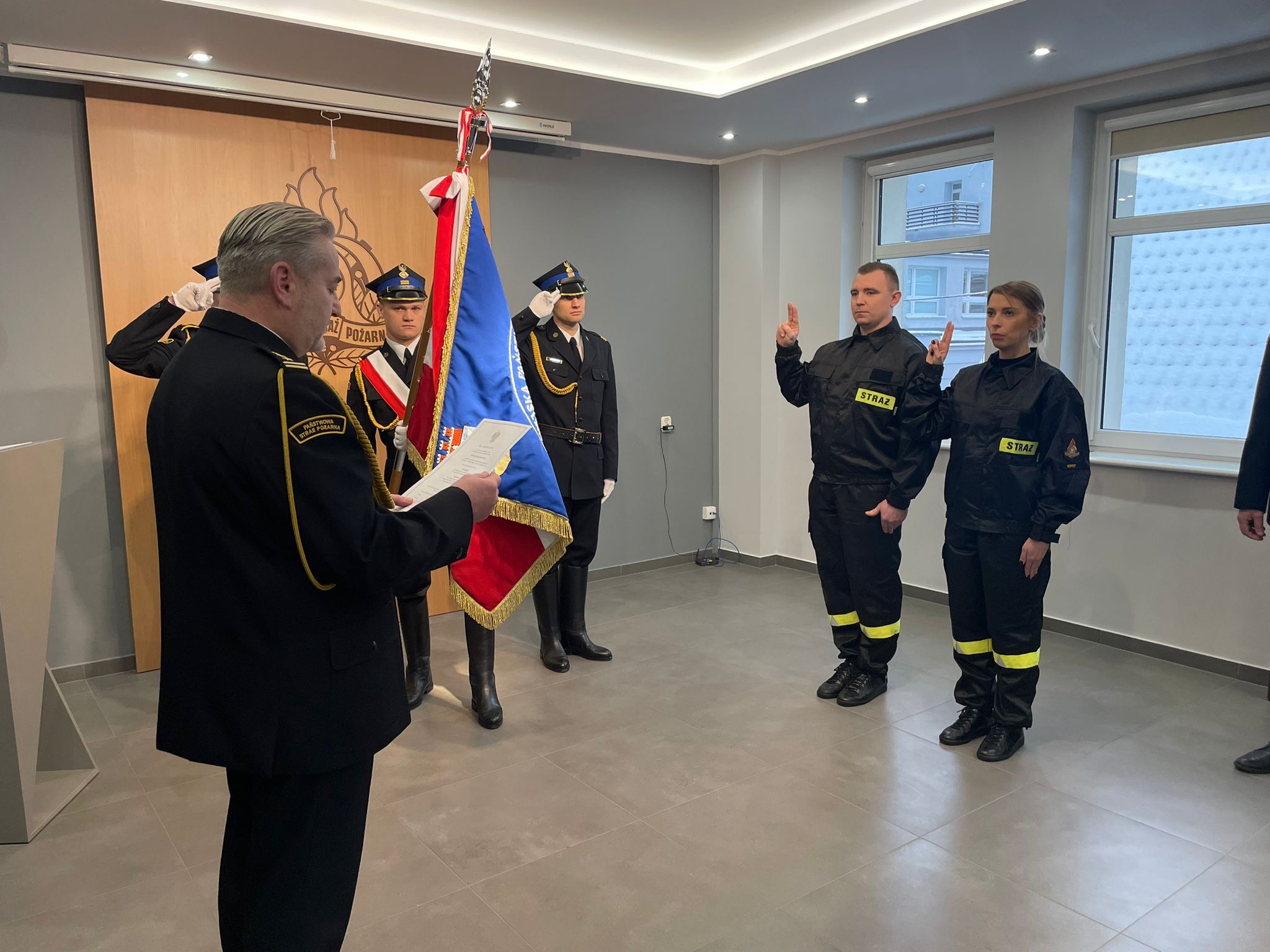 Uroczyste ślubowanie złożył jeden funkcjponariusz i jedna funkcjonariuszka, którzy zostali skierowani do odbycia szkolenia podstawowego w zawodzie strażak.