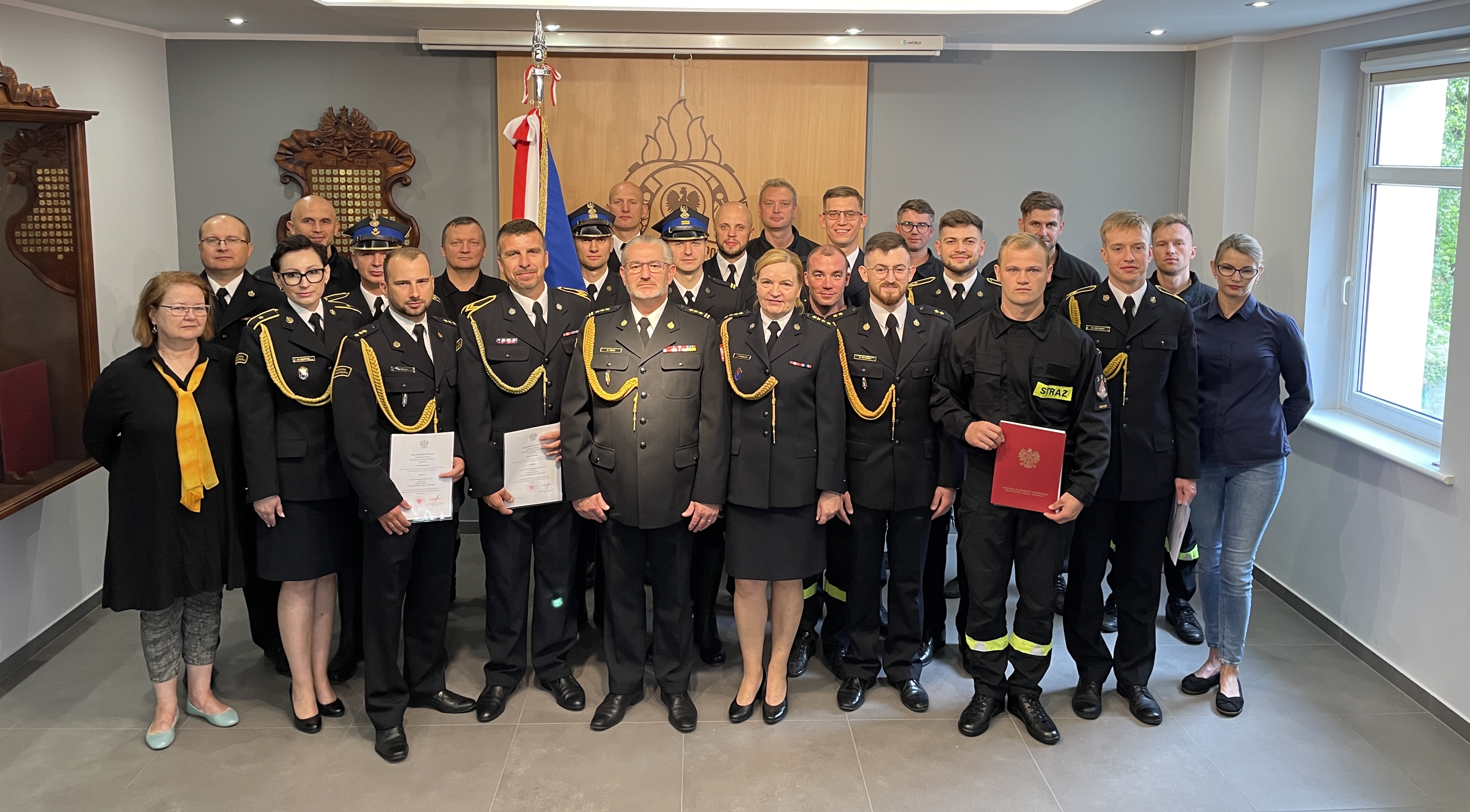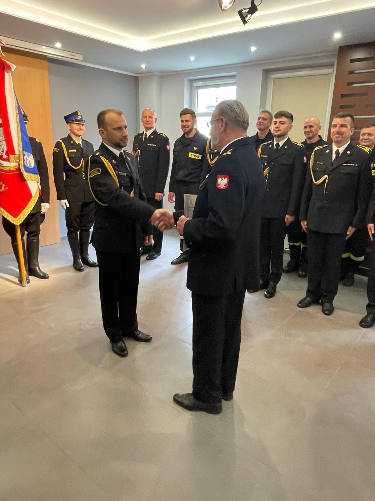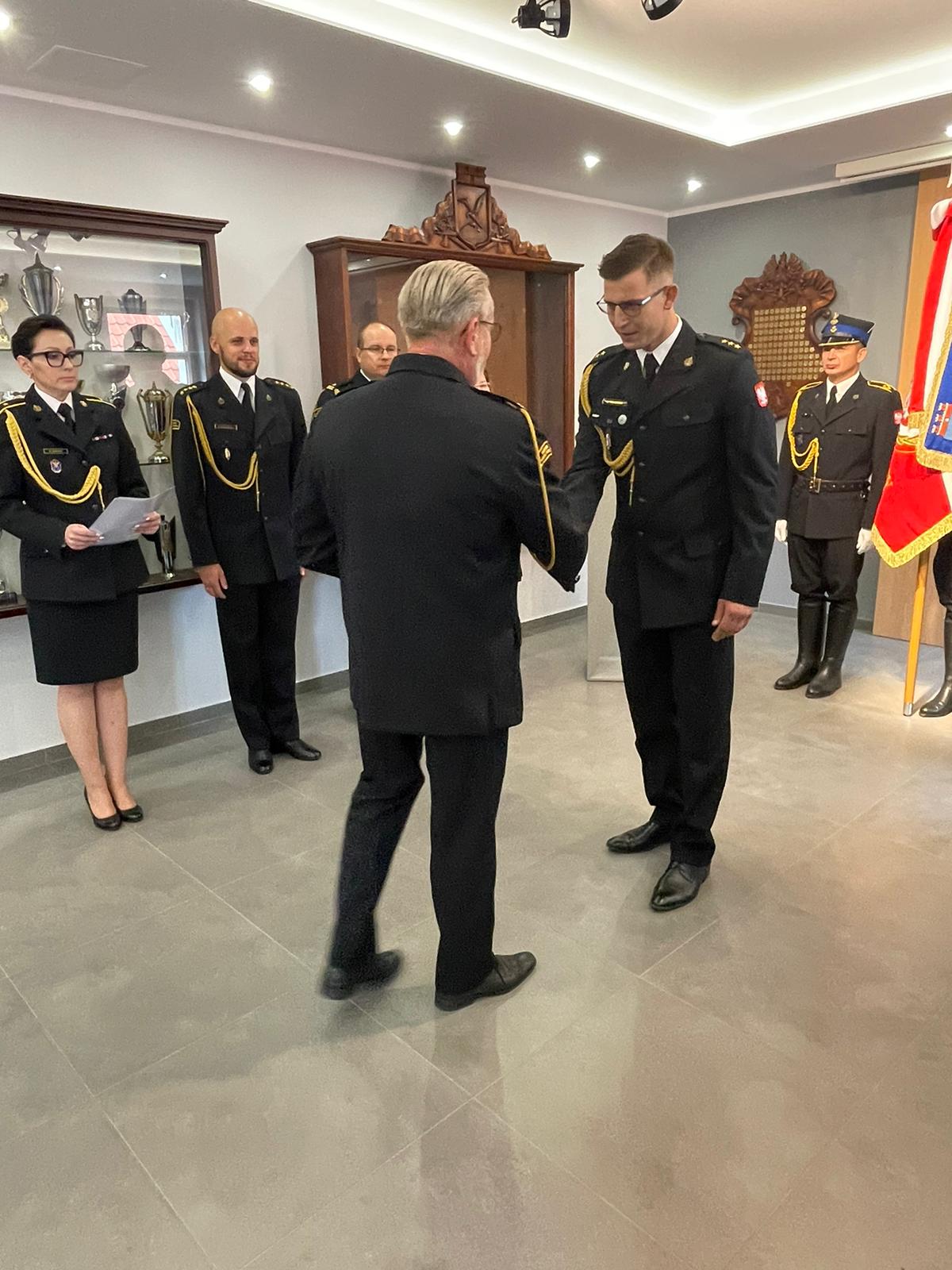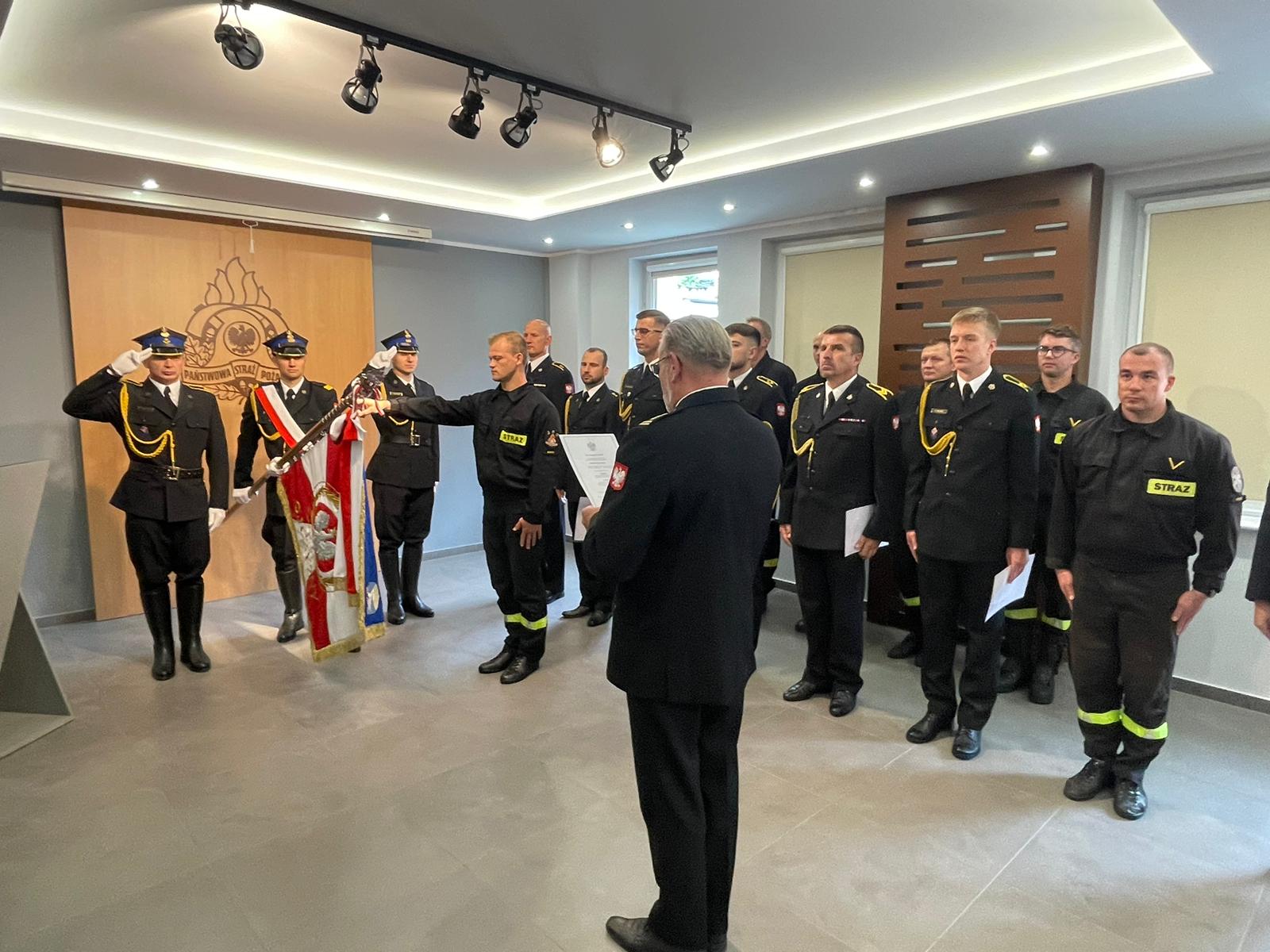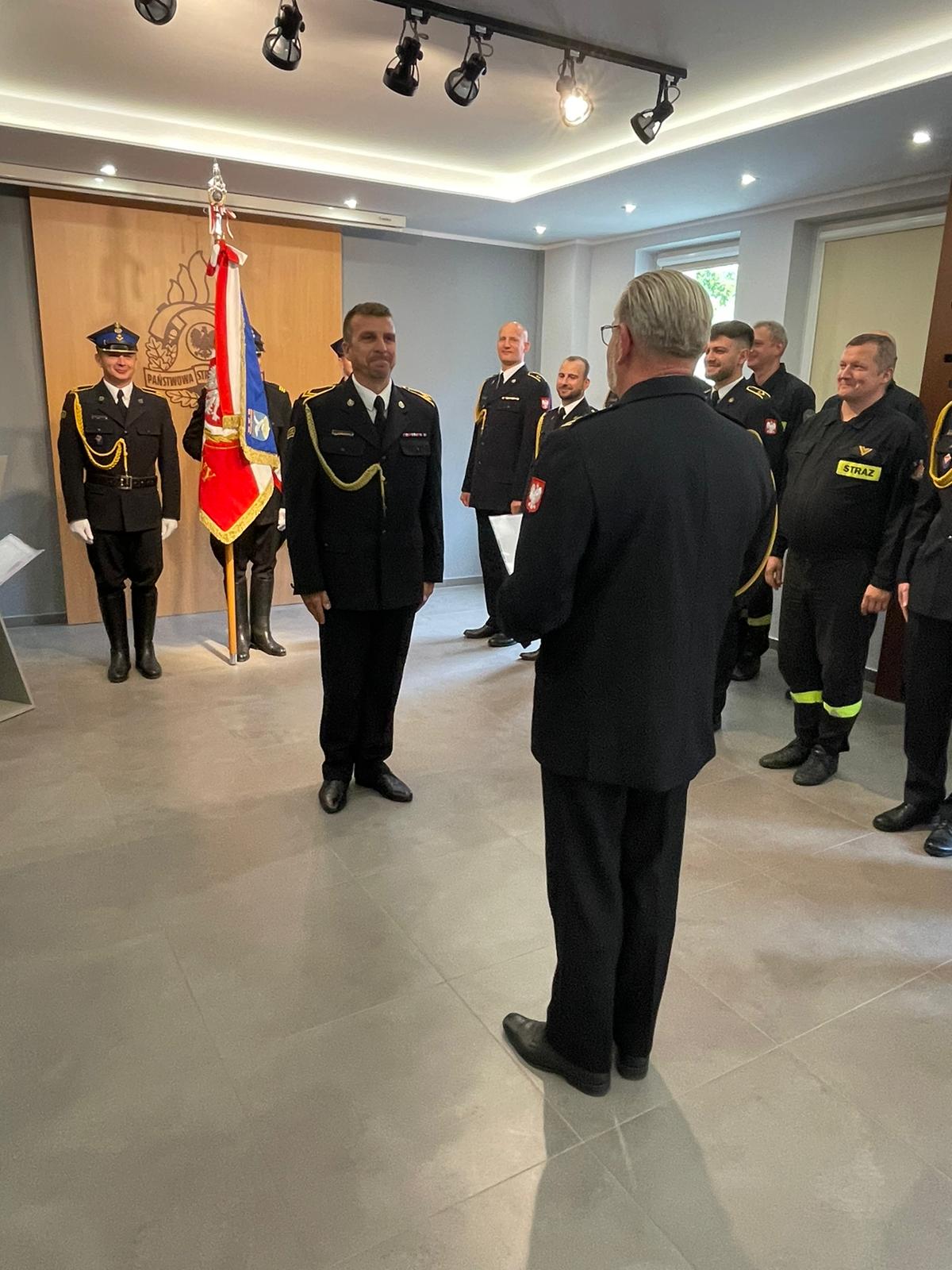 Komendant złożył nowym oraz awansowanym funkcjonariuszom gratulacje oraz życzył sukcesów zawodowych i satysfakcji z pełnienia dalszej służby w szeregach Państwowej Straży Pożarnej.