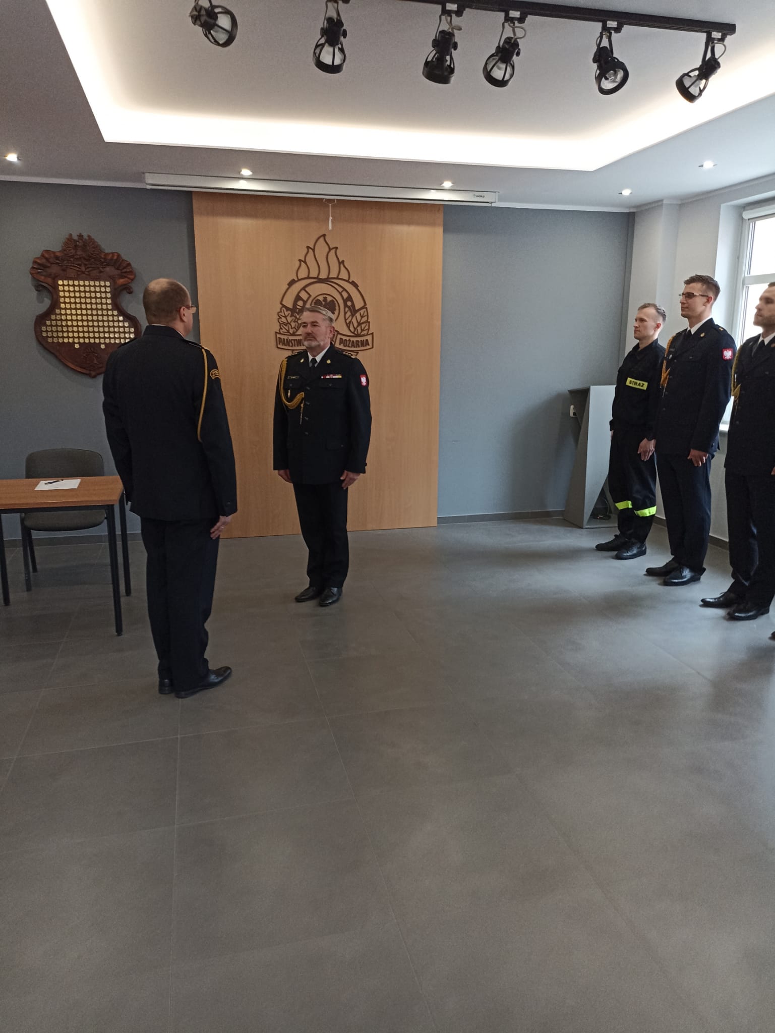 Komendant złożył nowemu funkcjonariuszowi gratulacje oraz życzył sukcesów zawodowych i satysfakcji z pełnienia służby w szeregach Państwowej Straży Pożarnej.