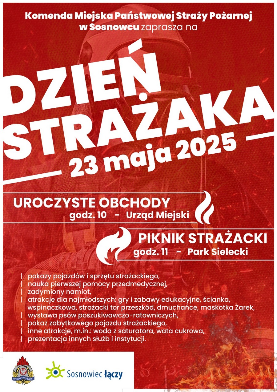 W dniu 23.05.2025 r. o godz. 10:00 na placu przed Urzędem Miejskim w Sosnowcu przy al. Zwycięstwa 20 odbędą się uroczyste obchody Dnia Strażaka 2025.