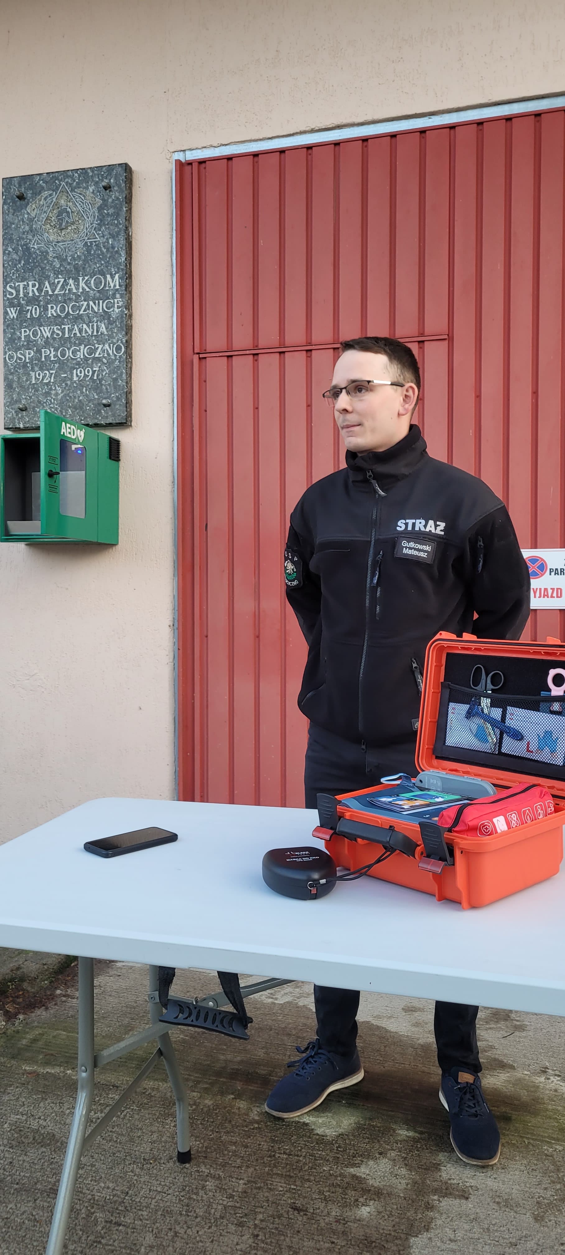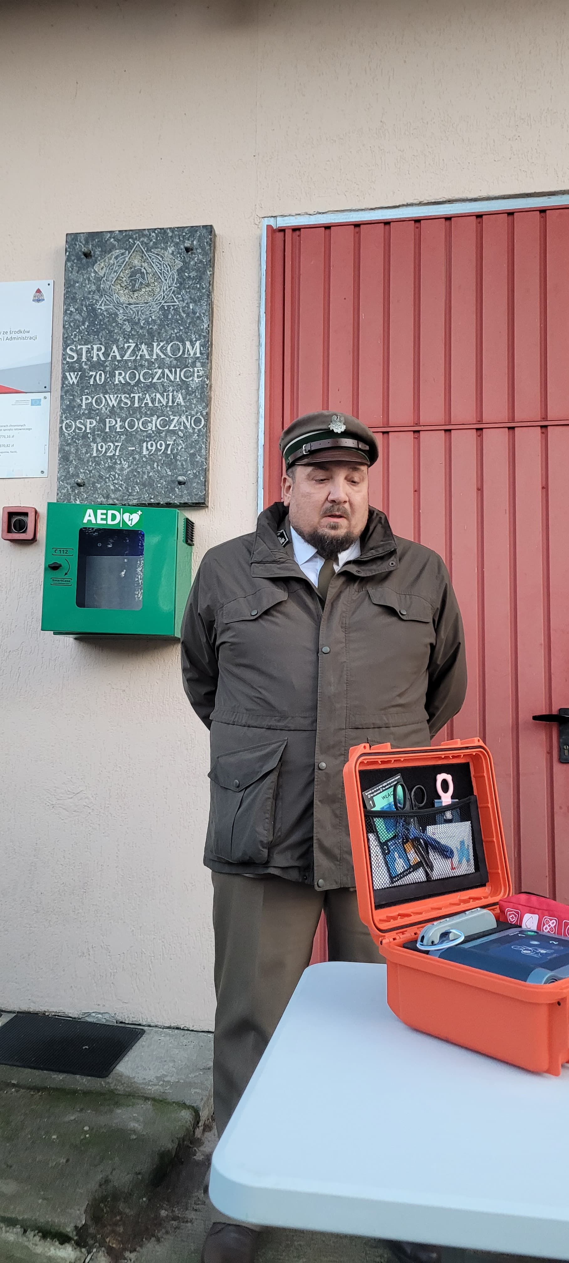 Prezes OSP w Płocicznie druh Stanisław Jurewicz podziękował wszystkim, którzy przyczynili się do zakupu AED, szczególnie sponsorom i darczyńcom, natomiast druh Mateusz Gutkowski szczegółowo omówił sposób postępowania użycia defibrylatora AED.