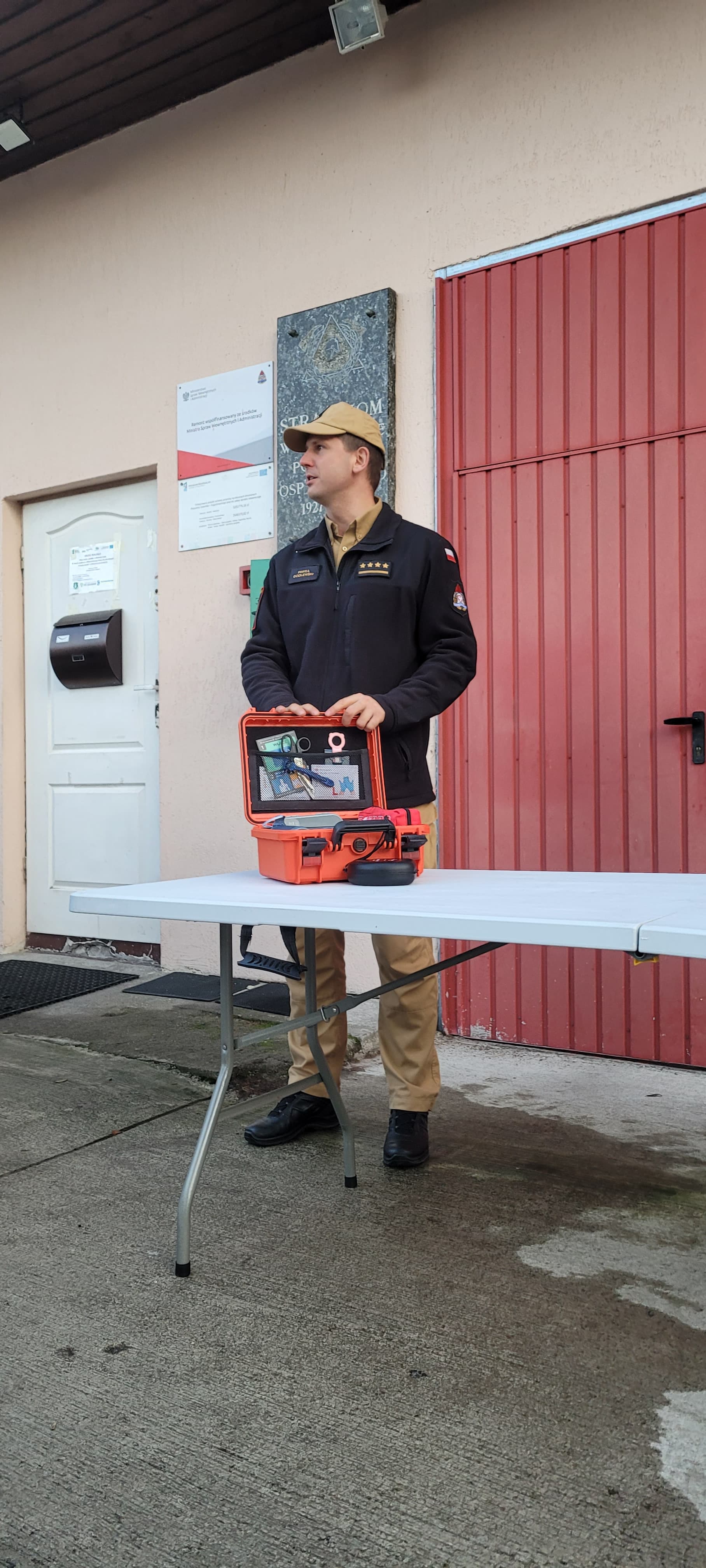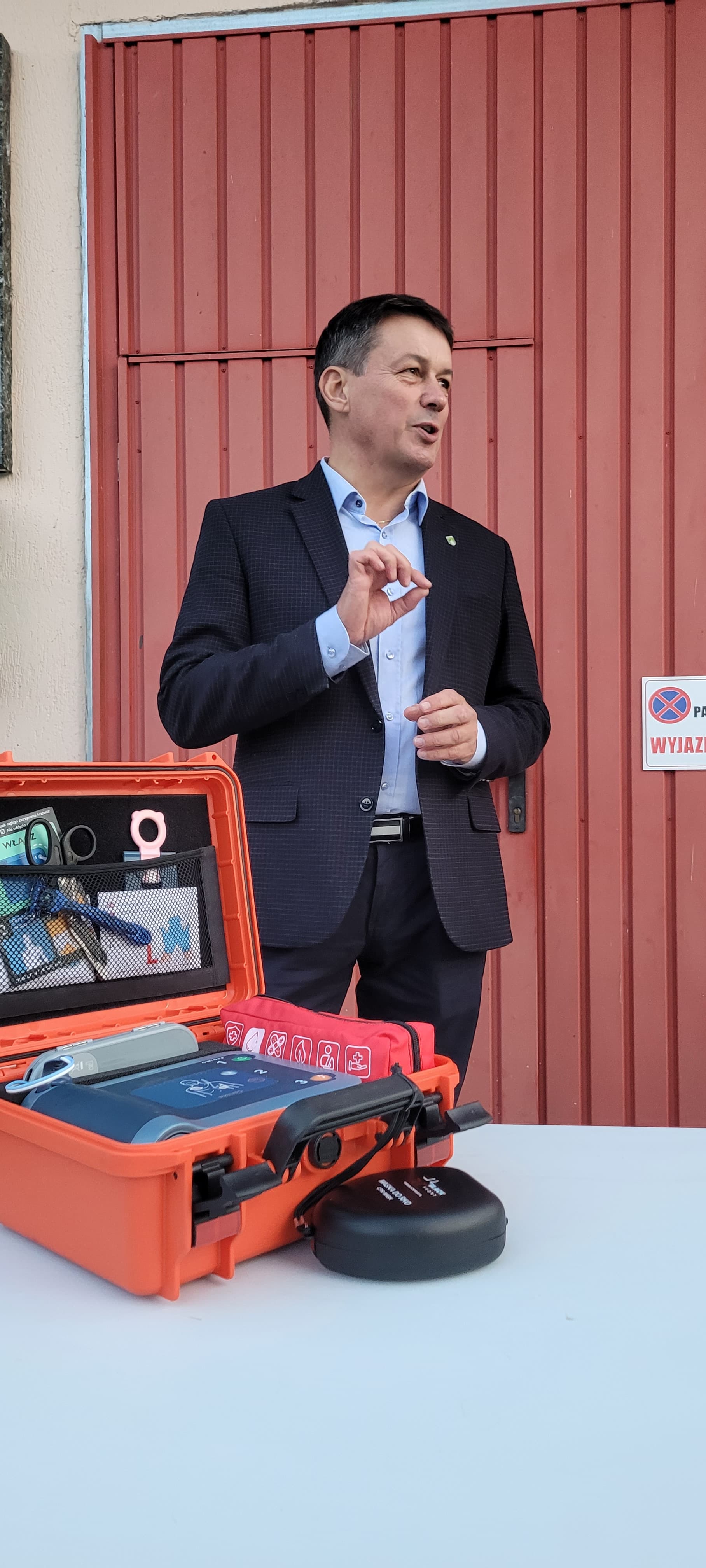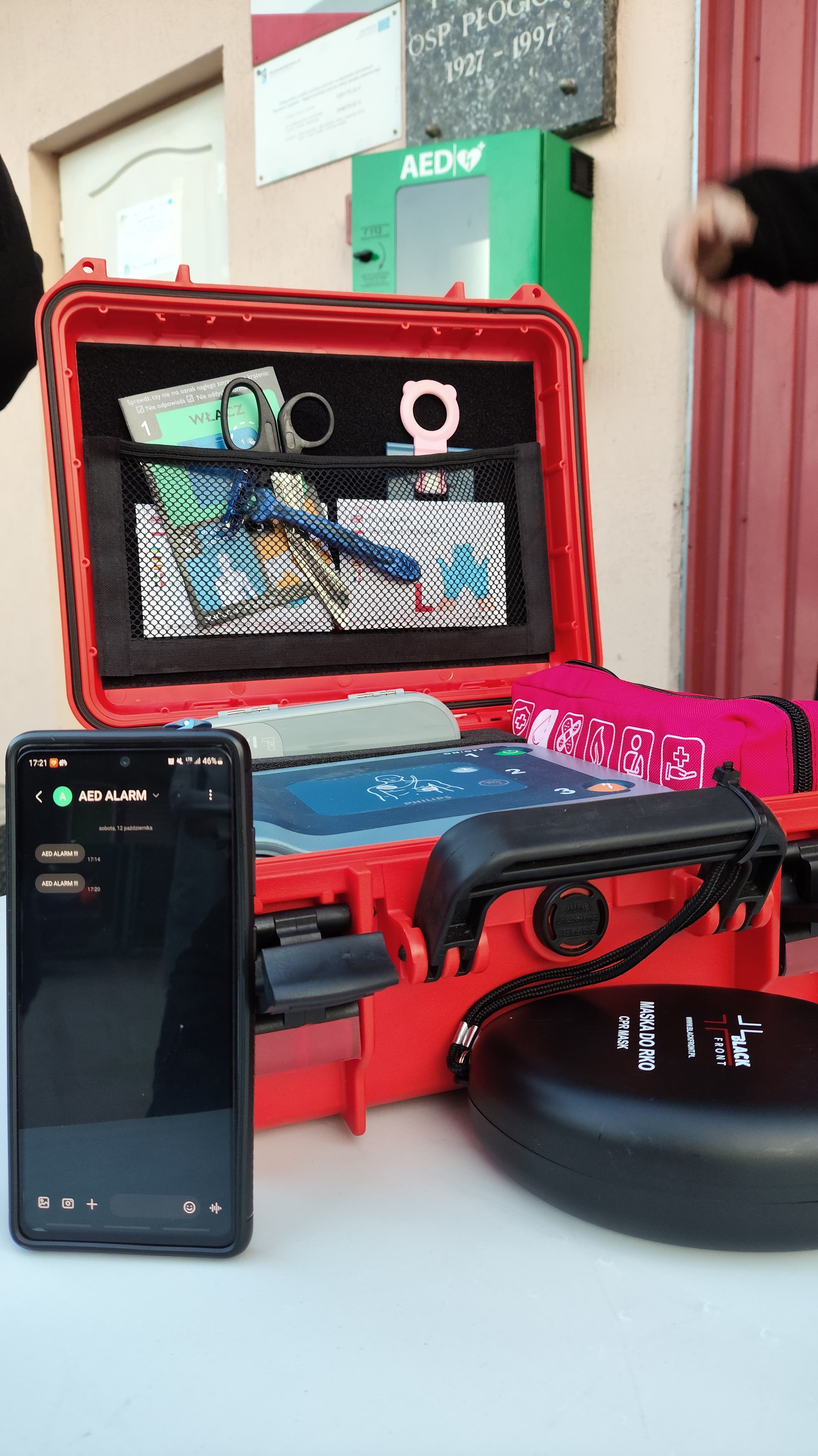 Defibrylator AED (Automatyczny Defibrylator Zewnętrzny) to sprzęt umożliwiający przeprowadzenie defibrylacji u osoby z zatrzymaniem akcji serca. Urządzenie to jest proste w obsłudze i wyposażone w system automatycznych komend głosowych, co sprawia, że może być używane nie tylko przez wyszkolonych ratowników, ale również przez osoby nieposiadające specjalistycznego wykształcenia medycznego. W sytuacji kryzysowej AED pozwala na szybkie rozpoczęcie akcji ratunkowej przed przyjazdem profesjonalnych służb medycznych. Z chwilą otwarcia skrzyni, w której znajduje się urządzenie natychmiast system alarmowy uruchamia syrenę oraz powiadamia druhów poprzez bramkę GSM.