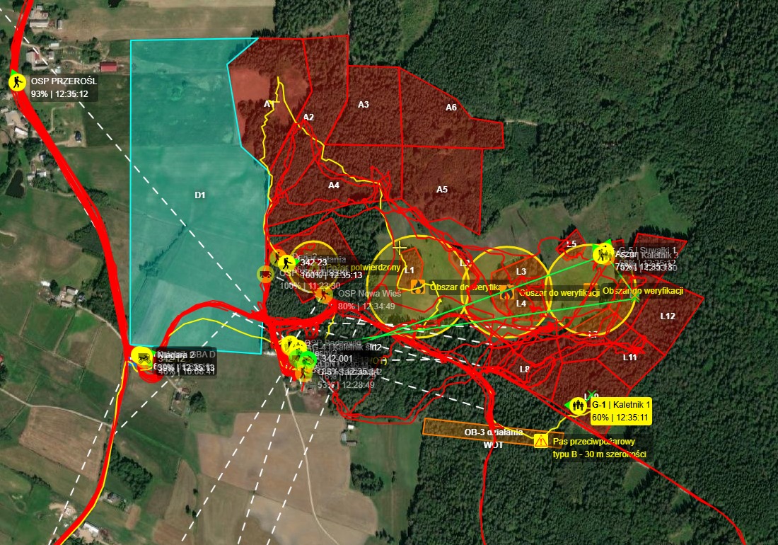 Teren akcji został podzielony na odcinki bojowe, co pozwoliło na sprawne kierowanie działaniami gaśniczymi oraz lepszą koordynację pracy poszczególnych zastępów. Do zarządzania siłami i środkami wykorzystano system wspomagania dowodzenia SIRON oraz samochód dowodzenia i łączności (SDŁ), co umożliwiło bieżącą analizę sytuacji i szybkie podejmowanie decyzji.