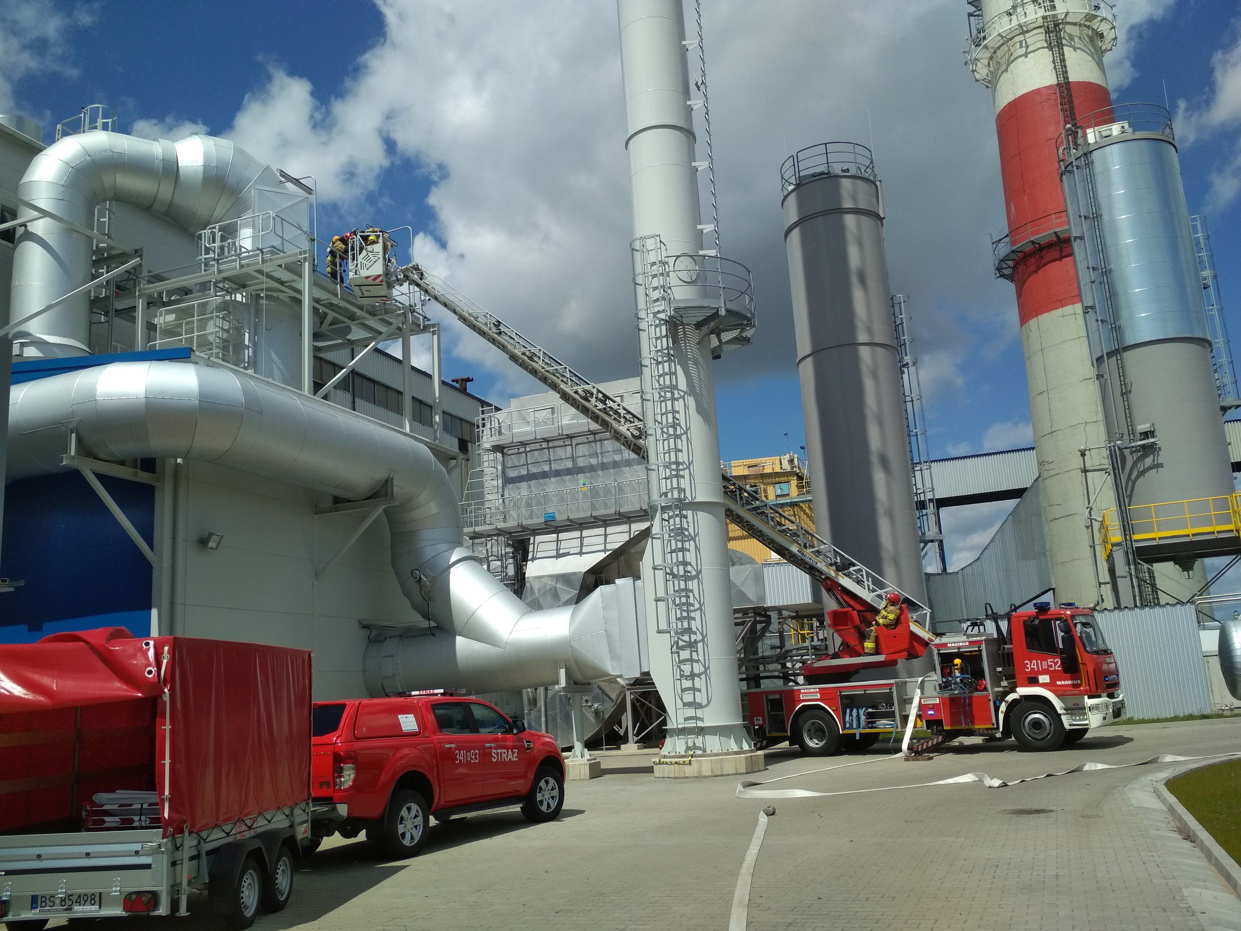 W dniach 24-26 maja 2021 roku odbył się cykl szkoleń na obiekcie Przedsiębiorstwa Energetyki Cieplnej w Suwałkach. Nasi strażacy dzięki uprzejmości pracowników zostali oprowadzeni po zakładzie, gdzie mieli okazję zapoznać się z całym procesem wytwarzania energii ze szczególnym uwzględnieniem zagrożeń jakie mogą występować na obiekcie. Szczególne zainteresowanie przyciągnął nowy budynek instalacji biomasy. Po części teoretycznej przeprowadzono ćwiczenie praktyczne polegające na podaniu jak największej ilości wody na plac składowy biomasy (organizacja zaopatrzenia wodnego) oraz ewakuacji z dachu hali produkcyjnej manekina przy użyciu drabiny mechanicznej. W ćwiczeniach oprócz zastępów z JRG nr 1 i JRG nr 2 uczestniczyli również druhowie z OSP w Płocicznie.