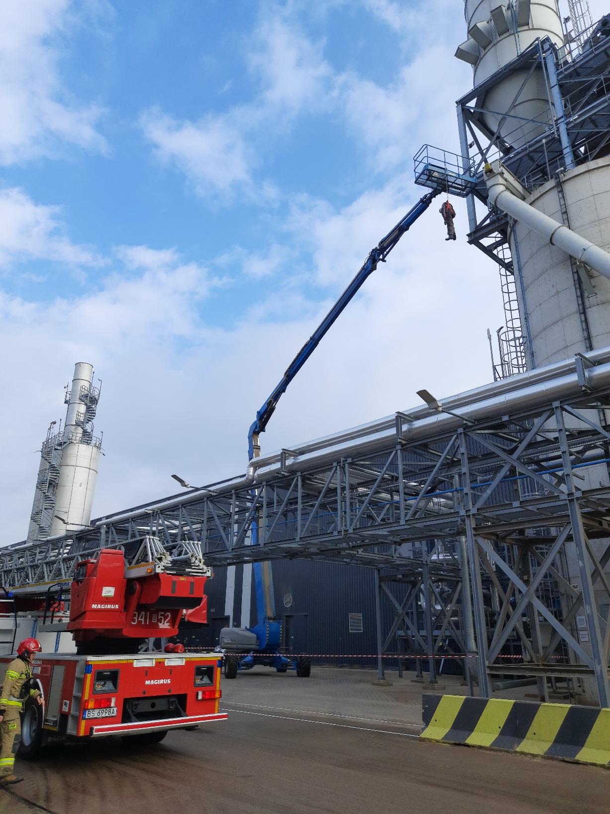 pracującej na wysokości z kosza podnośnika samojednego. W ćwiczeniach uczestniczyły siły i środki z Jednostki Ratowniczo – Gaśniczej Nr 1 i Nr 2 w Suwałkach oraz Ochotnicza Straż Pożarna TANNE i OSP w Płocicznie. Organizatorem ćwiczeń była Komenda Miejska PSP