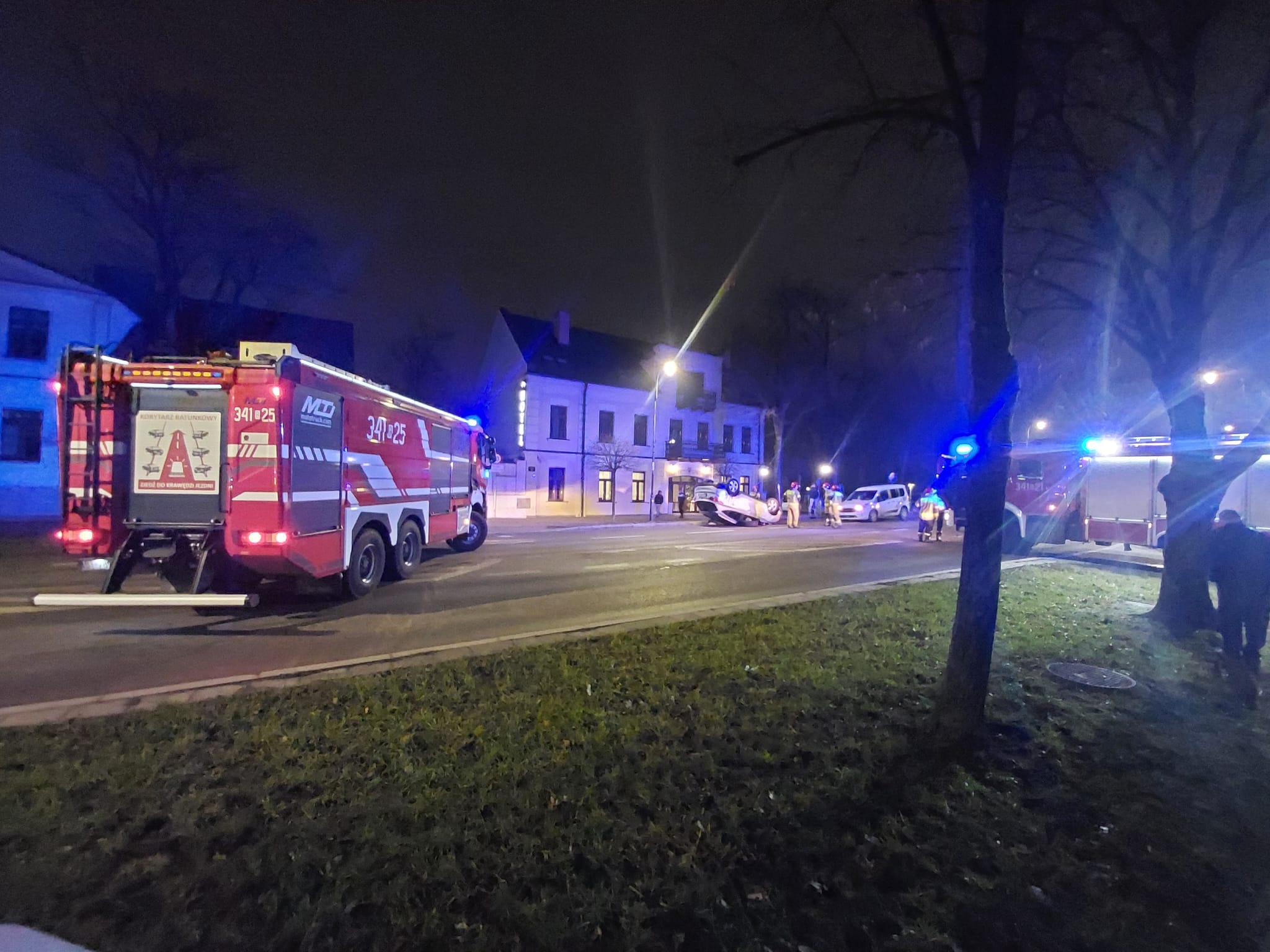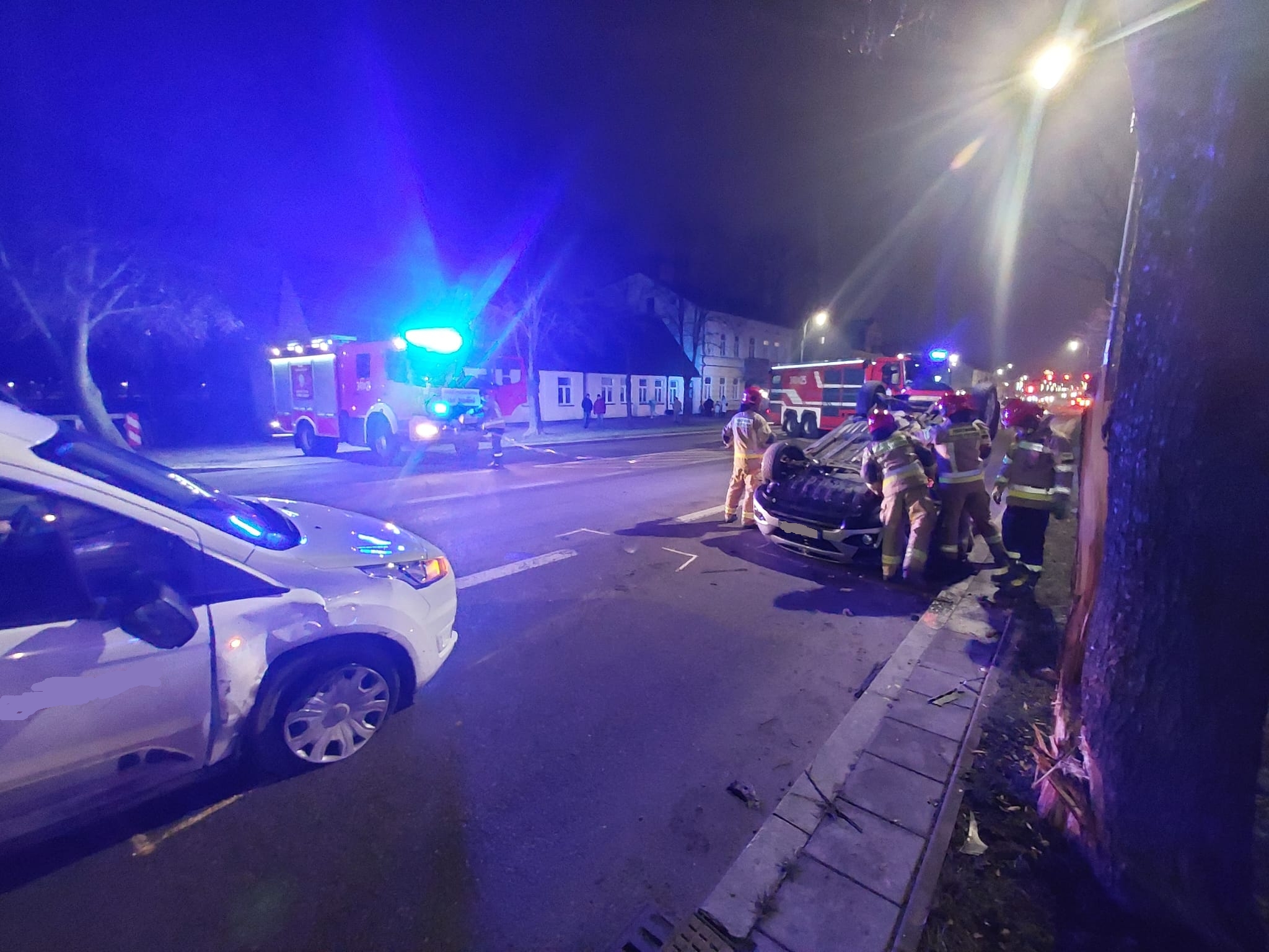 W wyniku zderzenia dwóch samochodów osobowych na skrzyżowaniu, kierująca pojazdem straciła panowanie nad pojazdem, co doprowadziło do uderzenia w drzewo i dachowania. Pojazd został zastany przez służby w pozycji na dachu z uwięzioną osobą poszkodowaną w środku.