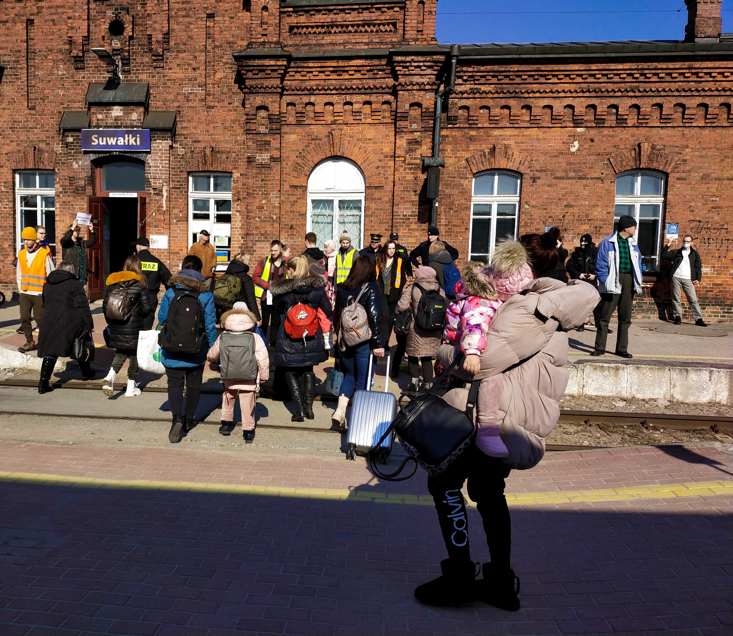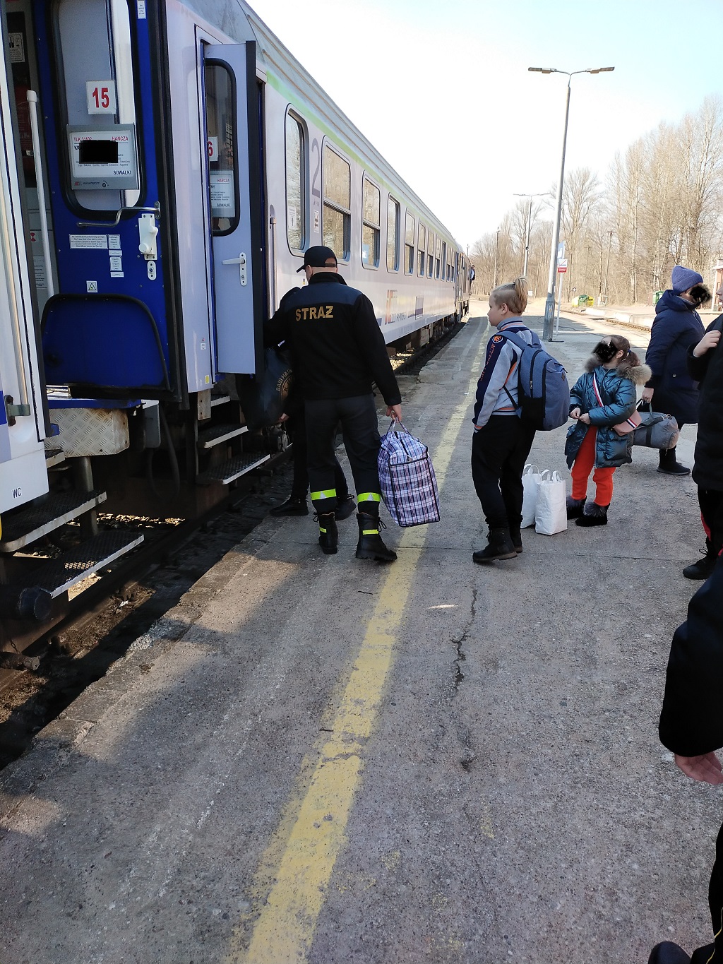 Podróżujący obywatele Ukrainy w poszukiwaniu schronienia przemieszczające się na teren RP Polskimi Kolejami Państwowymi. Po przyjeździe do Suwałkach trafiają do tymczasowego punktu informacyjnego na dworcu PKP. Strażacy wraz z innymi służbami i wolontariuszami pomagają w wysiadaniu z wagonów matkom z dziećmi i transporcie bagaży do poczekalni dworca. Podróżujący mają zapewnione ciepłe napoje i przekąski w poczekalni, gdzie rozdawane są przez wolontariuszy. W dalszej kolejności po rozpoznaniu ile osób pozostaje, a ile chce podróżować dalej na teren Litwy, organizowany jest transport przez Państwową Straż Pożarną. Pozostałe osoby mają zapewniony nocleg w tymczasowym punkcie pobyru w obiekcie Ośrodka Sportu i Rekreacji w Suwałkach przy ul. Wojska Polskiego 2, gdzie są przewożeni autobusem miejskim oraz transportem tut. Komendy.
