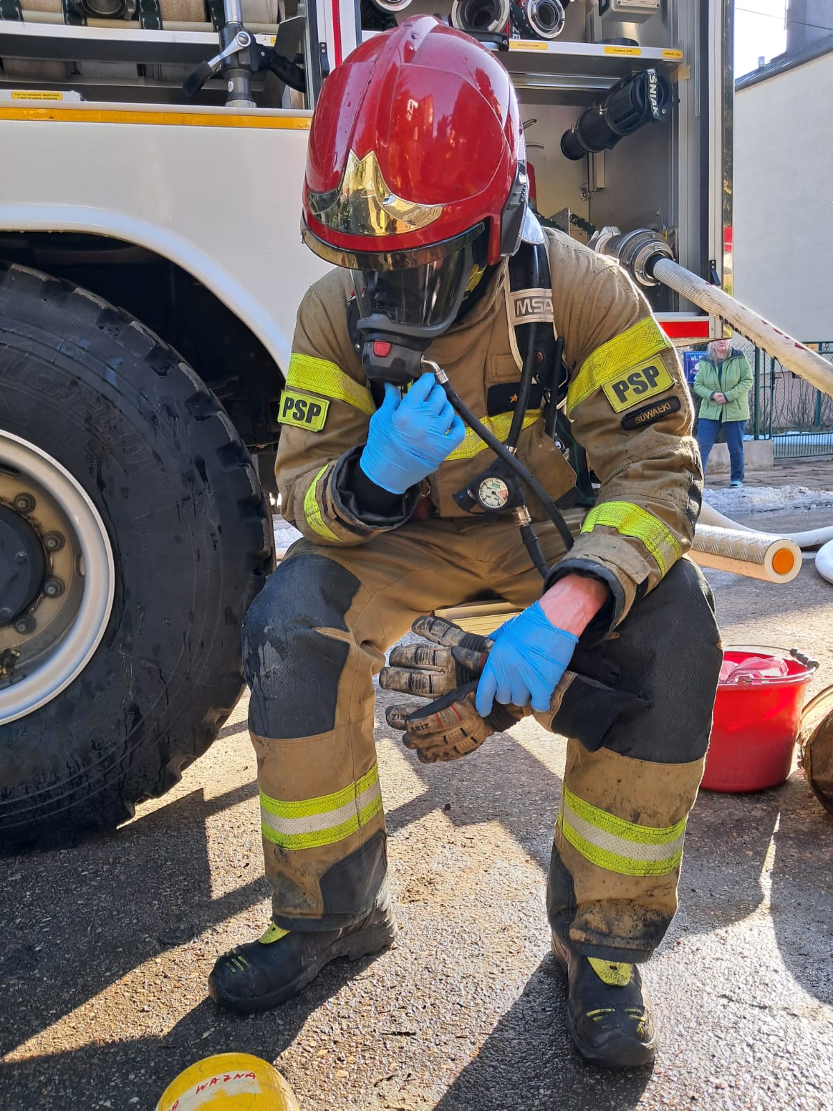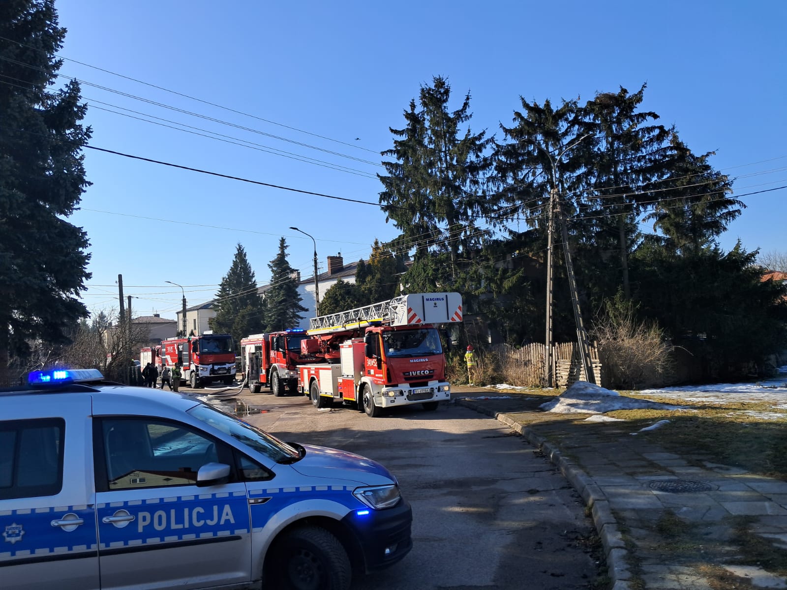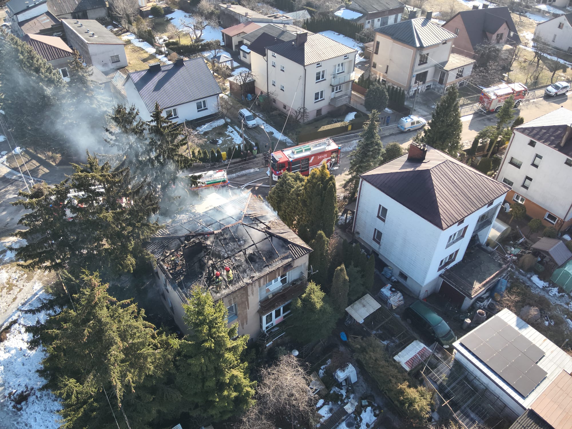 Przed przybyciem strażaków na miejsce dotarł patrol Policji, który pomógł czterem domownikom bezpiecznie opuścić budynek. Były to osoby w wieku 65, 65, 32 oraz 96 lat. Najstarsza z nich została ewakuowana na wózku inwalidzkim. Wszystkie osoby zostały przebadane przez zespół ratownictwa medycznego i nie wymagały hospitalizacji.