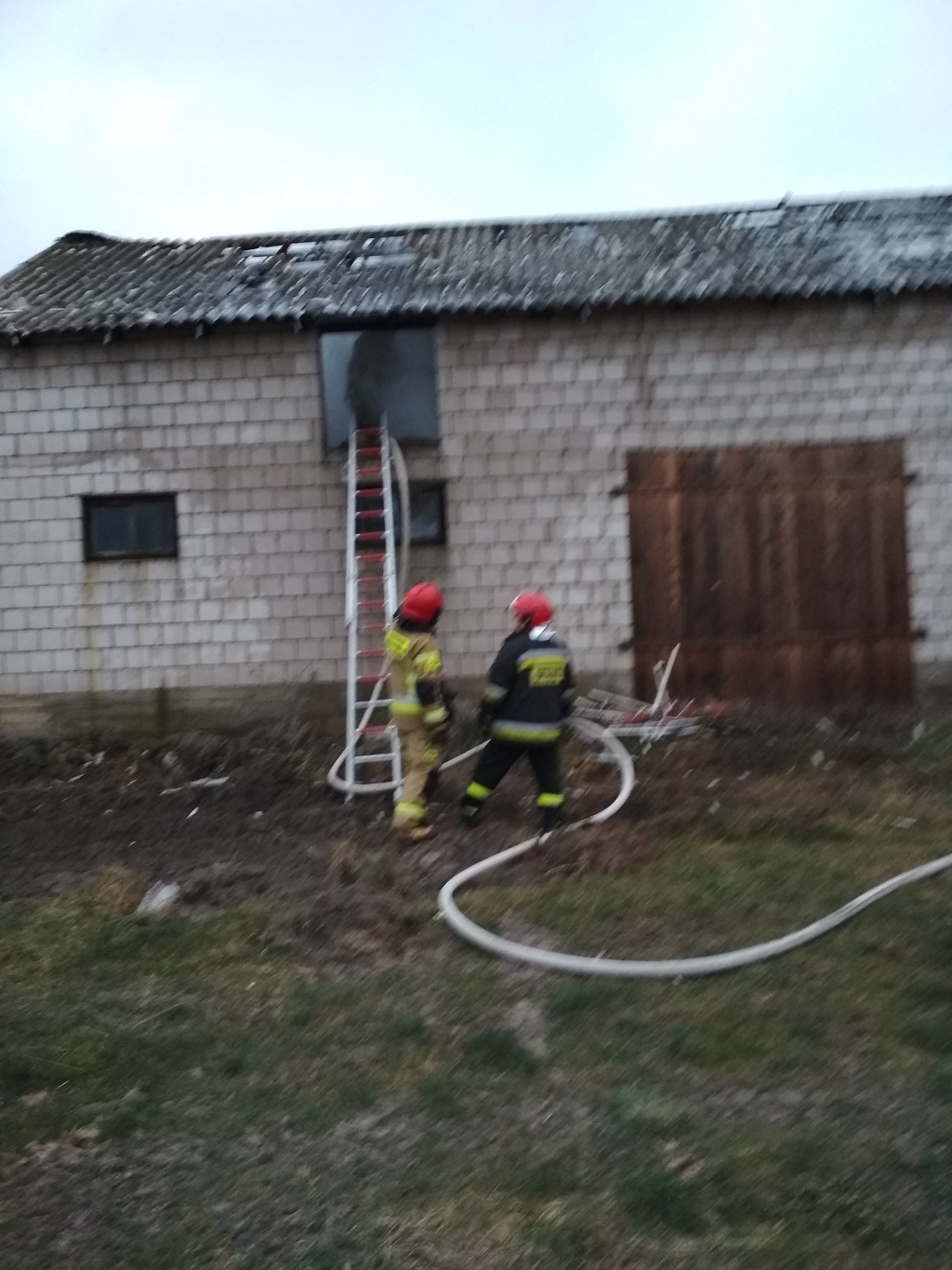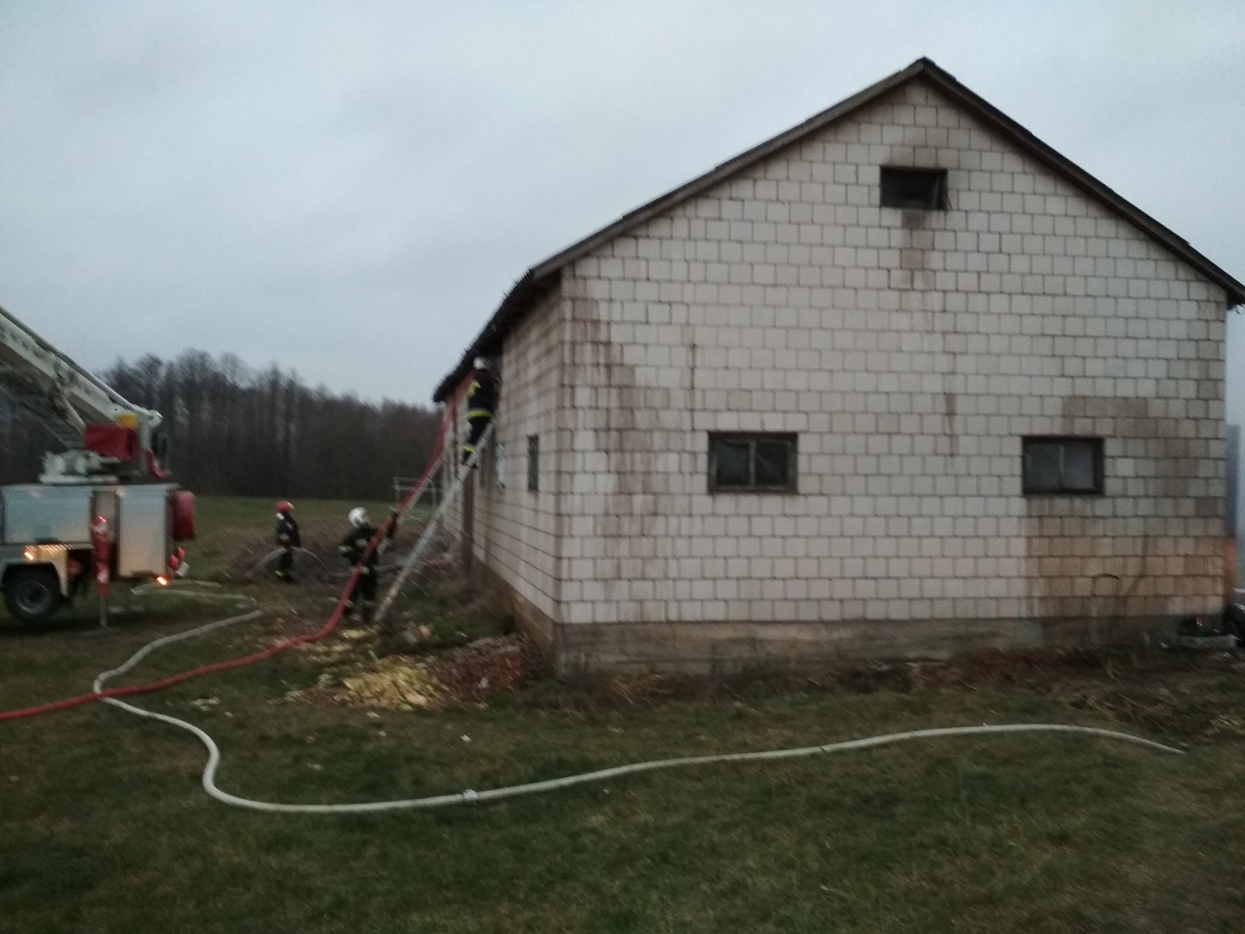 Po dojechaniu na miejsce zdarzenia pierwszych zastępów stwierdzono, że pożarem objęte jest poddasze budynku gospodarczego. W trakcie dalszego rozpoznania ustalono, iż na dolnym i górnym poziomie obiektu znajduje się słoma. Działania straży pożarnej