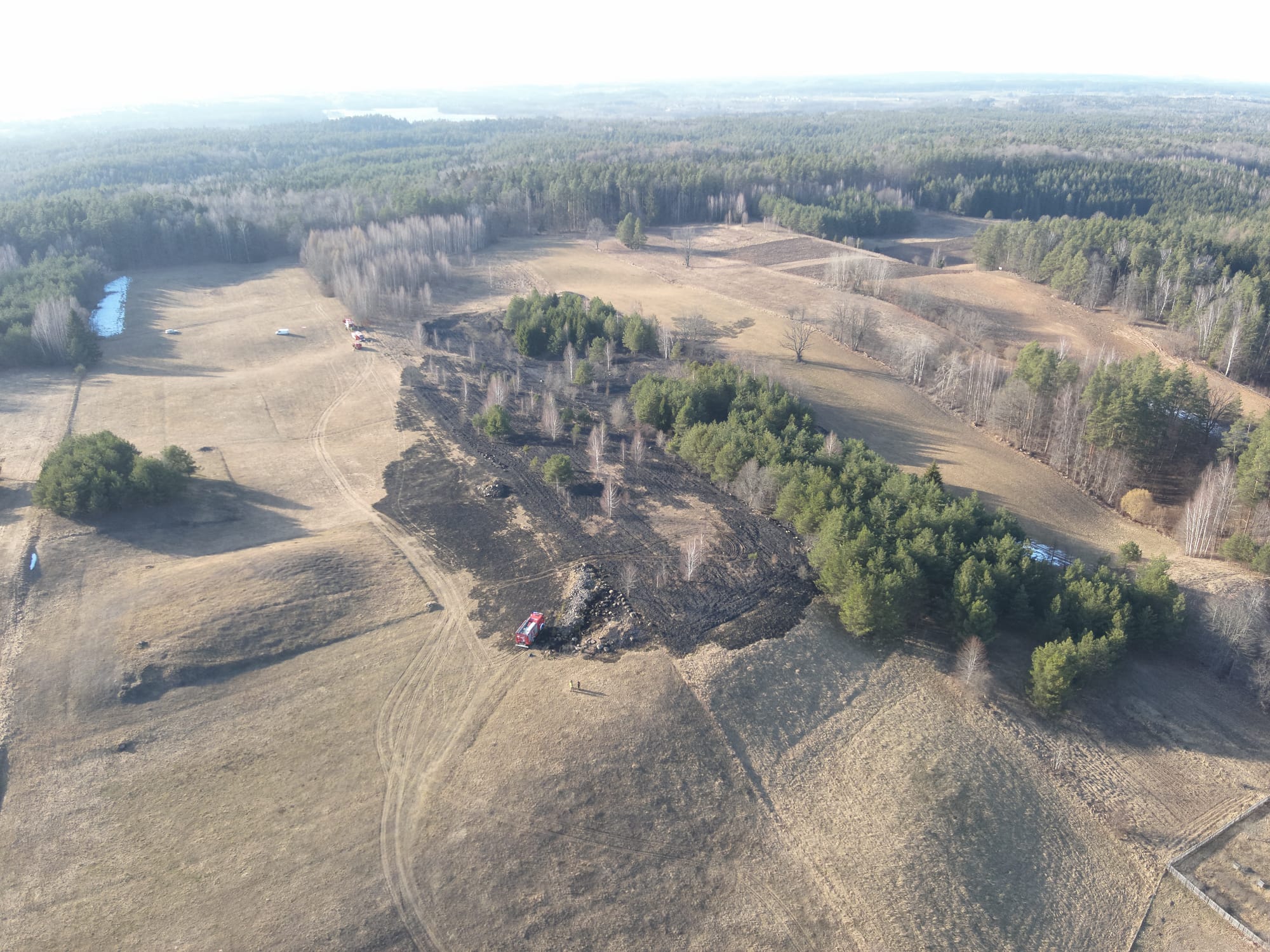 W ostatnim czasie odnotowaliśmy kolejne groźne zdarzenie związane z pożarem terenów zielonych. W dniu 16.03.2026 roku o godzinie 14:11 wpłynęło zgłoszenie do Stanowiska Kierowania Komendanta Miejskiego PSP w Suwałkach o pożarze traw w miejscowości Leszczewek, pożar rozprzestrzeniał się w kierunku Wigierskiego Parku Narodowego. Na miejscu interwencji strażacy zastali rozwinięty pożar suchej trawy oraz młodnika sosnowo-świerkowego. Ogień objął obszar około 4 hektarów, niszcząc poszycie leśne oraz młode drzewa. Gałęzie starszych drzew zostały nadpalone nawet do wysokości jednego metra.