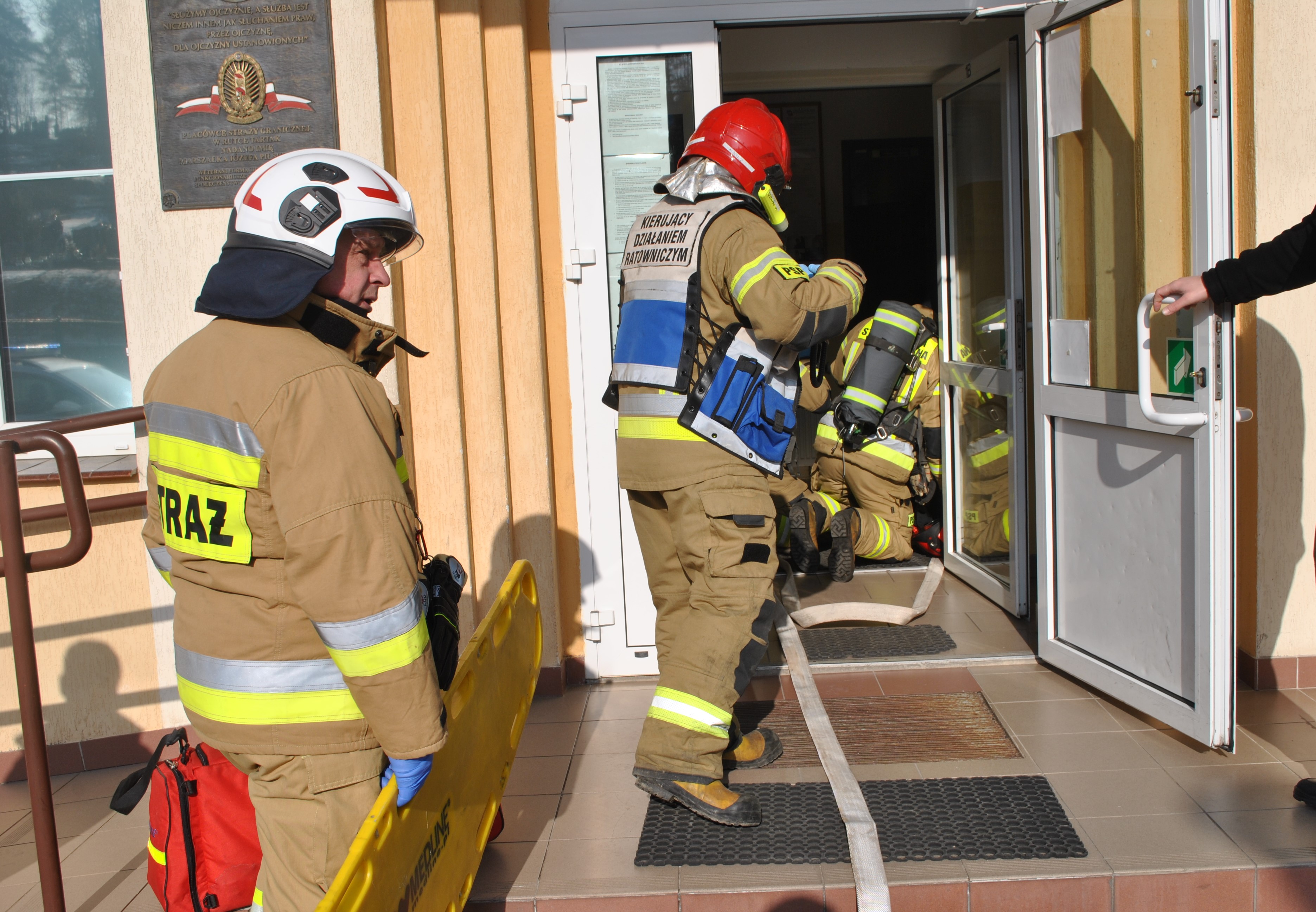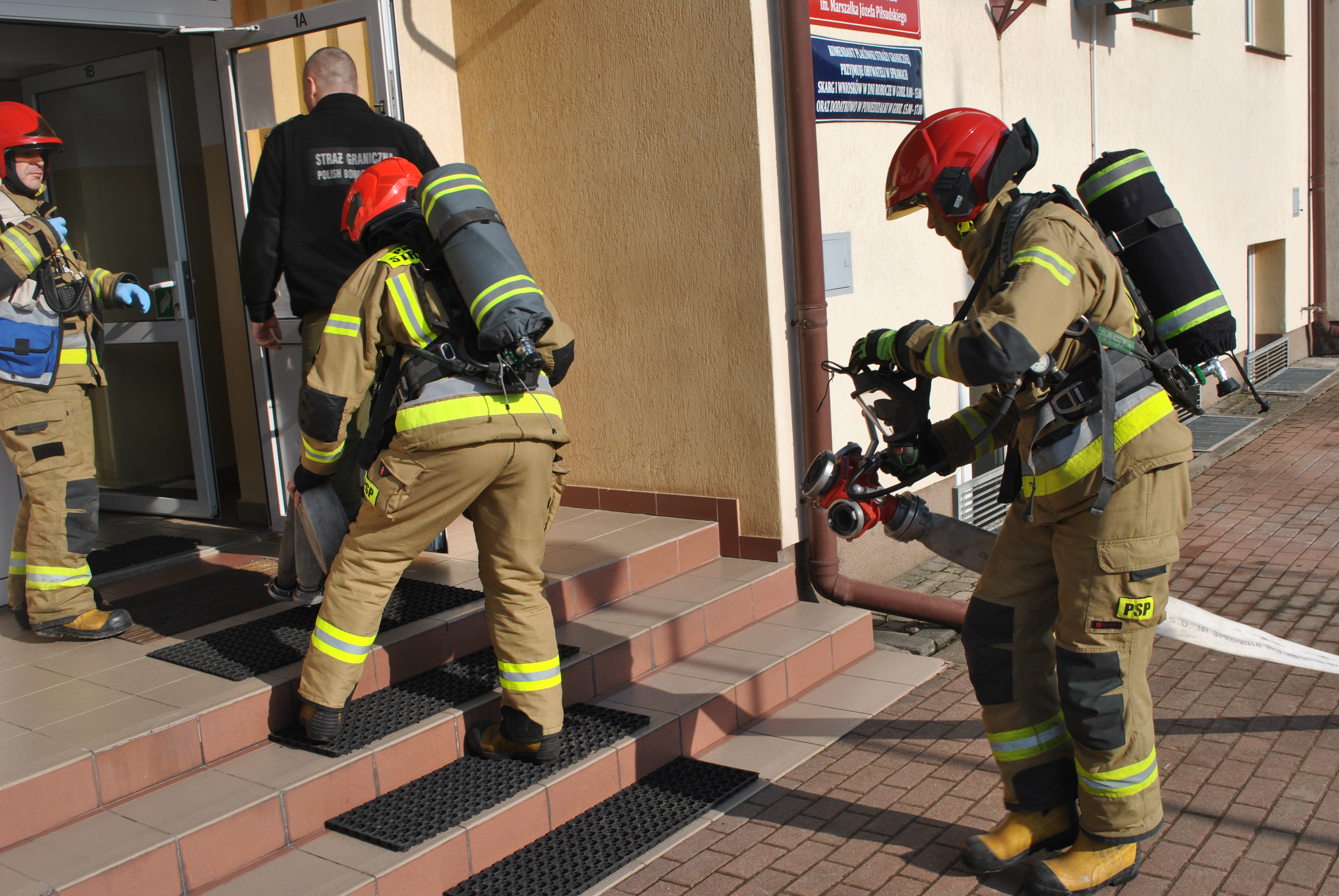 W dniu 25 lutego 2025 r. na terenie Placówki Straży Granicznej w Rutce-Tartak odbyły się ćwiczenia, w których udział brali funkcjonariusze Straży Granicznej, strażacy z Jednostki Ratowniczo Gaśniczej nr 2 w Suwałkach oraz druhowie Ochotniczej Straży Pożarnej z Rutki-Tartak. Ćwiczenia miały na celu sprawdzenie warunków ewakuacji z budynku placówki SG w sytuacji zagrożenia pożarowego oraz współpracę pomiędzy ww. służbami. Wszystkie działania zostały zrealizowane pomyślnie. Dziękujemy wszystkim za aktywny udział w ćwiczeniach.