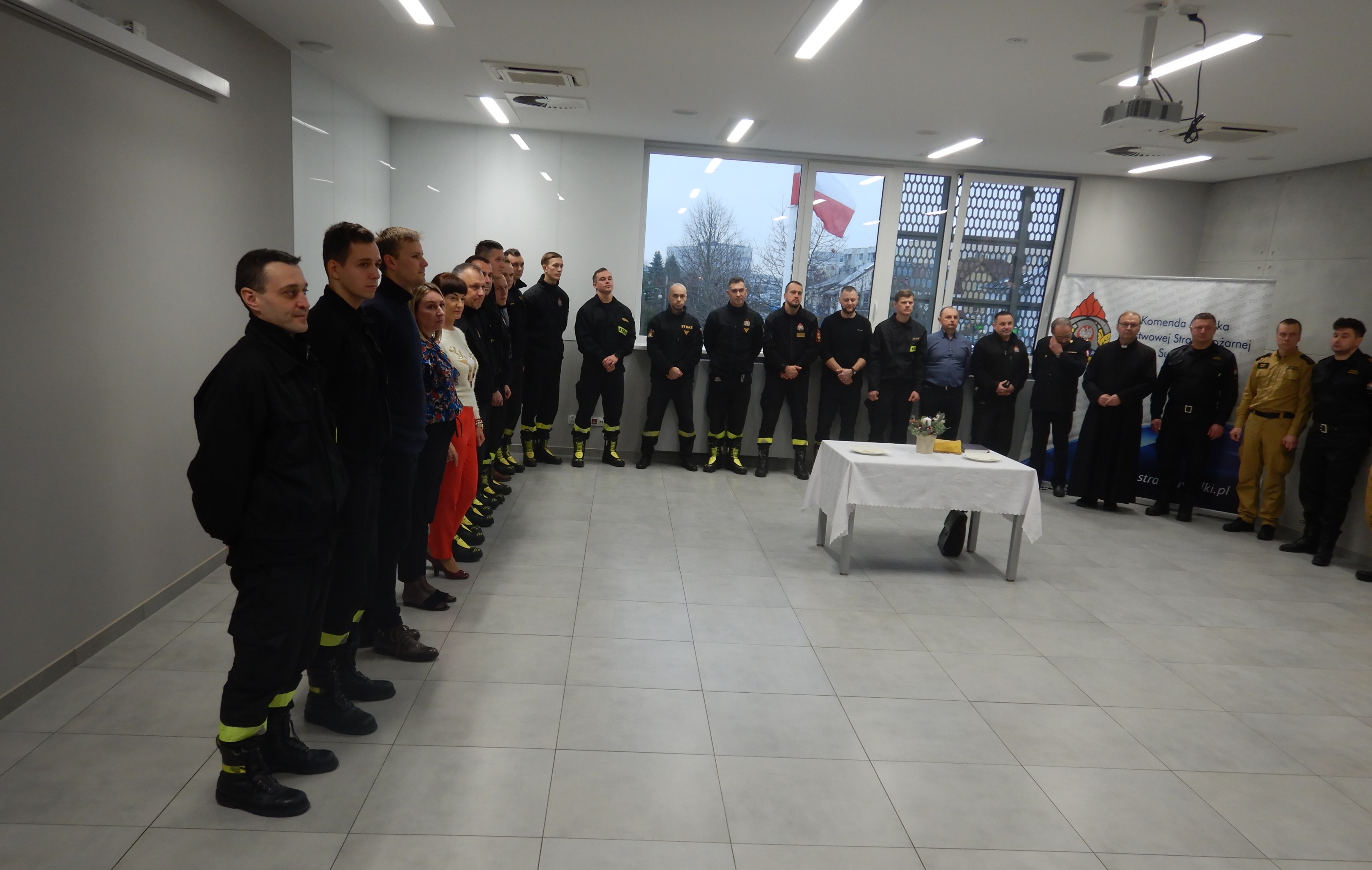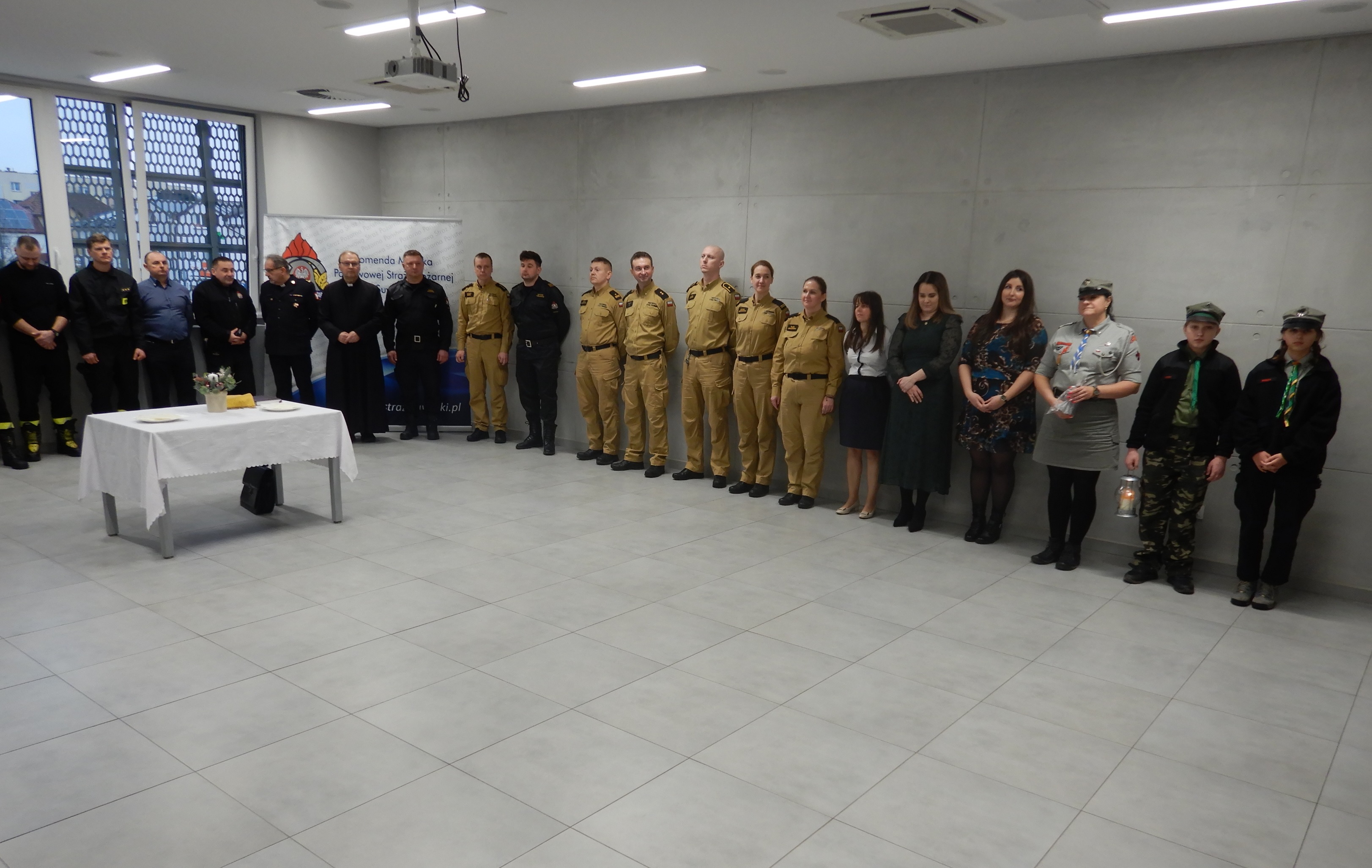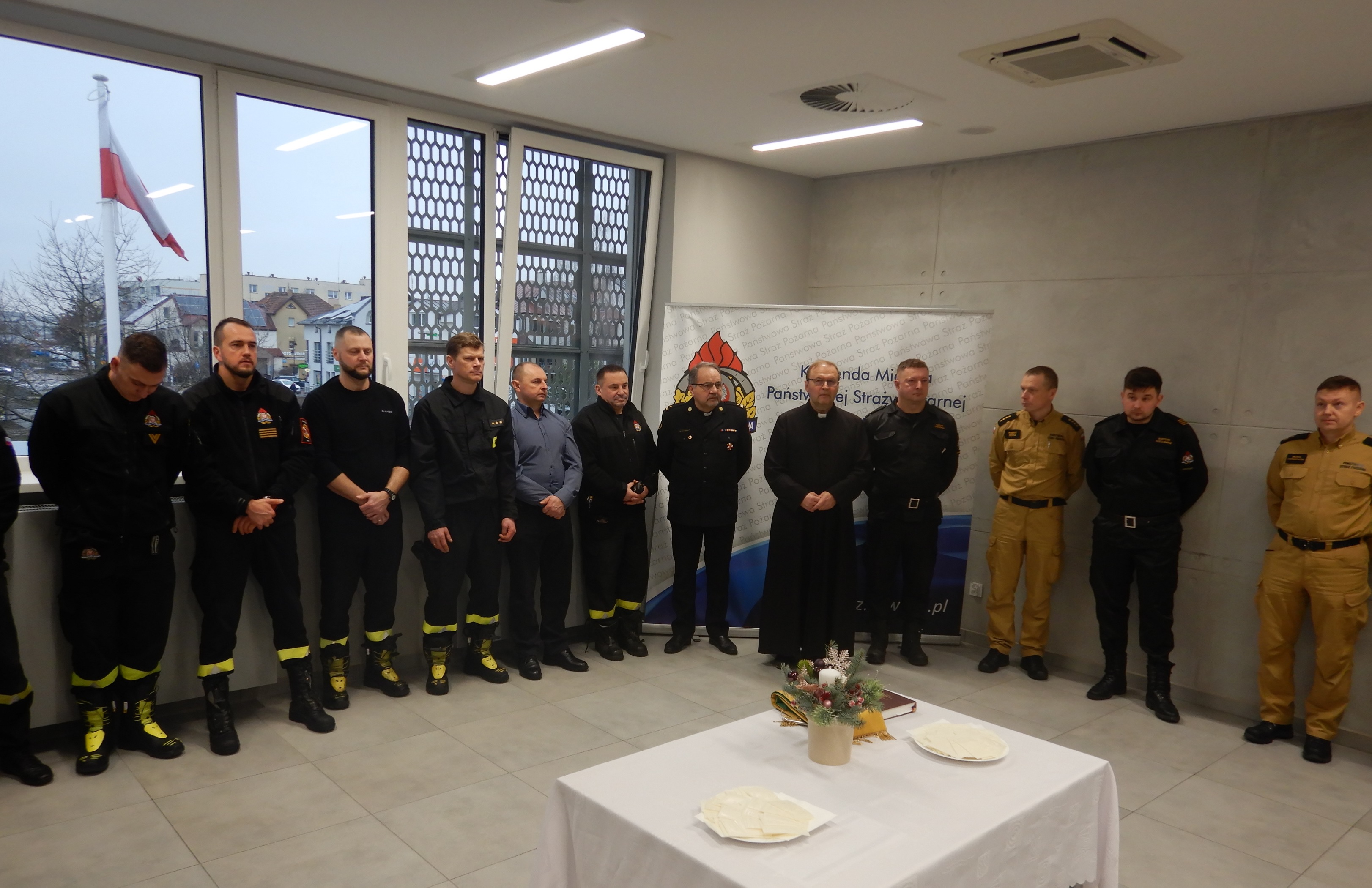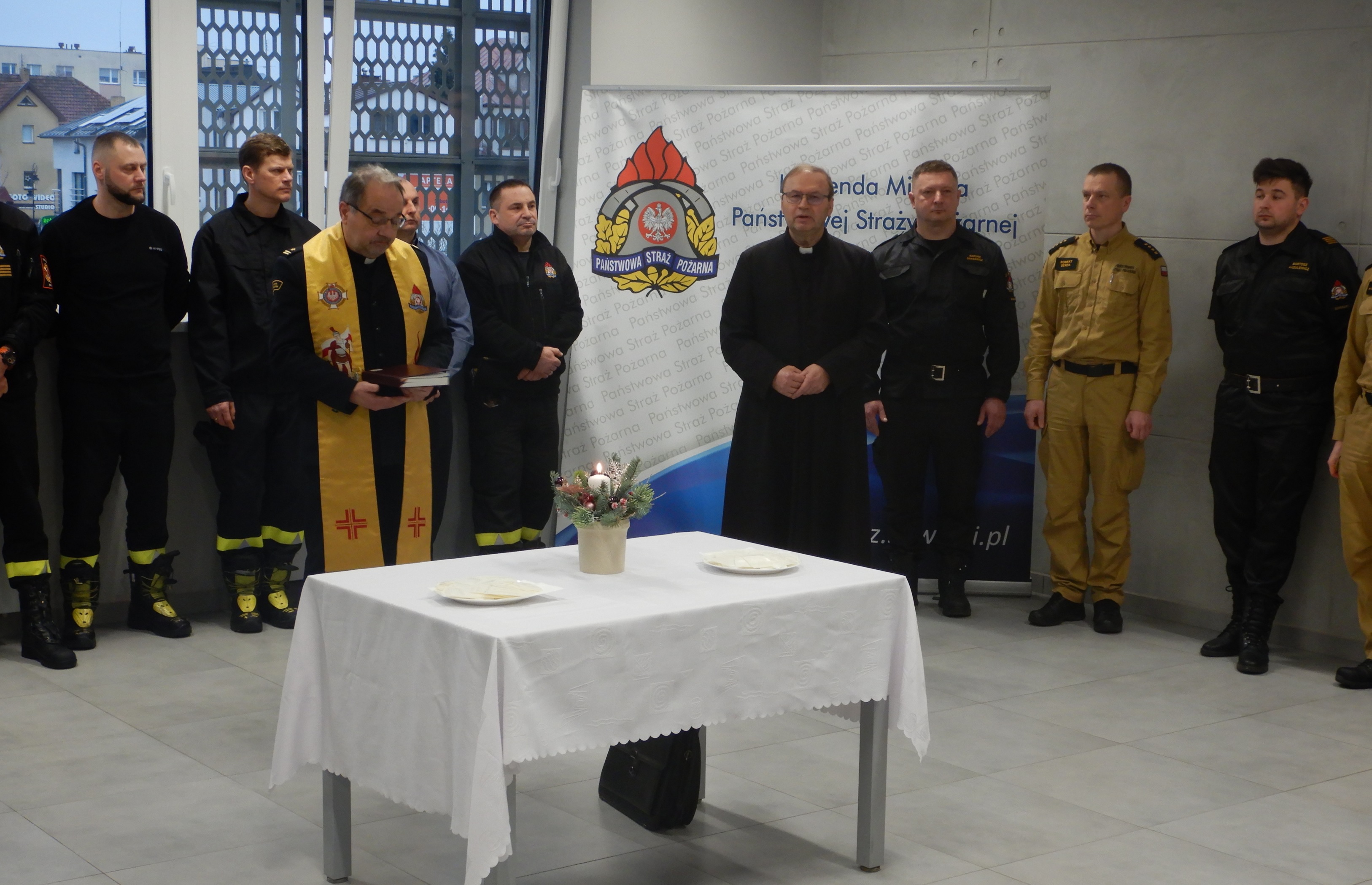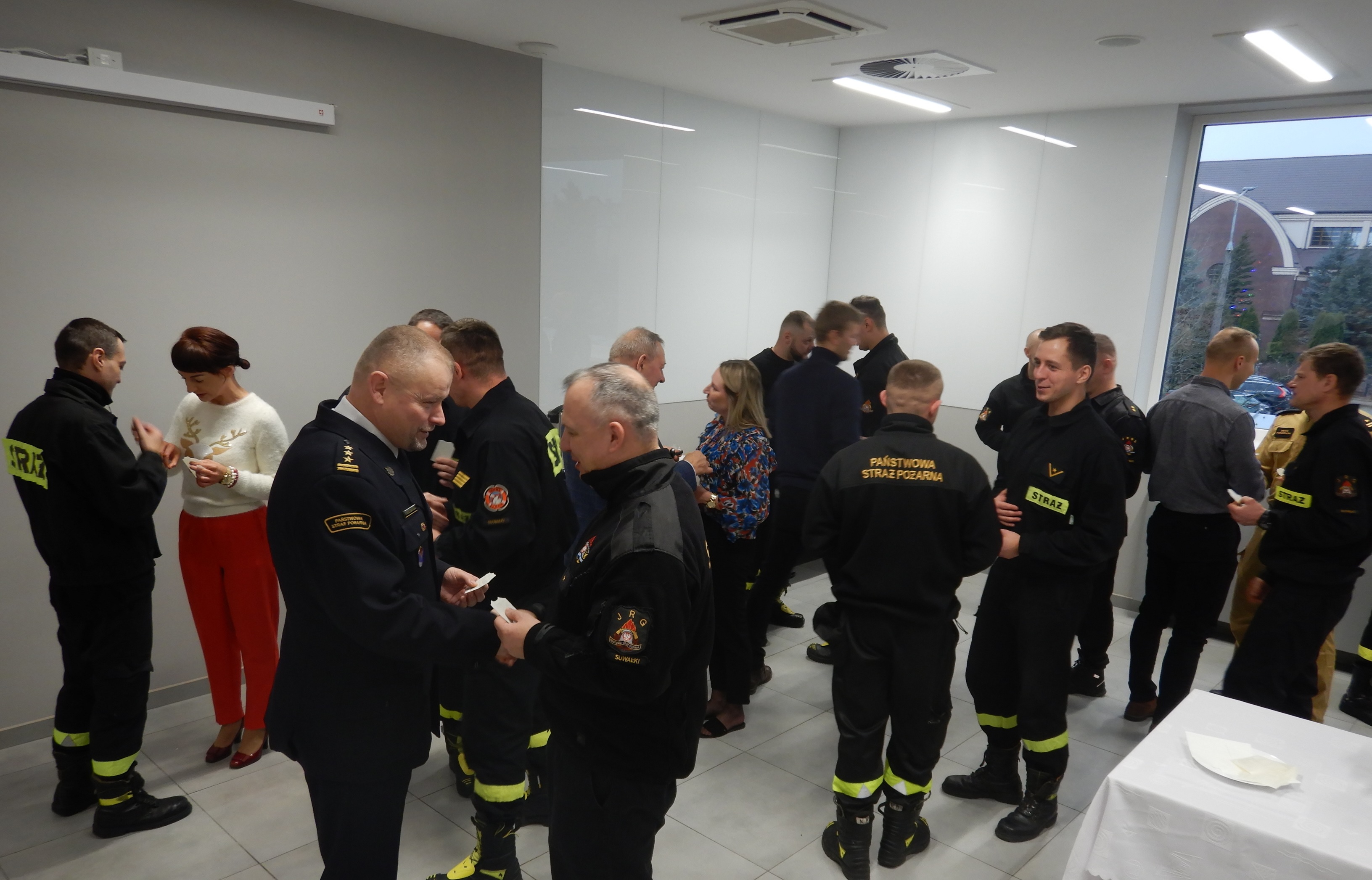Następnie mł. bryg. ks. kan. Wojciech Ejsmont - Ksiądz kapelan wojewódzki strażaków poświęcił opłatki po czym odśpiewano kolędę i wszyscy złożyli sobie życzenia. Po złożeniu życzeń ogólnych przystąpiono do wspólnego spożycia symbolicznego poczęstunku przygotowanego na tą uroczystość.