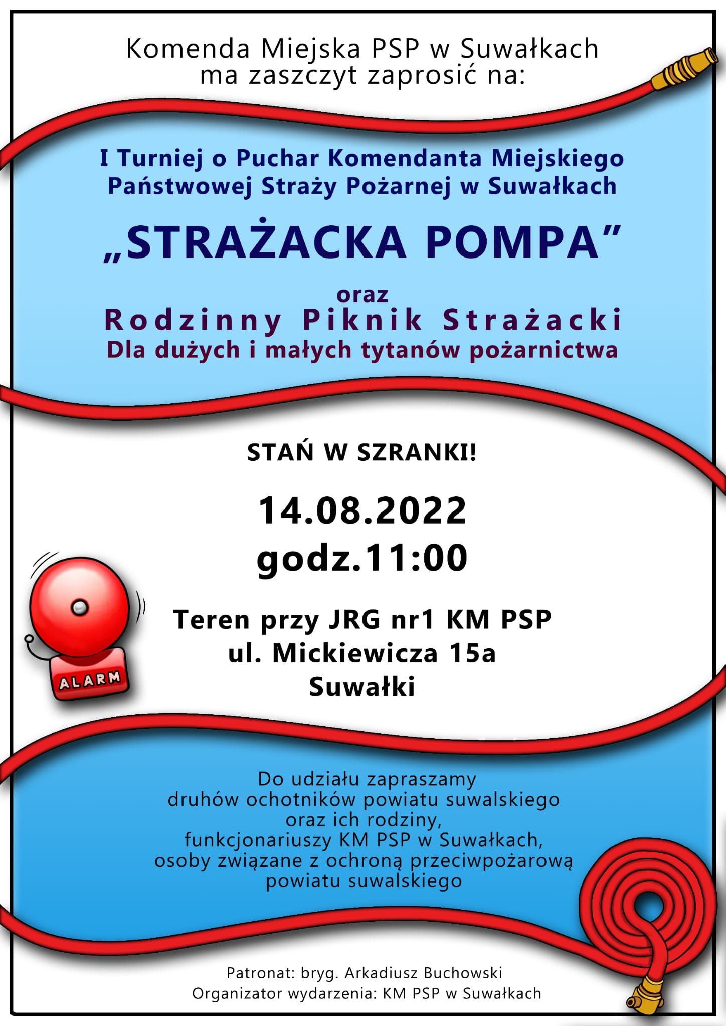 Komenda Miejska PSP w Suwałkach ogłasza, że w dniu 14.08.2022 r. o godzinie 11.00 przy JRG nr 1, ul. Mickiewicza 15a w Suwałkach odbędzie się I Turniej Firefighter Combat Challenge o Puchar Komendanta Miejskiego PSP w Suwałkach „Strażacka Pompa”.
