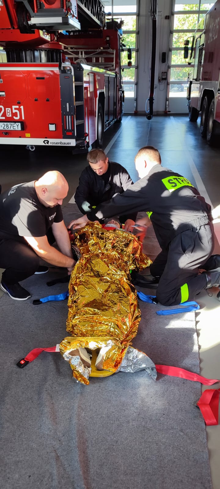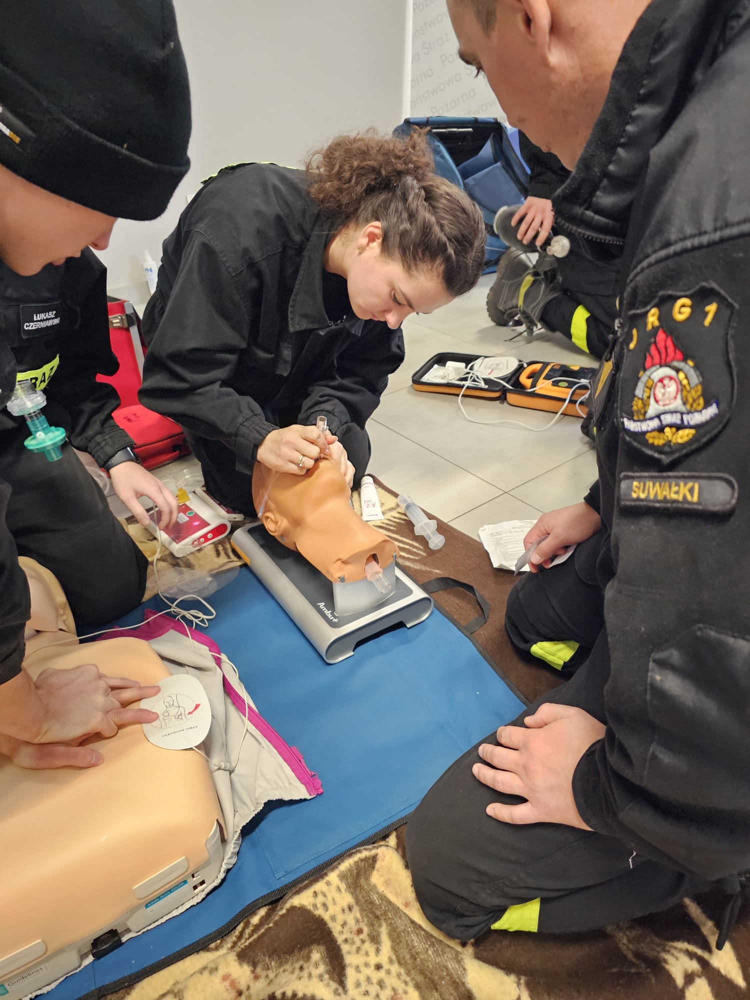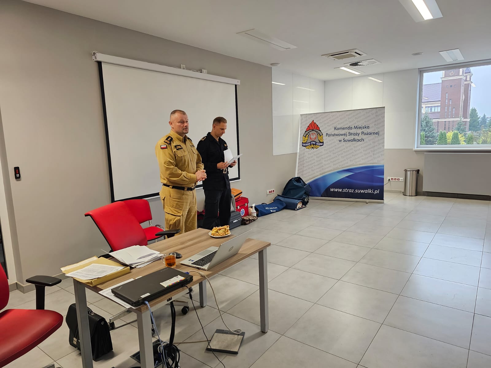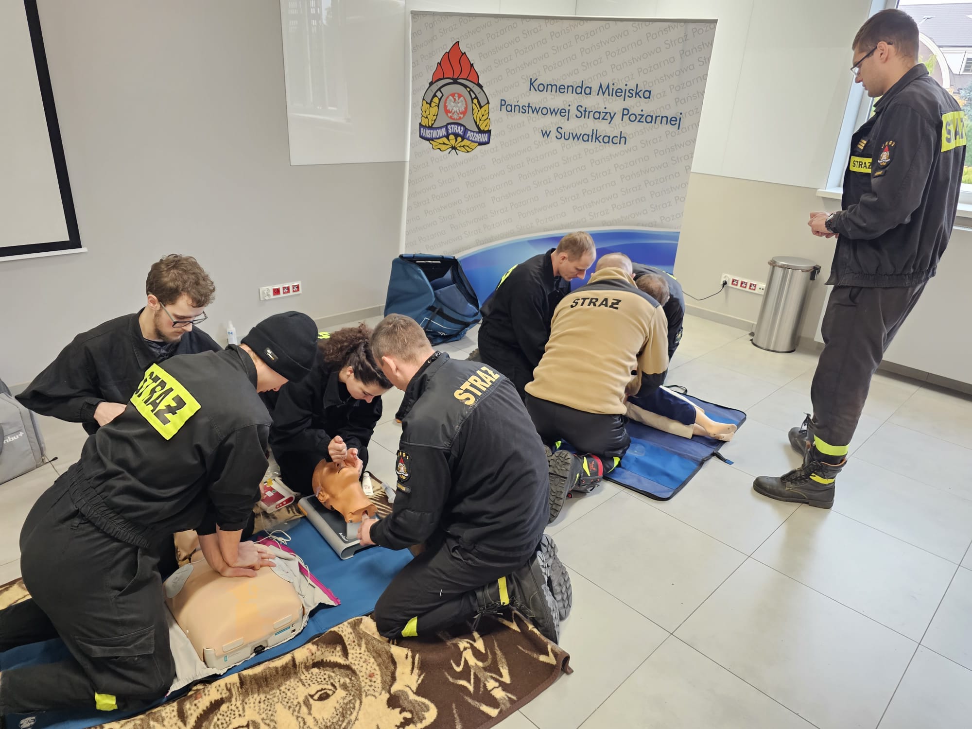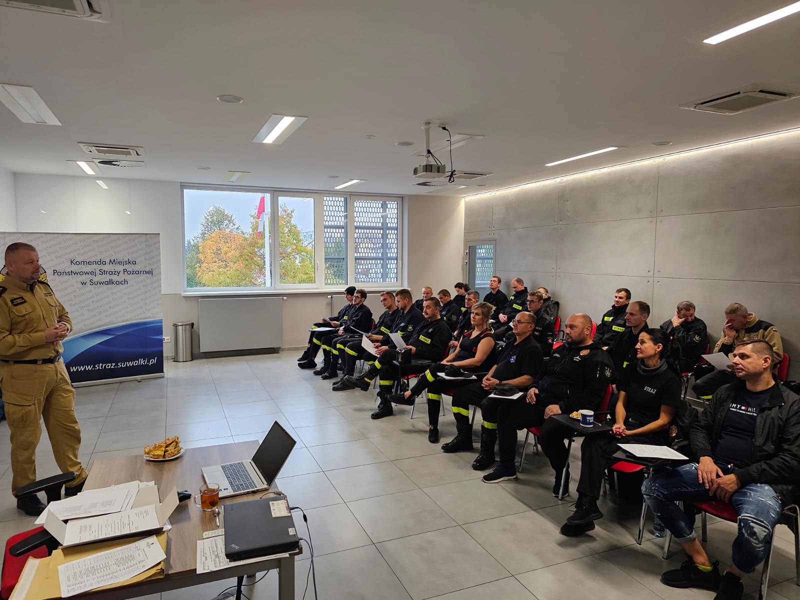 W dniach od 30 września do 22 października 2023 roku w Komendzie Miejskiej Państwowej Straży Pożarnej w Suwałkach odbył się pierwszy cykl szkolenia kwalifikowanej pierwszej pomocy druhom Ochotniczej Straży Pożarnej powiatu suwalskiego. W szkoleniu uczestniczyły 23 osoby, które realizowały program kursu, ucząc się zasad podstawowych w udzielaniu pomocy przedmedycznej w sytuacjach zagrożenia zdrowia i życia ludzkiego. Przygotowanie teoretyczne i praktyczne strażaków OSP pozwoli na zwiększenie potencjału ratowniczego powiatu. Egzamin przeprowadziła komisja powołana przez Podlaskiego Komendanta Wojewódzkiego PSP w Białymstoku, której przewodniczącym był mł. asp. Damian Dębek w dniu 22 października br. połączonej z recertyfikacją kpp. Do egzaminu kpp przystąpiło i ukończyło 21 osób a dwie recertyfikację.