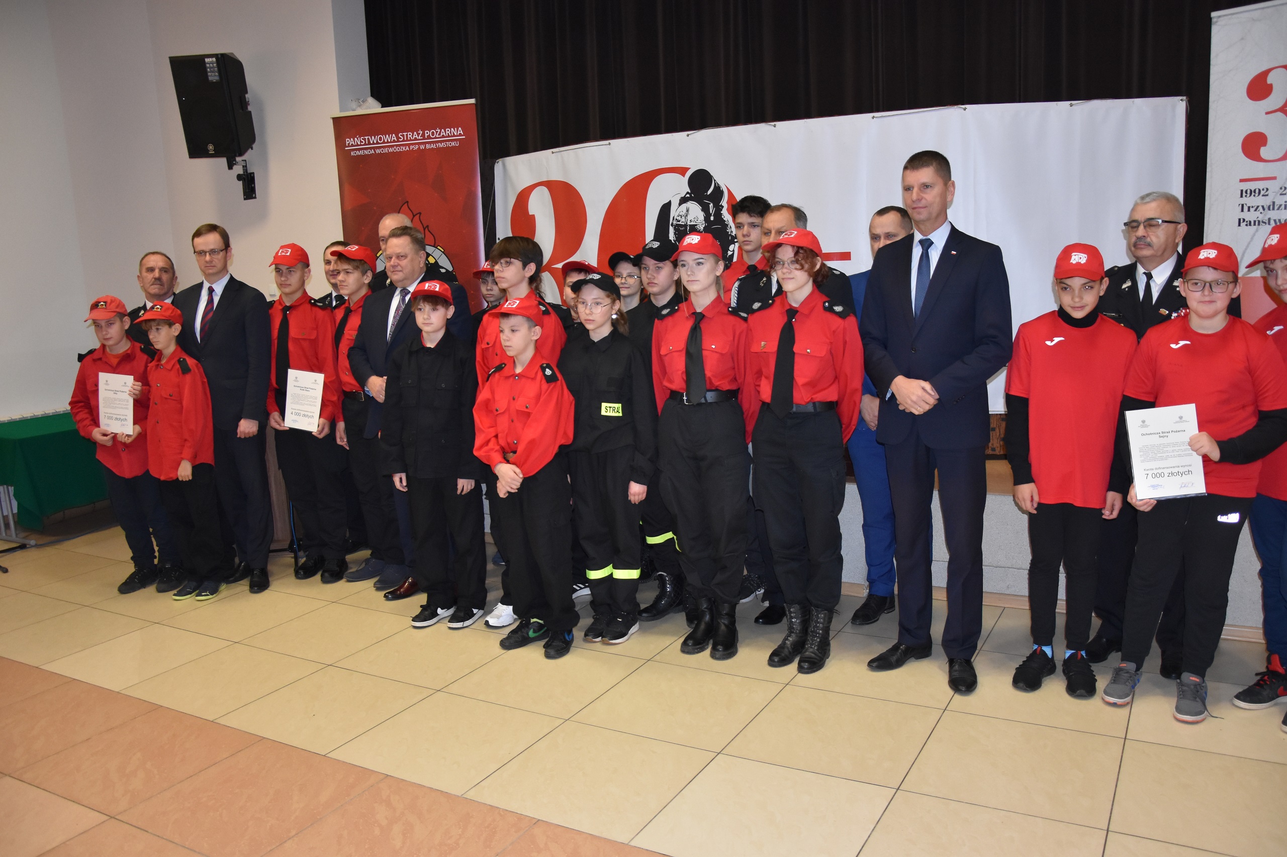 Podlaski Komendant Wojewódzki PSP st. bryg. Sebastian Zdanowicz po przyjęciu meldunku od Komendanta Miejskiego PSP w Suwałkach rozpoczął uroczystość i przywitał zaproszonych gości. Następnie odbyło się przekazanie promes jednostkom Ochotniczych Straży Pożarnych. Promesy otrzymało 21 Młodzieżowych Drużyn Pożarniczych z: OSP Bakałarzewo, OSP Filipów , OSP Pawłówka, OSP Płociczno, OSP Przerośl, OSP Raczki, OSP Rakówek, OSP Woźna Wieś, OSP Niedźwiadna, OSP Rajgród, OSP Wąsocz, OSP Klimaszewnica, OSP Ławsk, OSP Słucz, OSP Biby, OSP Bubele, OSP Bierżałowce, OSP Krasnopol, OSP Sejny, OSP Rutki Stare, OSP Bargłów Kościelny. Pozyskane środki pozwolą na zakup sprzętu teleinformatycznego, umundurowania i wyposażenia osobistego młodych adeptów pożarnictwa oraz zachęcenia ich do rozwijania pasji pożarnictwa w procesie szkolenia. Następnie zaproszeni goście zabrali głos dziękując Młodzieżowym Drużynom Pożarniczym za ich zaangażowanie w działalność społeczną na rzecz ochrony przeciwpożarowej.