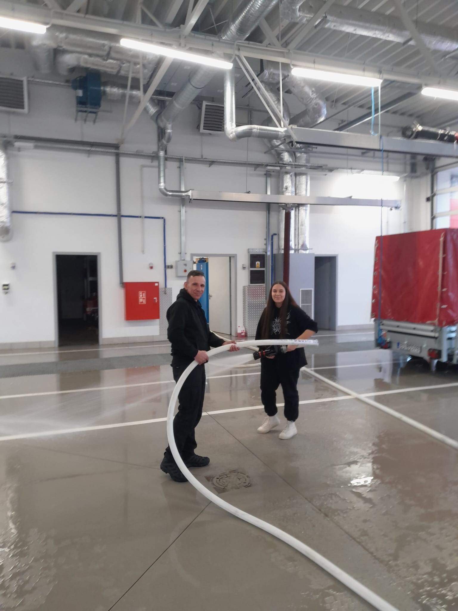 Po powrocie z ćwiczeń Pan Jacek wraz z córką Leną , pomogli strażakom uporządkować sprzęt używany podczas ćwiczeń. W kolejnej części dnia, przystąpiono do prac porządkowych które polegały w szczególności na umyciu posadzki garażu, przy użyciu węża strażackiego.