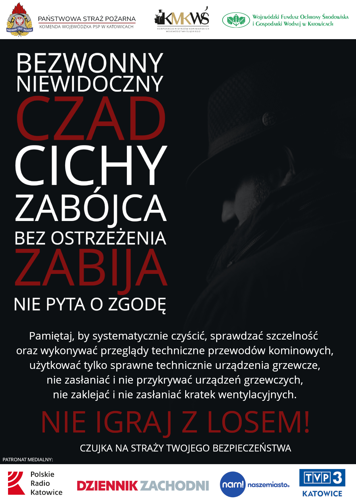 Temat czadu i zagrożeń jakie ze sobą niesie jest przypominany w kampaniach edukacyjnych co roku z początkiem sezonu grzewczego. By komunikat w sposób bardziej dobitny trafił do odbiorców, postanowiliśmy podejść do problemu w sposób nieco niekonwencjonalny. By wyróżnić kampanię, a jednocześnie przykuć uwagę odbiorców użyliśmy dwóch narzędzi – formuły kampanii teaserowej oraz personifikacji czadu. Miały one przykuć uwagę, zaciekawić, zaintrygować. Podczas konferencji odbyła się premiera spotu, w którym w rolę „Cichego zabójcy” wciela się znany na Śląsku dziennikarz – Pan Mirosław Cichy. Link do filmu dostępny jest poniżej.