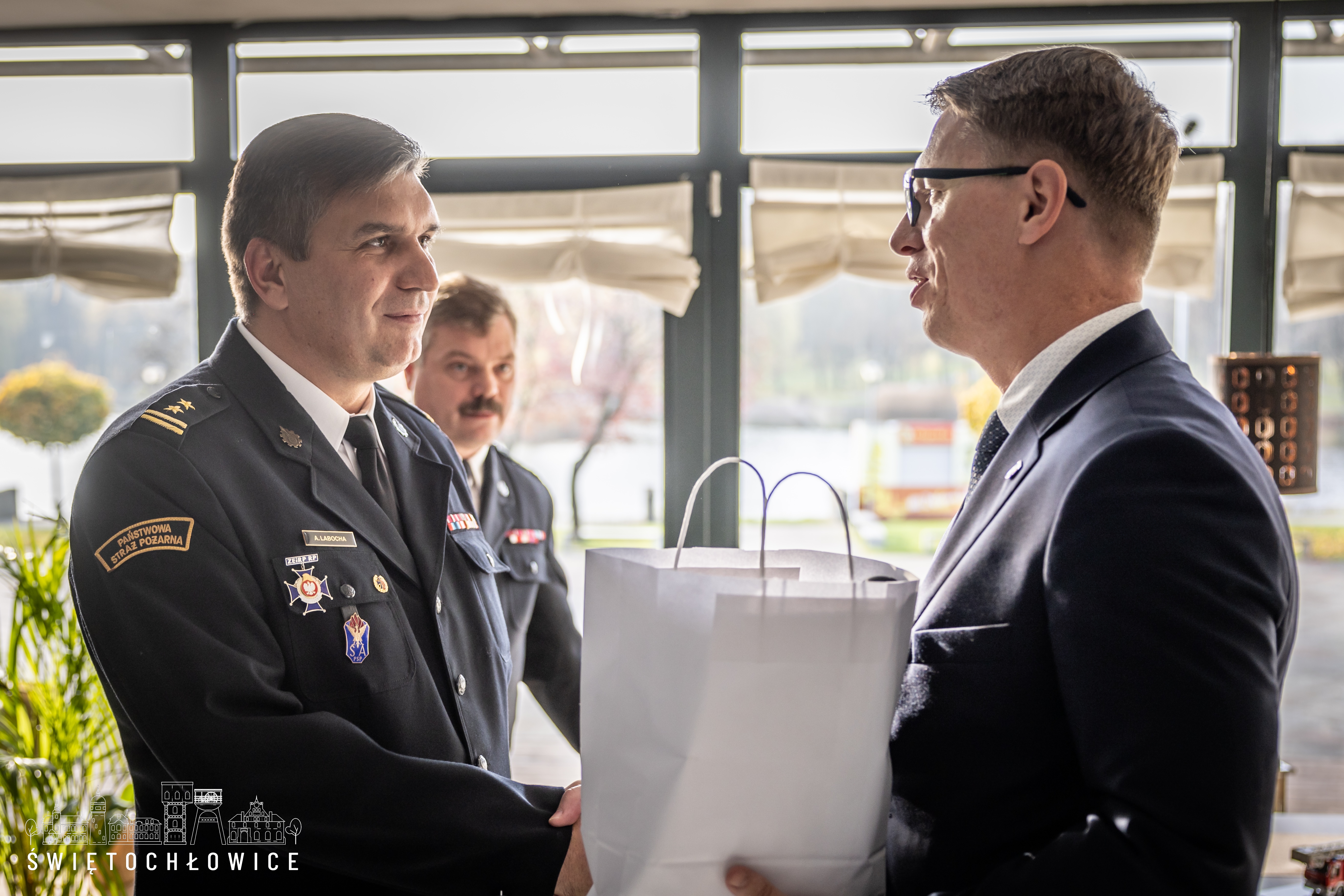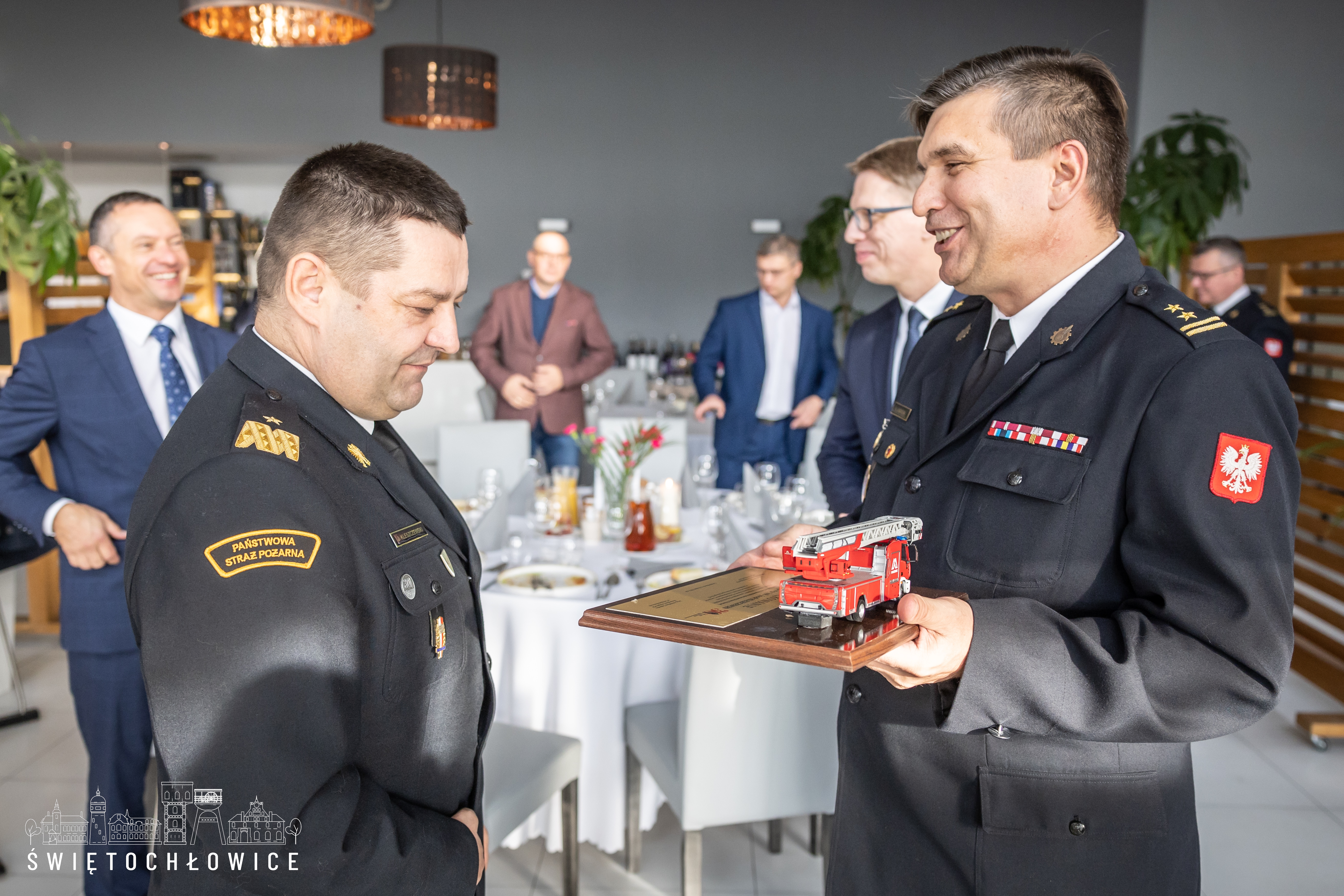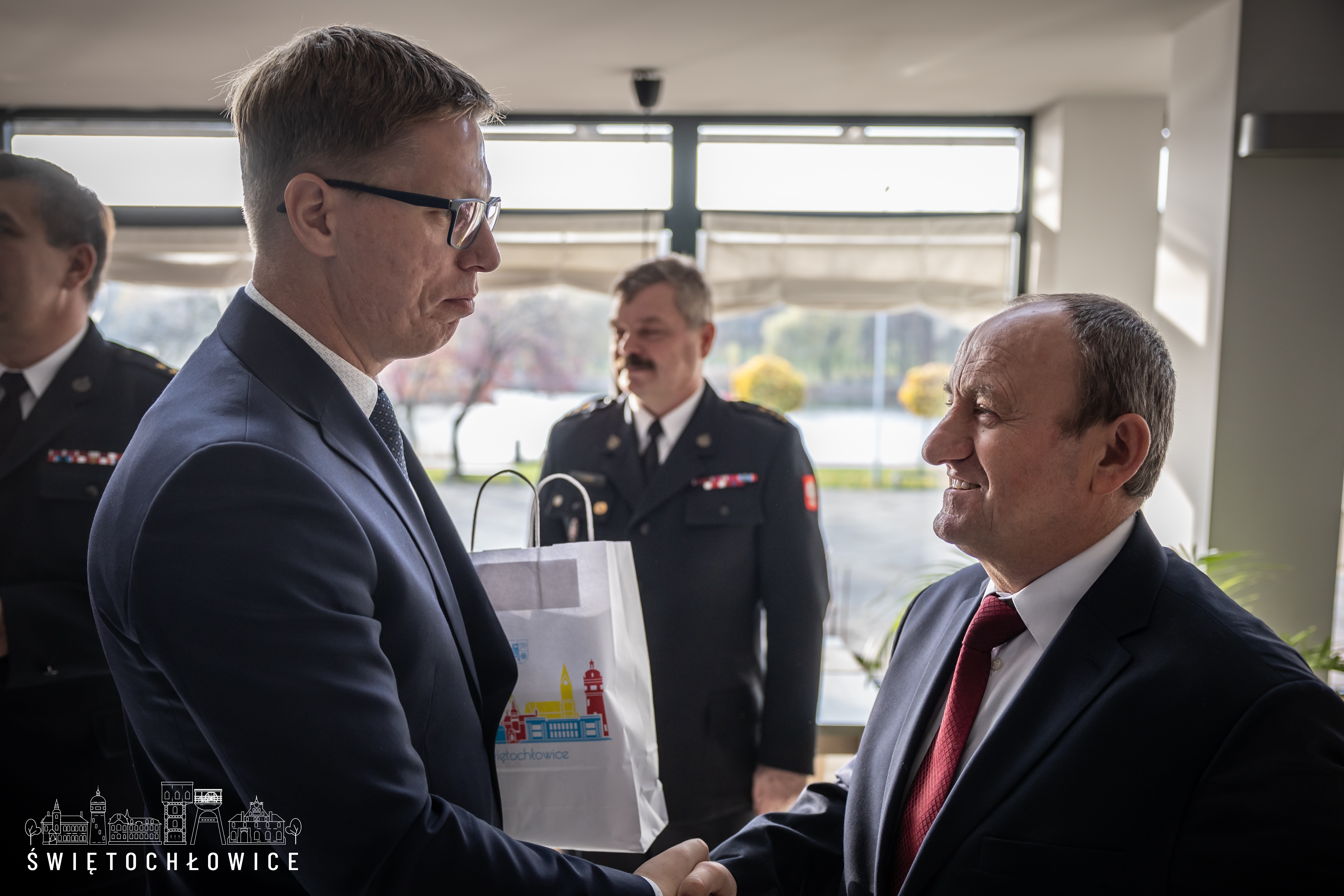Komendant Miejski PSP w Świętochłowicach bryg. Arkadiusz Labocha i jego zastępca bryg. Piotr Skóra wraz z Prezydentem Miasta Świętochłowice Danielem Beger i jego zastępcą Sławomir Pośpiech w obecności władz samorządowych na czele z przewodniczącym Rady Miejskiej Zbigniewem Nowak, złożyli kierownictwu Komendy Wojewódzkiej Państwowej Straży Pożarnej w Katowicach serdeczne podziękowania za okazaną pomoc i wsparcie w pozyskaniu nowych samochodów. Wyrazili głęboką wdzięczność za włożony wkład i poświęcenie w rozwój ochrony przeciwpożarowej Miasta Świętochłowice.