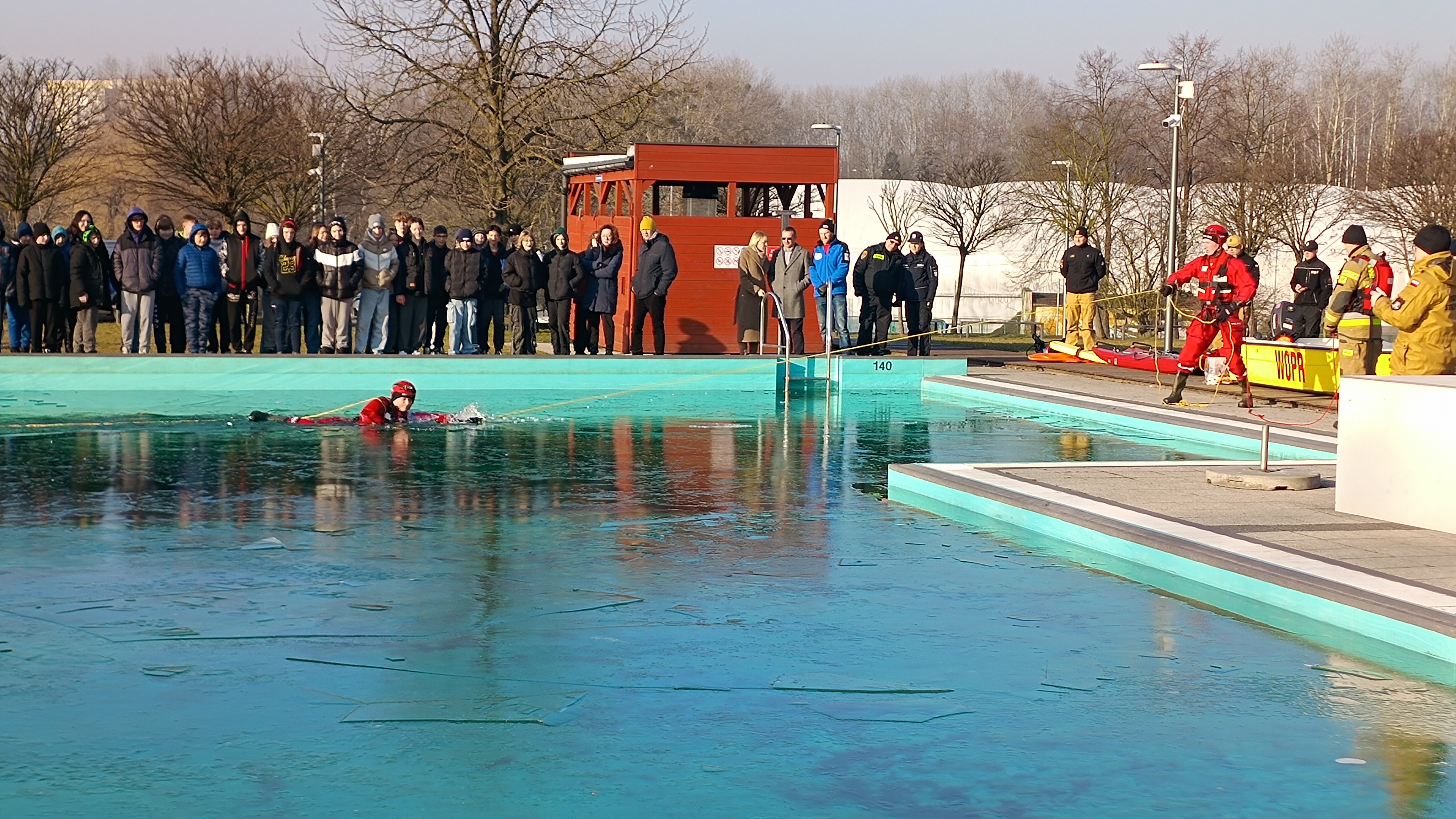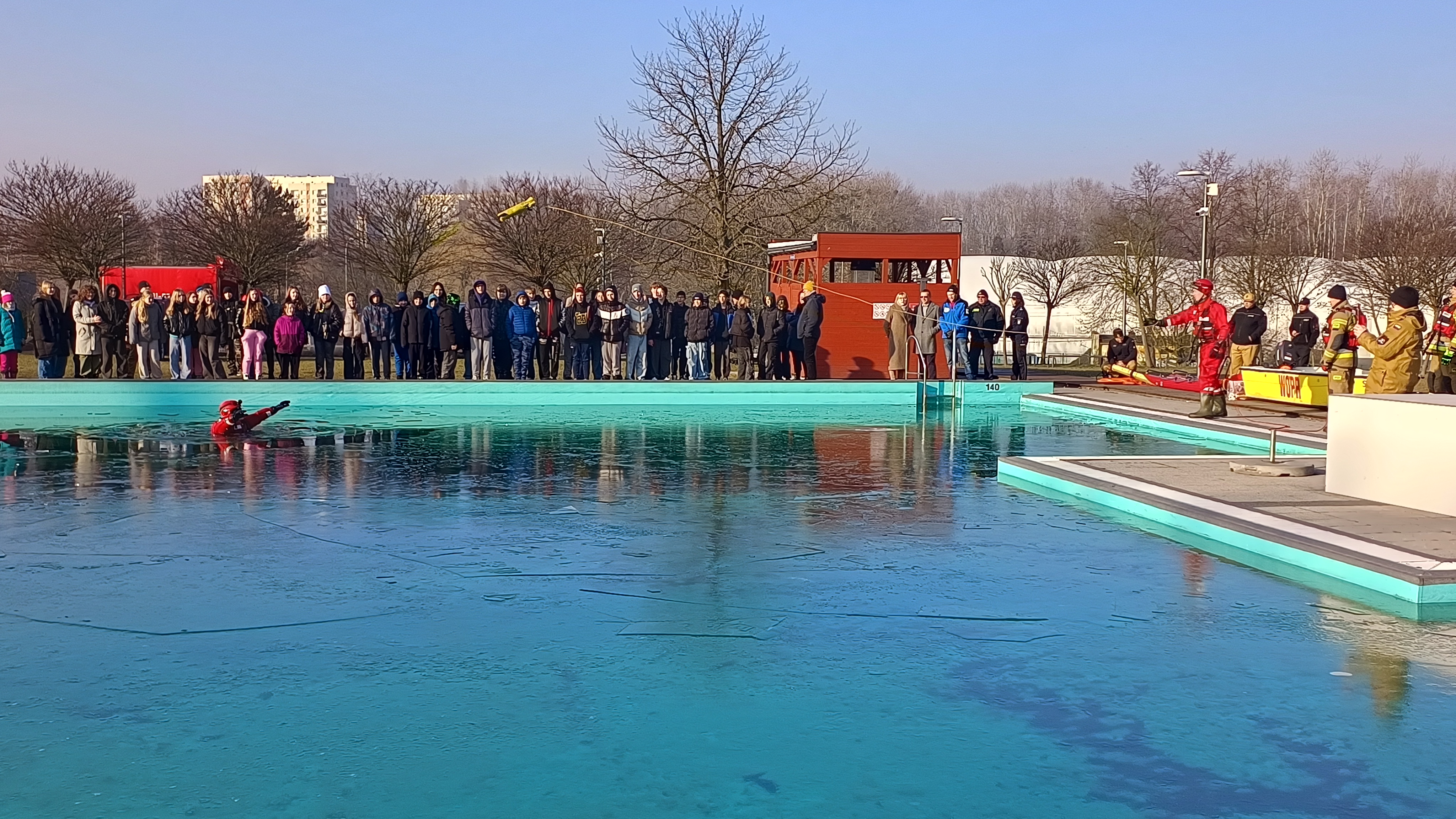 Następnie odbyły się prelekcje i pokaz świętochłowickich strażaków. Głównym tematem prelekcji było bezpieczeństwo podczas przebywania w pobliżu zamarzniętych zbiorników wodnych. W tym celu strażacy przeprowadzili pokazy z ratownictwa wodno-lodowego, podczas których zaprezentowali techniki ratowania osoby pod którą załamał się lód.