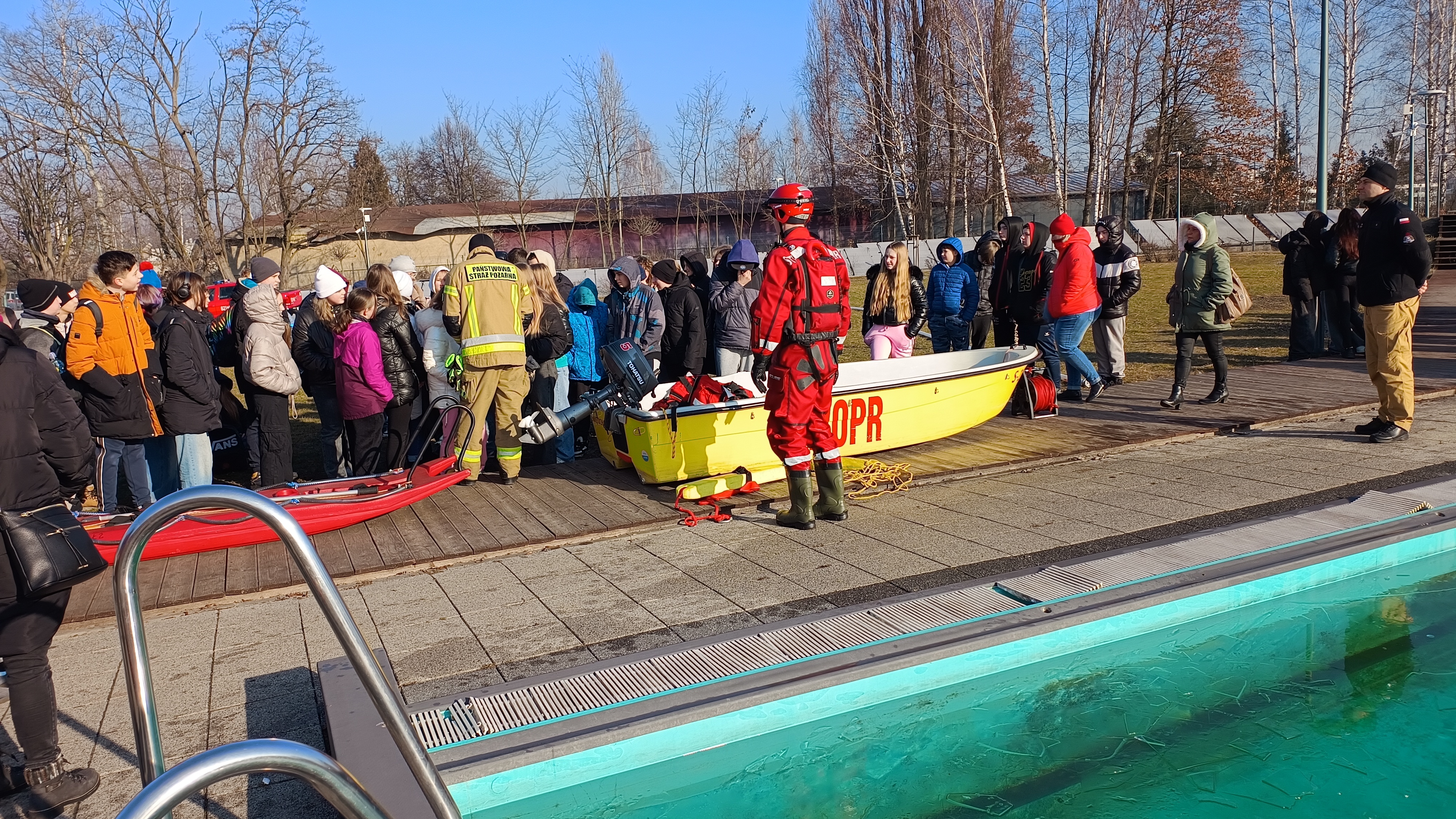 Ponadto, omawiano sprzęt do ratownictwa wodnego i ratownictwa lodowego znajdujący się na wyposażeniu tutejszej Jednostki Ratowniczo-Gaśniczej, przekazano uczniom jak należy postępować w przypadku zauważenia osoby tonącej lub osoby pod którą załamie się lód. Omówiono również w jaki sposób można wezwać potrzebną pomoc w sytuacji zagrożenia.