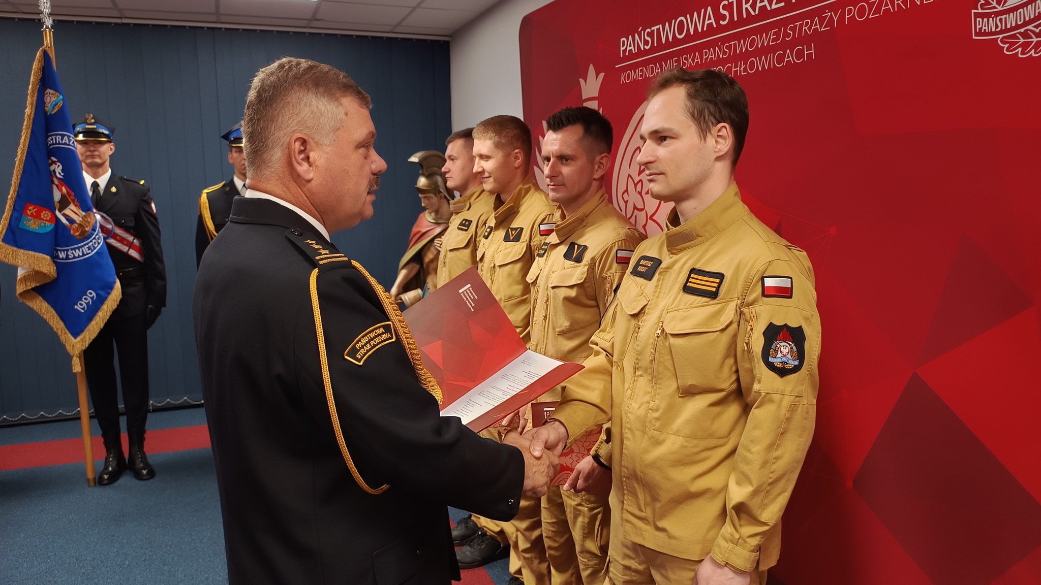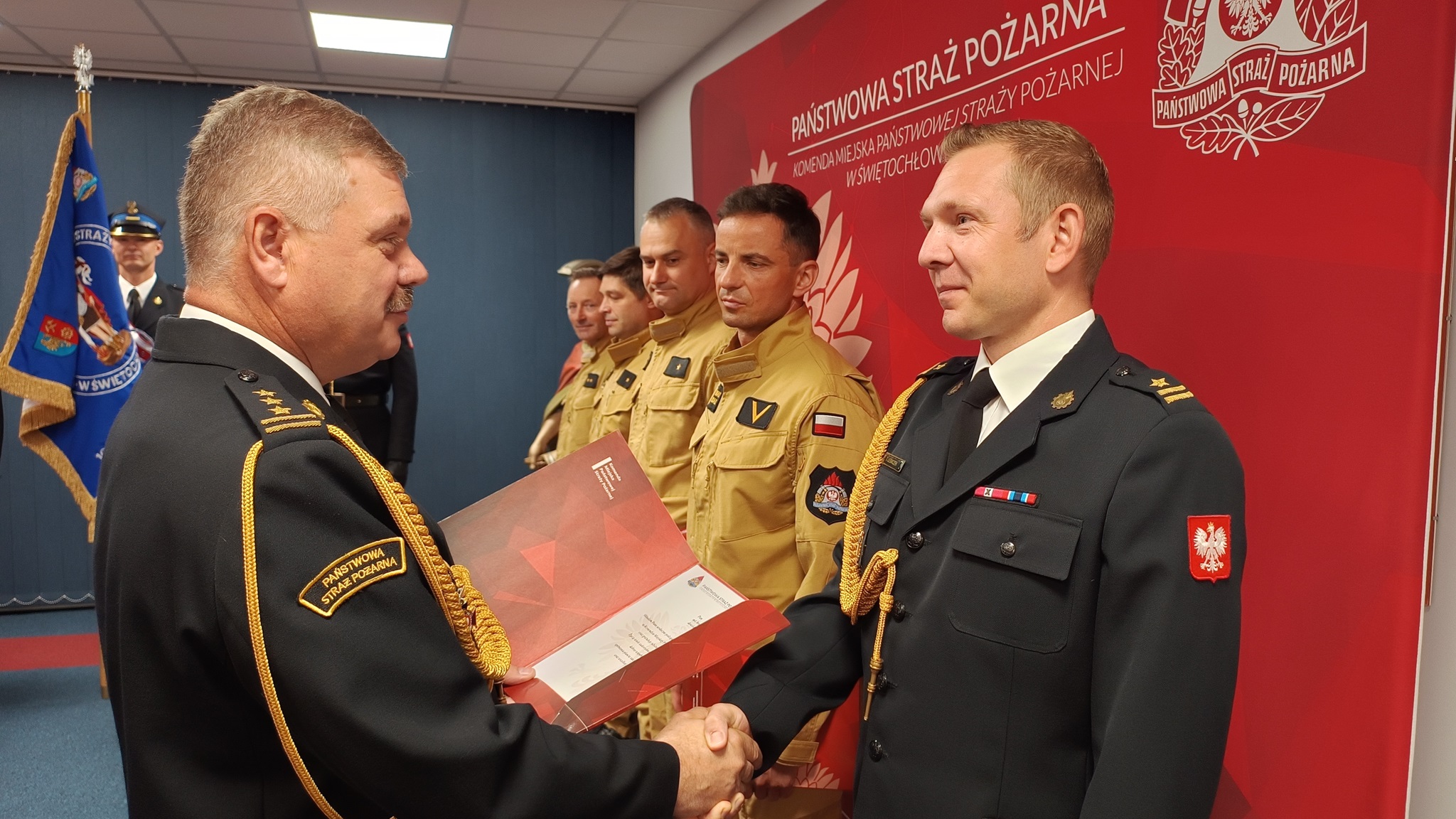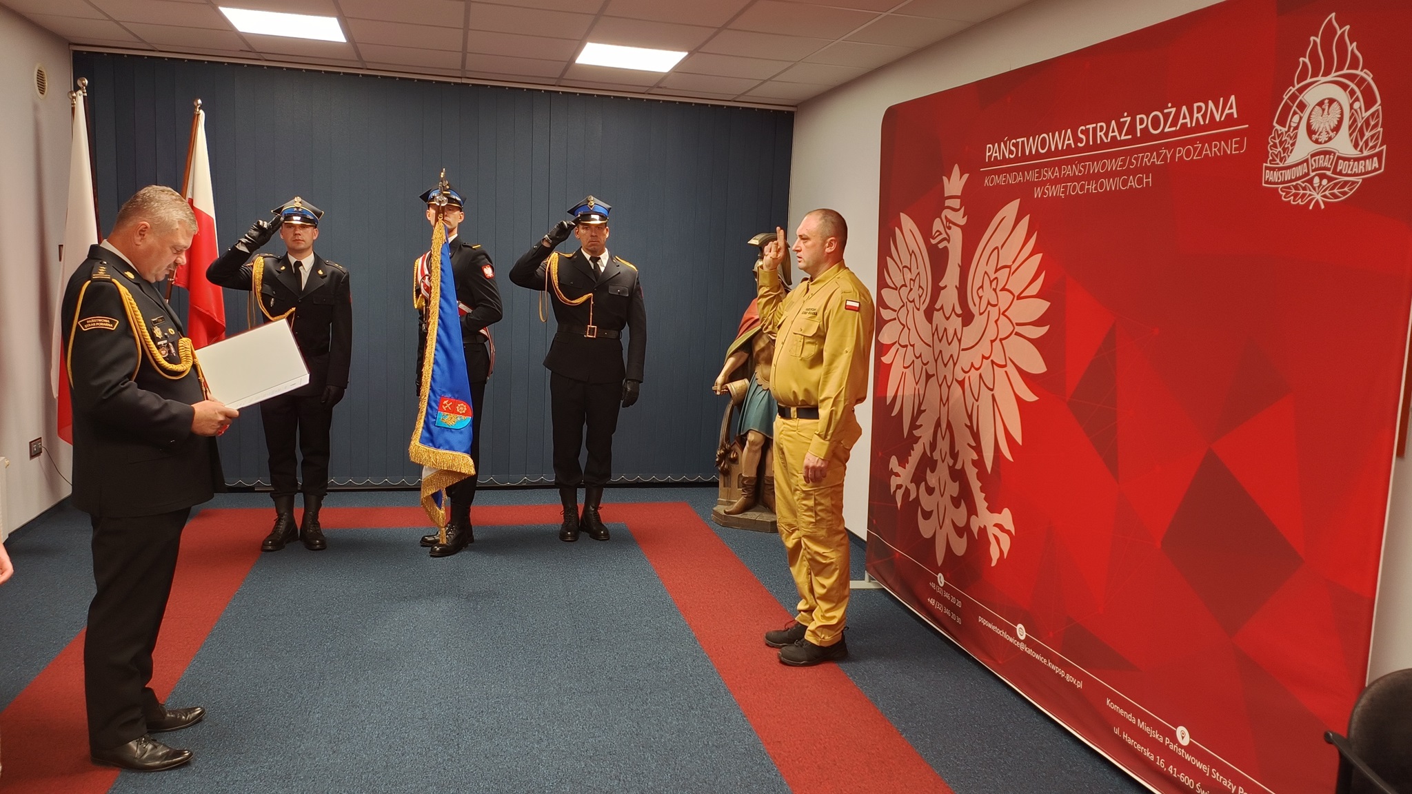 14 sierpnia 2025 r. na terenie Komendy Miejskiej Państwowej Straży Pożarnej w Świętochłowicach miała miejsce uroczysta zbiórka, podczas której odbyło się ślubowanie nowo przyjętego funkcjonariusza Państwowej Straży Pożarnej, oraz wręczenie awansów na wyższe stanowiska służbowe i nagród jubileuszowych za wieloletnią służbę i pracę.