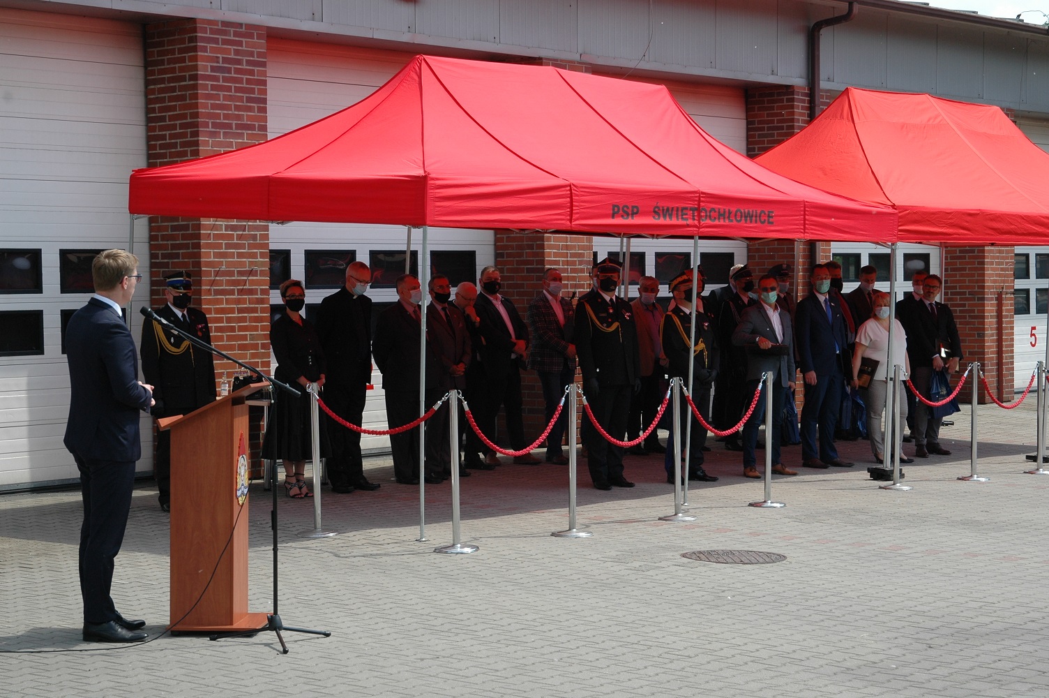 Komendant Miejski Państwowej Straży Pożarnej w Świętochłowicach bryg. Arkadiusz Labocha rozpoczął swoją przemowę minutą ciszy ku czci wszystkich poległych strażaków, a także członków ich rodzin, szczególnie ofiar COVID-19, a następnie przywitał zaproszonych gości.