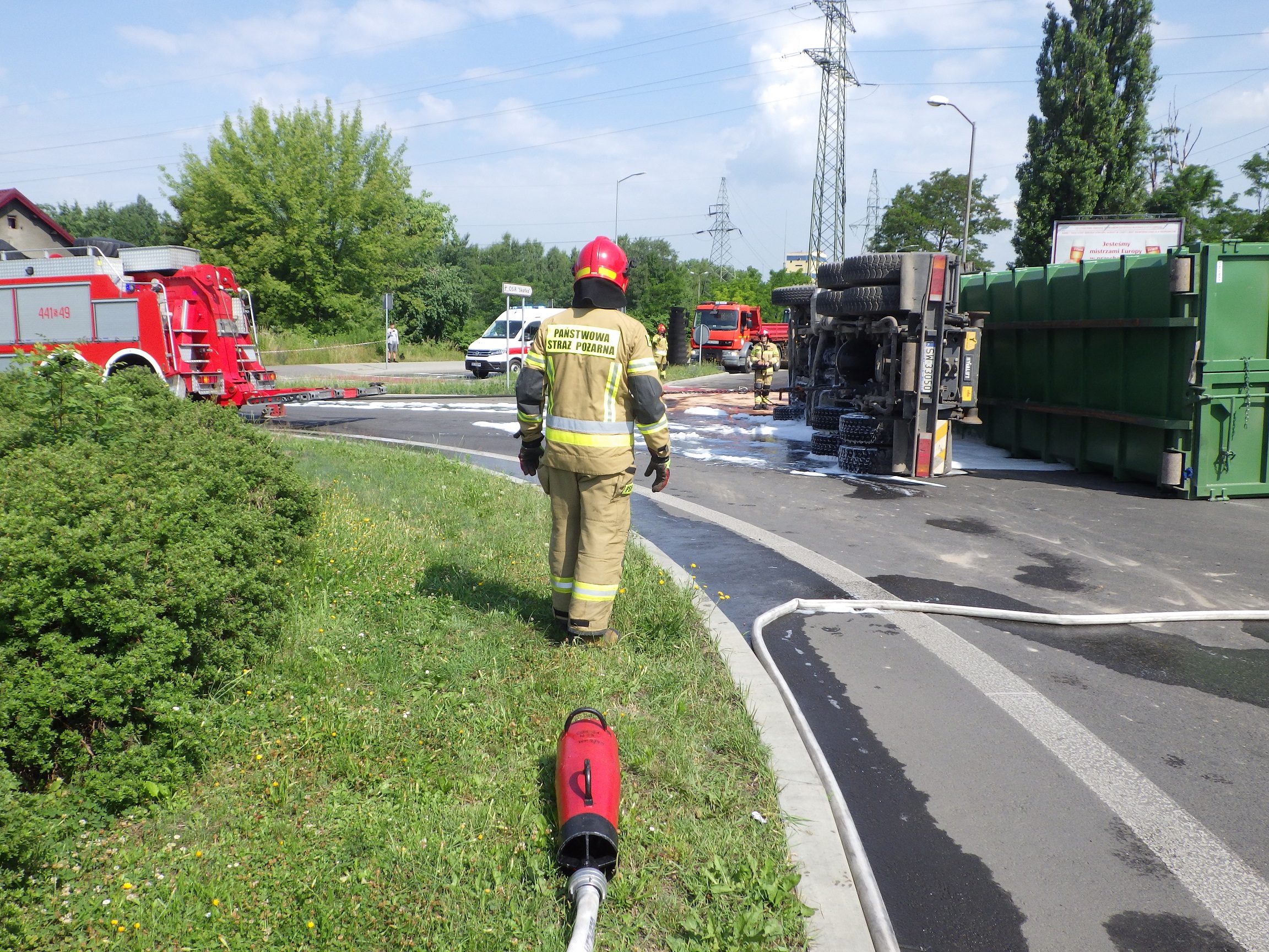 Po przybyciu na miejsce zdarzenia strażacy stwierdzili, że doszło do przewrócenia się na bok ciężarówki przewożącej tworzywa sztuczne. W wyniku zdarzenia doszło uszkodzenia zbiornika paliwa w ciężarówce i wycieku oleju napędowego na jezdnię. Kierowca o własnych siłach opuścił pojazd.