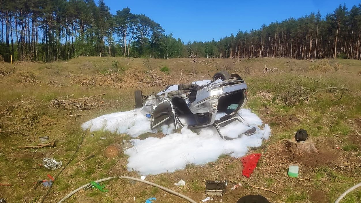 Do zdarzenia zadysponowano 2 zastępy z JRG nr 1, które przybyły na miejsce zdarzenia jednocześnie z dwoma zespołami ratownictwa medycznego. Podczas rozpoznania ustalono, że samochód osobowy leży poza jezdnią na dachu i wycieka z niego olej napędowy. Na miejscu zdarzenia są dwie osoby poszkodowane. Jedna w czasie dachowania pojazdu wypadła z niego na pobocze, drugą z pojazdu ewakuowały osoby postronne. Działania strażaków polegały na zabezpieczeniu wycieku oleju napędowego poprzez przykrycie go pianą oraz na odłączeniu akumulatora. Dokonano także przeszukania miejsca akcji i nie stwierdzono innych osób poszkodowanych.