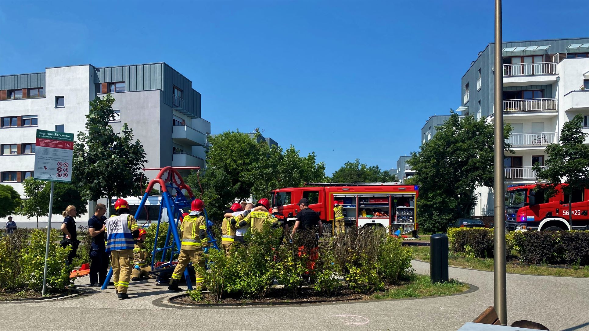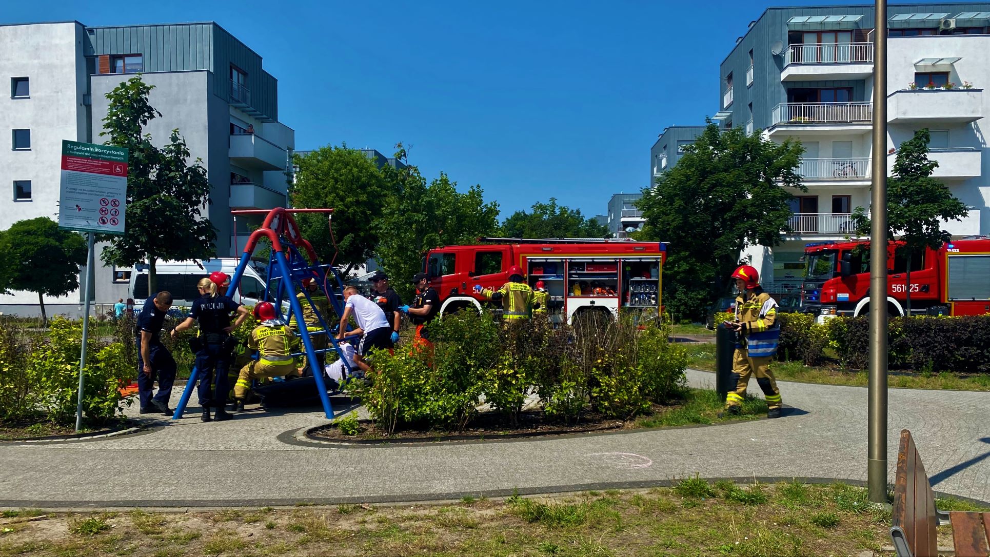 Zgłoszenie wpłynęło z Wojewódzkiego Centrum Powiadamiania Ratunkowego, a w działaniach wzięły udział dwa zastępy z JRG nr 1. Podczas rozpoznania ustalono, że doszło do złamania otwartego w okolicy stawu skokowego, lecz nie ma możliwości ręcznego podniesienia huśtawki. Konieczne było użycie poduszek powietrznych oraz narzędzi hydraulicznych, co pozwoliło uwolnić nogę poszkodowanego. W dalszej kolejności strażacy zabezpieczyli medycznie osobę poszkodowaną poprzez unieruchomienie złamanej nogi i założenie opatrunku osłonowego udzielając w tym czasie wsparcia psychicznego. Poszkodowanego przejął Zespół Ratownictwa Medycznego.