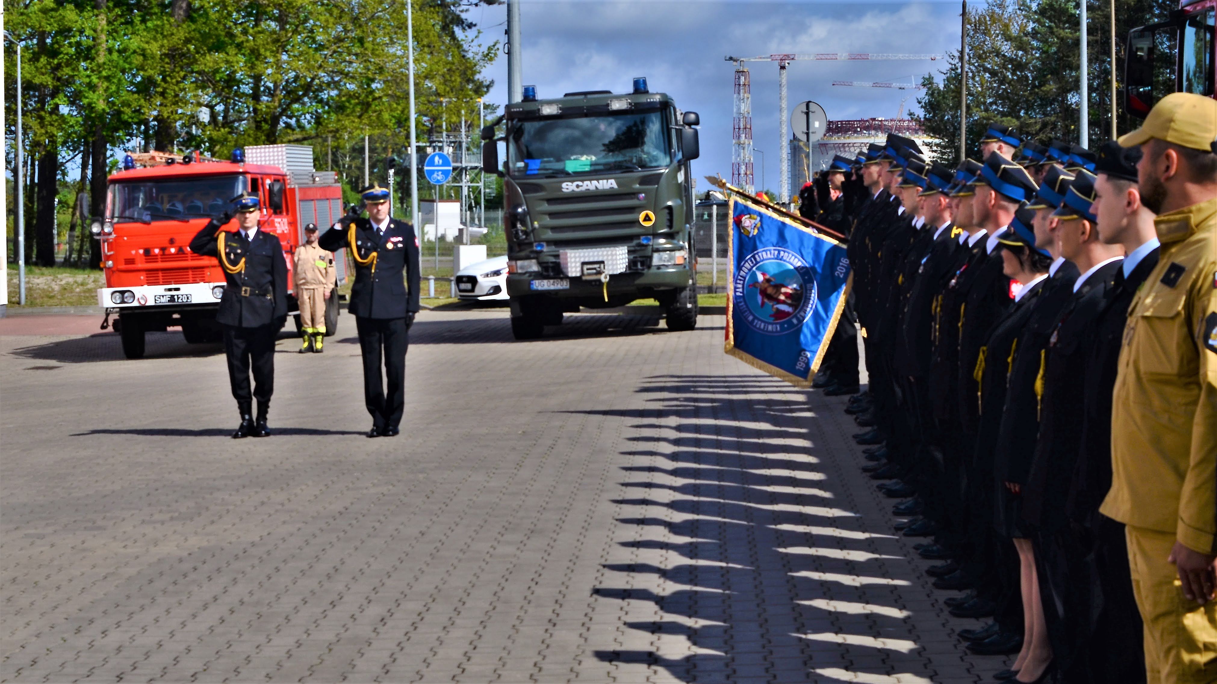 Meldunek Zastępcy Zachodniopomorskiego Komendanta Wojewódzkiego PSP st. bryg. Markowi Popławskiemu złożył dowódca uroczystości kpt. Paweł Piorun.