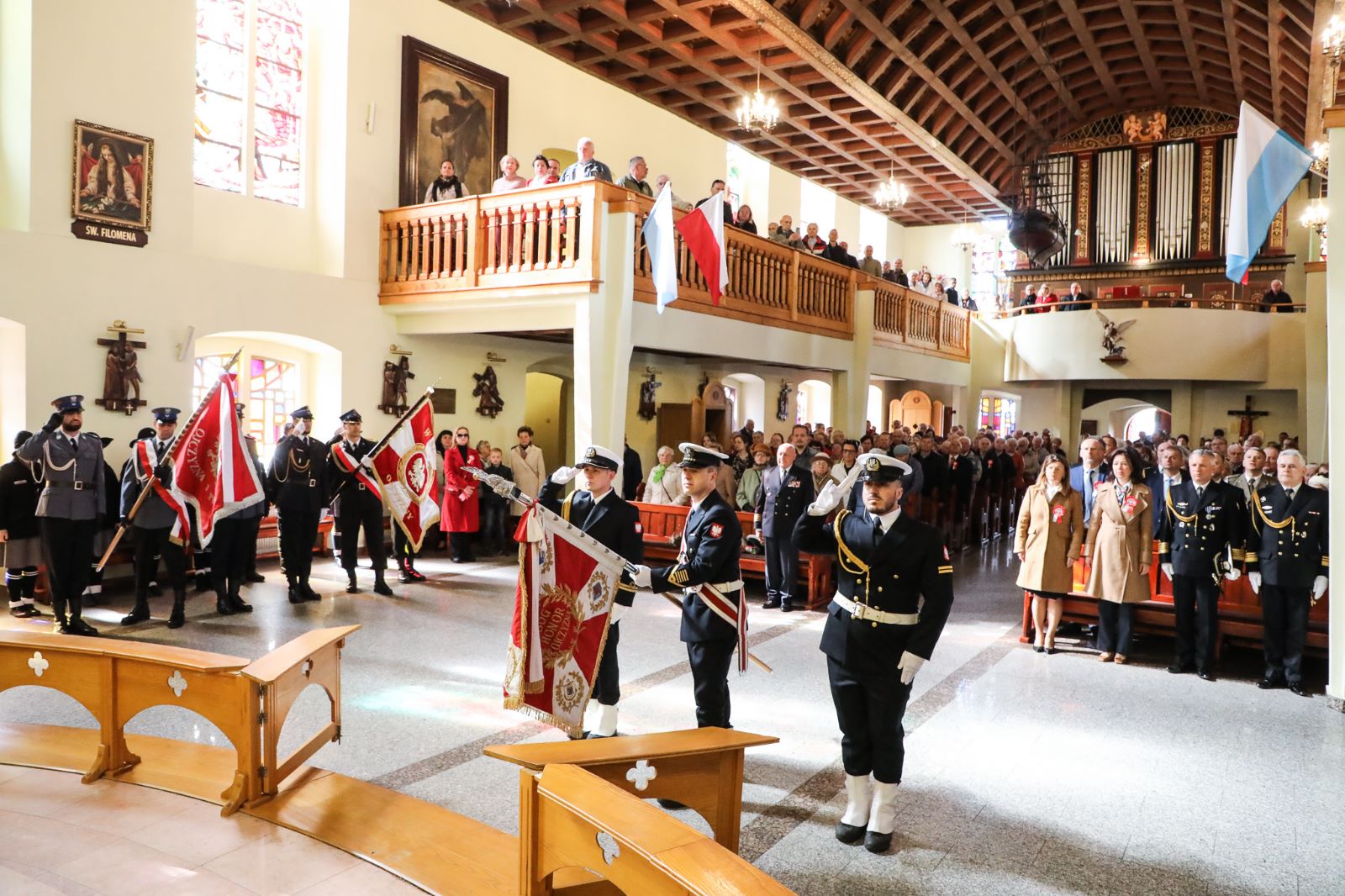Poczet sztandarowy Komendy Miejskiej PSP w Świnoujściu reprezentowali: dowódca pocztu sztandarowego - mł. kpt. Maciej Podliński, sztandarowy - ogn. Paweł Witczak, asystujący - kpt. Łukasz Baranowski.