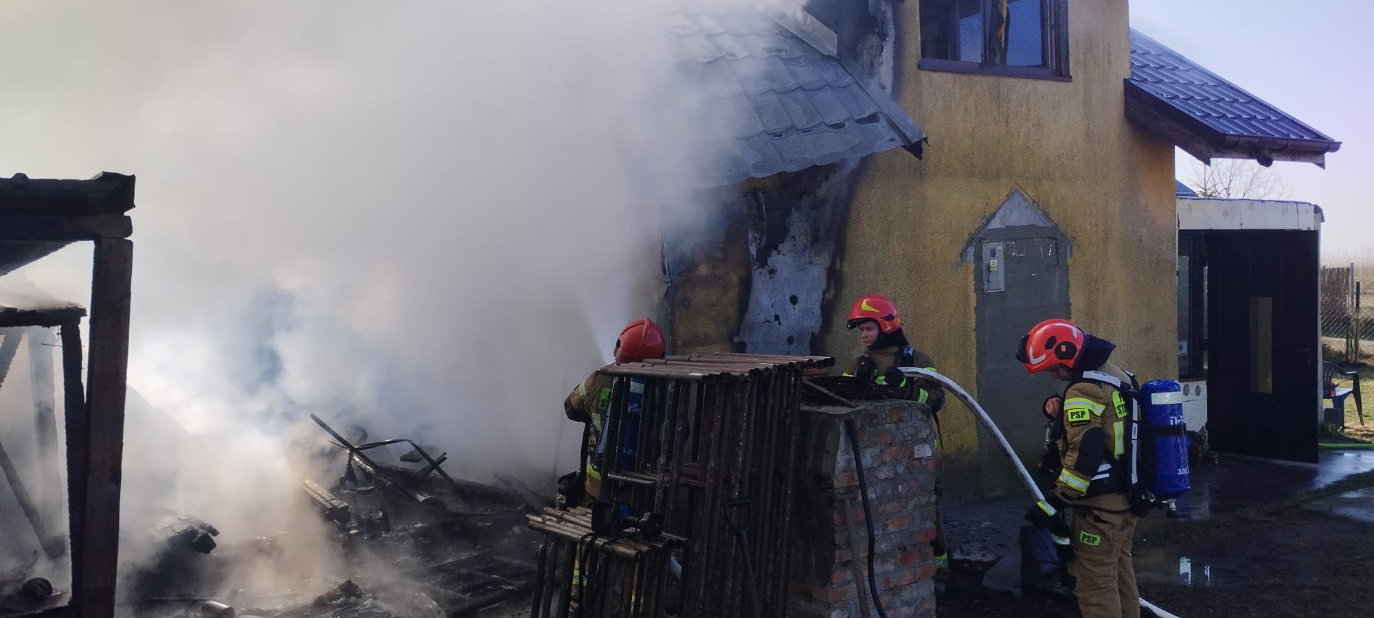 Na miejscu strażacy zabezpieczyli miejsce zdarzenia oraz przystąpili do akcji gaśniczej. Cały domek letniskowy był objęty pożarem. Przed przybyciem służb ratunkowych wszystkie osoby opuściły budynek. W trakcie działań ewakuowano z miejsca objętego pożarem butlę gazową 11 kg. Pożar ugaszono. Pogorzelisko sprawdzono kamerą termowizyjną nie stwierdzając zagrożenia. W działaniach trwających do godziny 11:07 brało udział w sumie 13 strażaków z PSP oraz WSP w obsadzie 6 pojazdów pożarniczych. W wyniku zdarzenia nikt nie został poszkodowany.