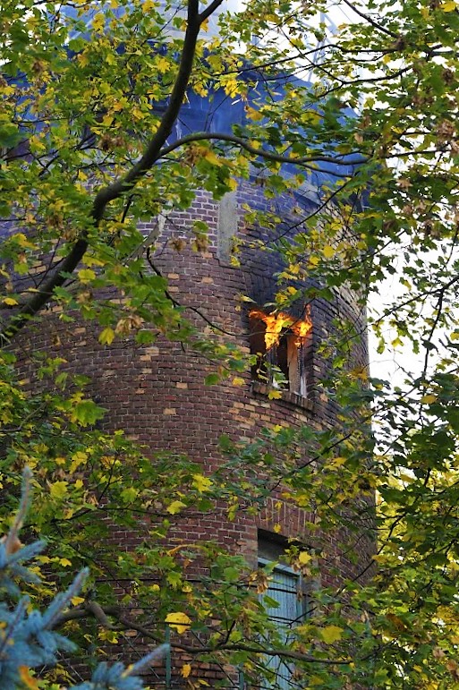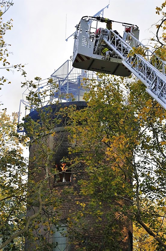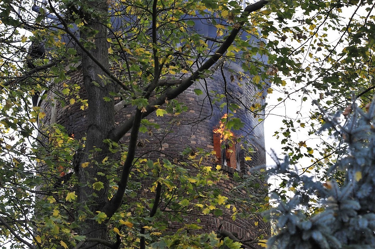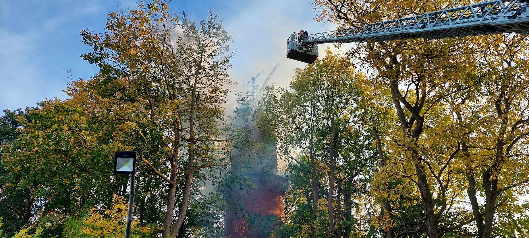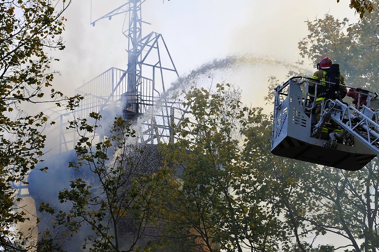 Zgłoszenie o pożarze wpłynęło do Stanowiska Kierowania o godz. 15:39. Zadysponowano 3 zastępy z JRG 1 oraz po jednym z JRG 2 i Wojskowej Straży Pożarnej. W momencie dojazdu na miejsce zdarzenia ogniem objęta była drewniana klatka schodowa od wysokości około 12 m do szczytu wieży. Wykorzystując drabinę mechaniczną przez otwory okienne podano na pożar wodę z działka gaśniczego, co doprowadziło do ugaszenia pożaru. Następnie strażacy weszli do wnętrza wieży dogaszając zarzewia ognia i przeszukując obiekt. Szczęśliwie nie stwierdzono osób poszkodowanych. Obiekt sprawdzono także kamerą termowizyjną nie stwierdzając ukrytych ognisk pożaru. Akcja trwała prawie 2 i pół godziny.