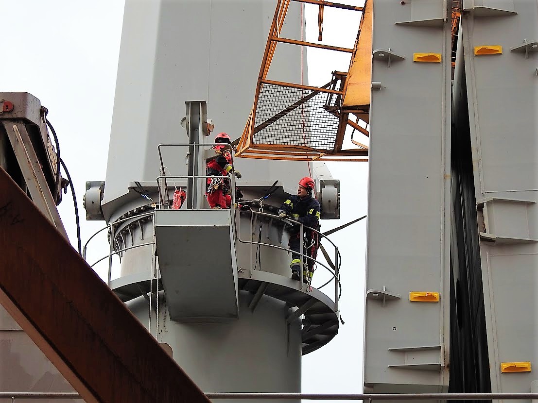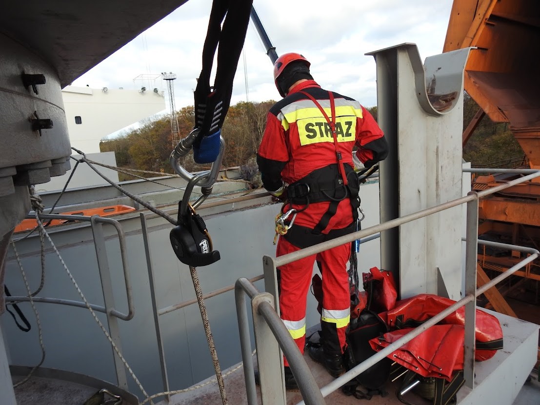 04.11.2021 r. o godz. 22:21 z Wojewódzkiego Centrum Powiadamiania Ratunkowego do Stanowiska Kierowania w Świnoujściu wpłynęła informacja o wypadku na terenie OT Port Świnoujście. Wynikało z niej, że spadła kabina suwnicy wraz z znajdującym się w niej operatorem, i że nie ma z nim kontaktu. Do zdarzenia zadysponowano dwa zastępy z JRG 2 i jeden z WSP Ognica. Po dojeździe na miejsce potwierdzono informację, że kabina wraz z operatorem spadła na podniesioną pokrywę luku ładowni statku. Ze względu na bardzo silny wiatr (25 - 30 m/s) rozstawienie drabiny mechanicznej SD40 okazało się niemożliwe. Równocześnie podjęto próbę dotarcia do poszkodowanego z podestu na pylonie dźwigu pokładowego, co również okazało się niemożliwe. Pozwoliło to jednak na stwierdzenie wzrokowe z odległości kilku metrów, że u poszkodowanego wystąpił masywny uraz ciała w postaci zmiażdżenia klatki piersiowej. Stwierdzono także niestabilność kabiny suwnicy spoczywającej na niewielkiej powierzchni, na którą napierały dodatkowo naprężone liny załadowanego rudą żelaza czerpaka o wadze około 20 ton. Dalsze działania ukierunkowano na zabezpieczenie niestabilnej kabiny suwnicy, jej usunięcie i ewakuację poszkodowanego technikami alpinistycznymi. W tym celu zadysponowano do zdarzenia Specjalistyczną Grupę Ratownictwa Wysokościowego „Pająk” z JRG nr 3 ze Szczecina, która przybyła na miejsce tuż po północy. Ekstremalne warunki pogodowe i brak stabilności kabiny suwnicy uniemożliwiły jednak dalsze działania. Zadysponowany na miejsce z JRG 1 w Koszalinie, największy w PSP województwa zachodniopomorskiego ciężki żuraw ratowniczy okazał się niewystarczający - zabrakło kilku metrów zasięgu. W związku z tym na miejsce zdarzenia przybył żuraw samojezdny o udźwigu 90 ton i wysięgu 50 metrów z Portu Wojennego Świnoujście. W godzinach porannych po ustabilizowaniu warunków pogodowych możliwe było kontynuowanie działań. Dalsze czynności dokonywane w obecności prokuratora ze względu na bezpieczeństwo musiały zostać podjęte we właściwej kolejności i objęły: