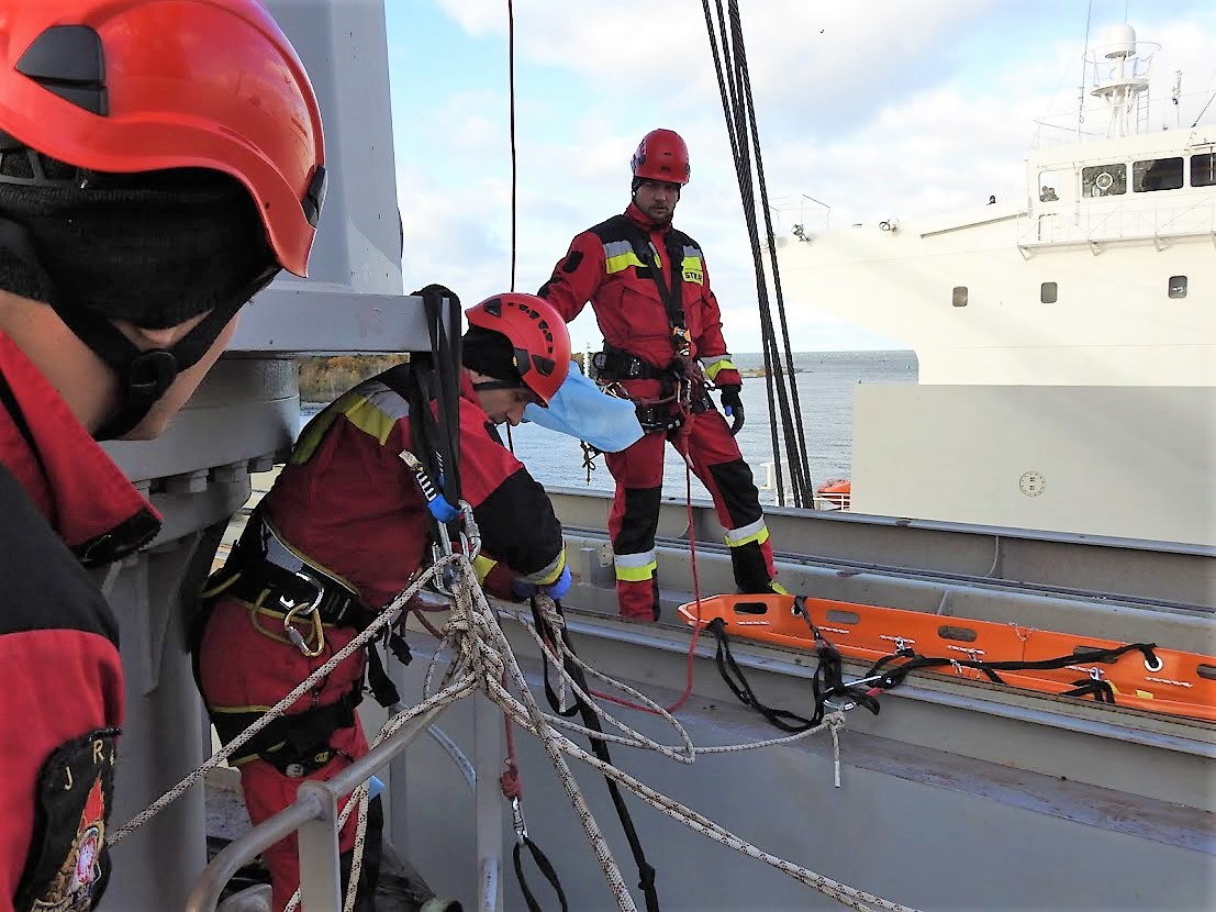 - ewakuację poszkodowanego technikami alpinistycznymi na pokład, a następnie trapem na nabrzeże.