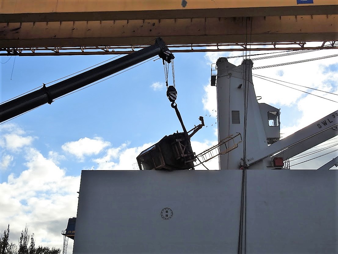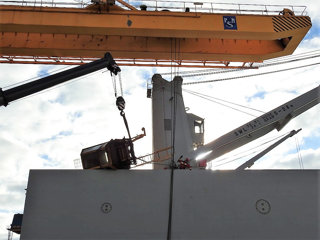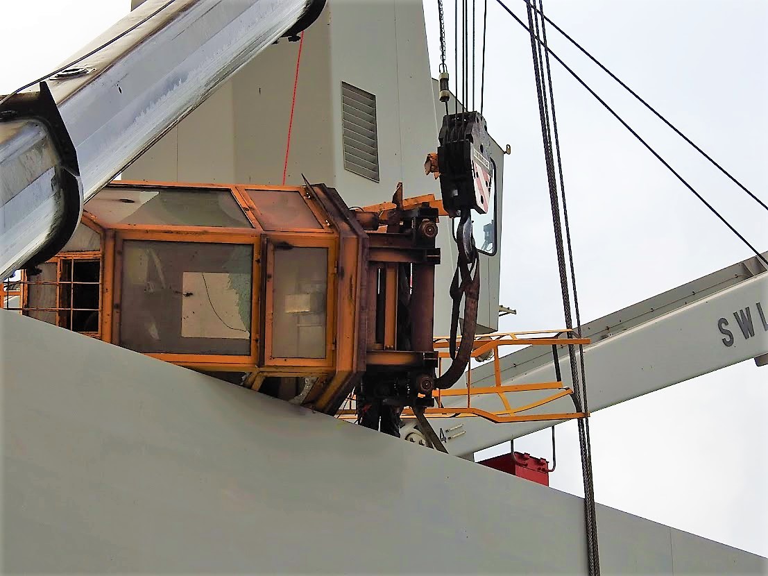 - odprężenie lin stalowych czerpaka napierających na konstrukcję kabiny poprzez jego opróżnienie, opuszczenie na dno ładowni oraz przemieszczenie wózka suwnicy (czynności te wykonali pracownicy OT Port ręcznie, gdyż sterowanie elektryczne zostało zniszczone podczas upadku kabiny);