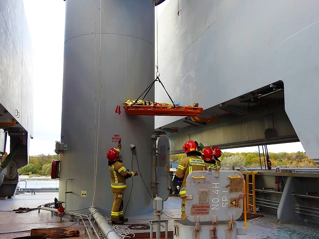 - wykonanie dostępu do poszkodowanego poprzez uniesienie kabiny i przemieszczenie jej na nabrzeże przy pomocy żurawia;