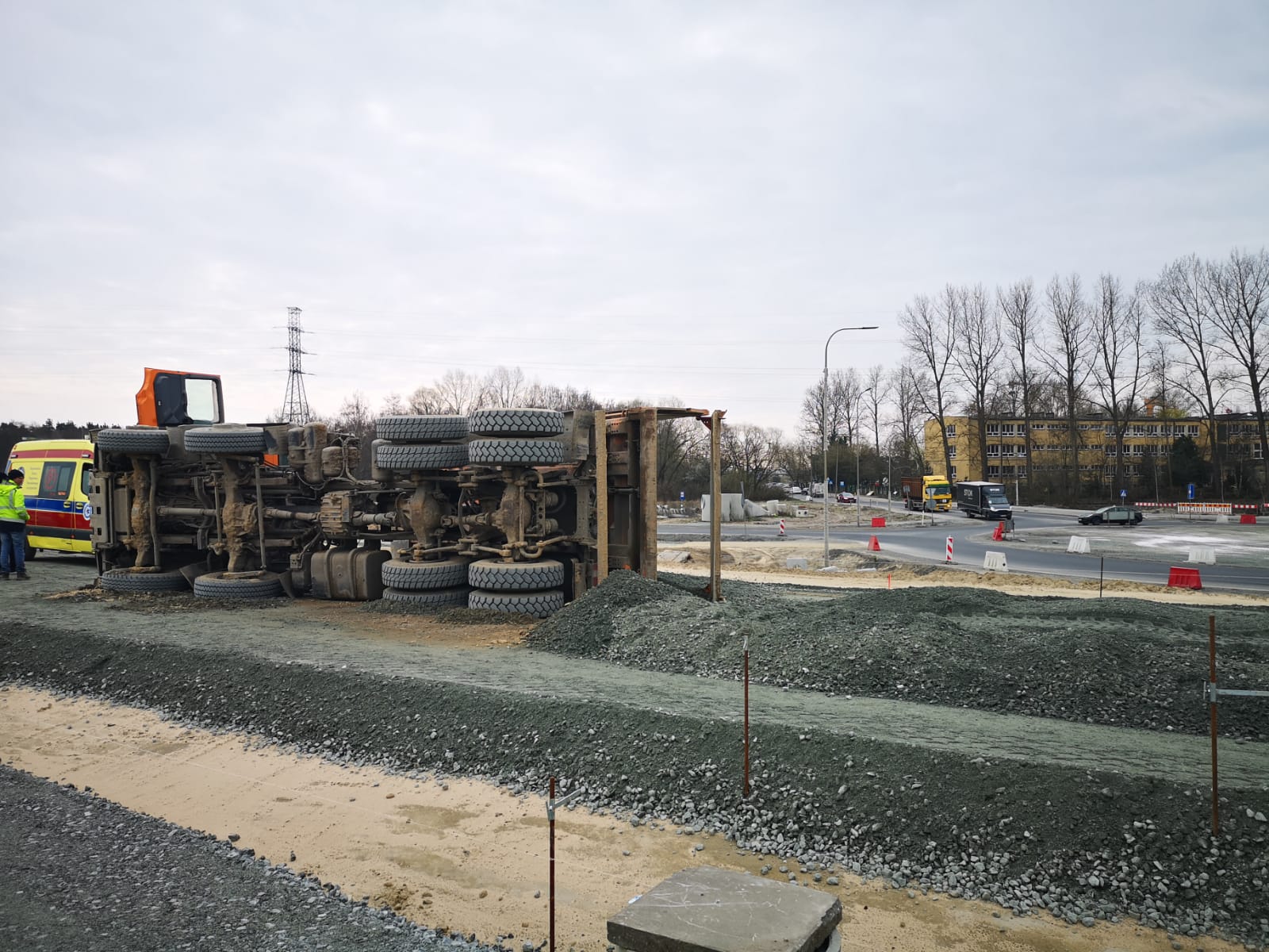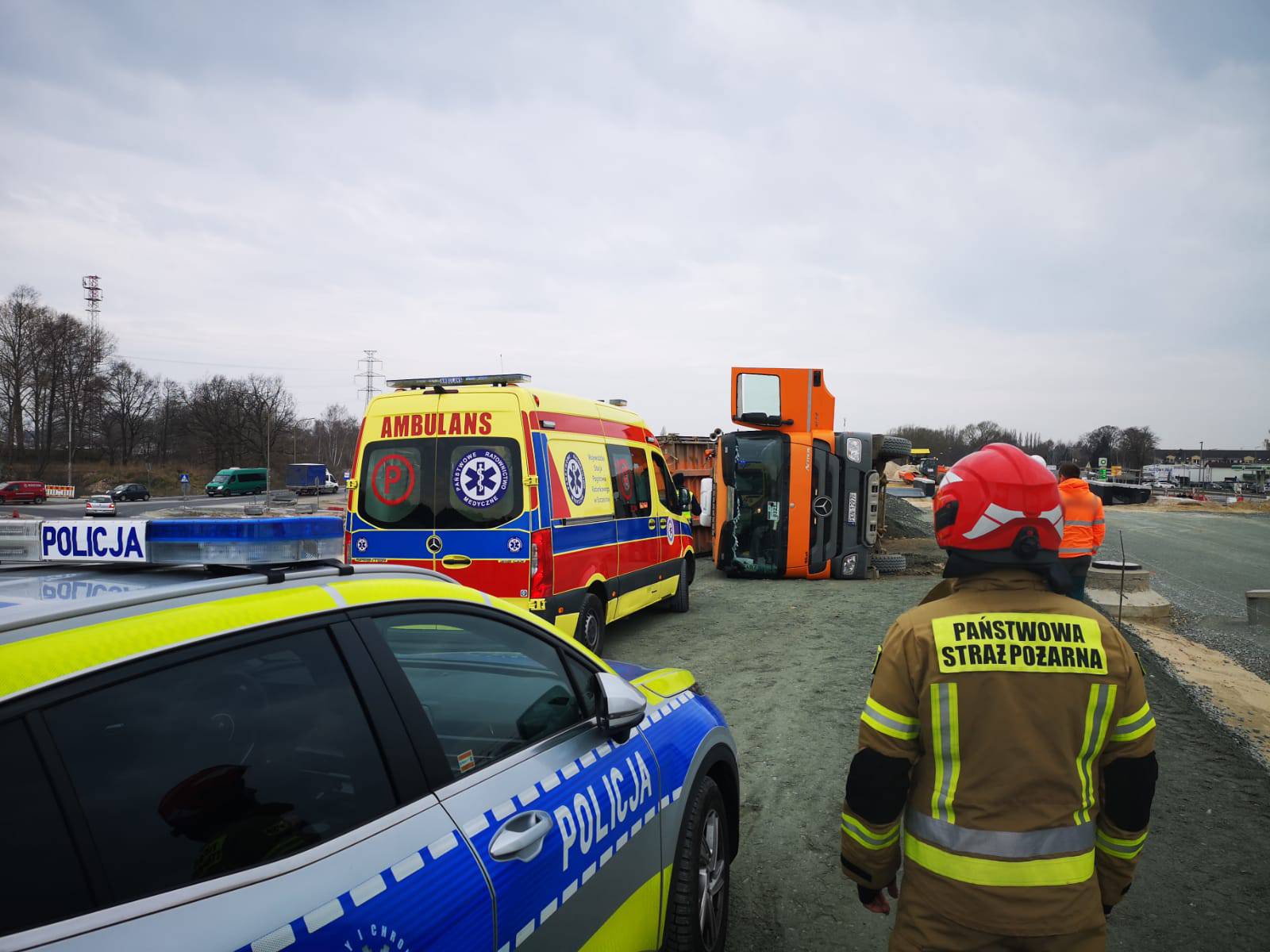 Przybyli na miejsce strażacy zabezpieczyli miejsce zdarzenia. Ustalono, że w wyniku rozładunku tłucznia na terenie budowy doszło do przewrócenia pojazdu. W wyniku tego zdarzenia poszkodowany został kierowca samochodu ciężarowego. Strażacy udzielili kwalifikowanej pierwszej pomocy kierowcy ciężarówki, który w trakcie dojazdu jednostek ochrony przeciwpożarowej znajdował się poza pojazdem. Przekazano poszkodowanego z podejrzeniem urazu kręgosłupa przybyłemu na miejsce zespołowi ratownictwa medycznego.