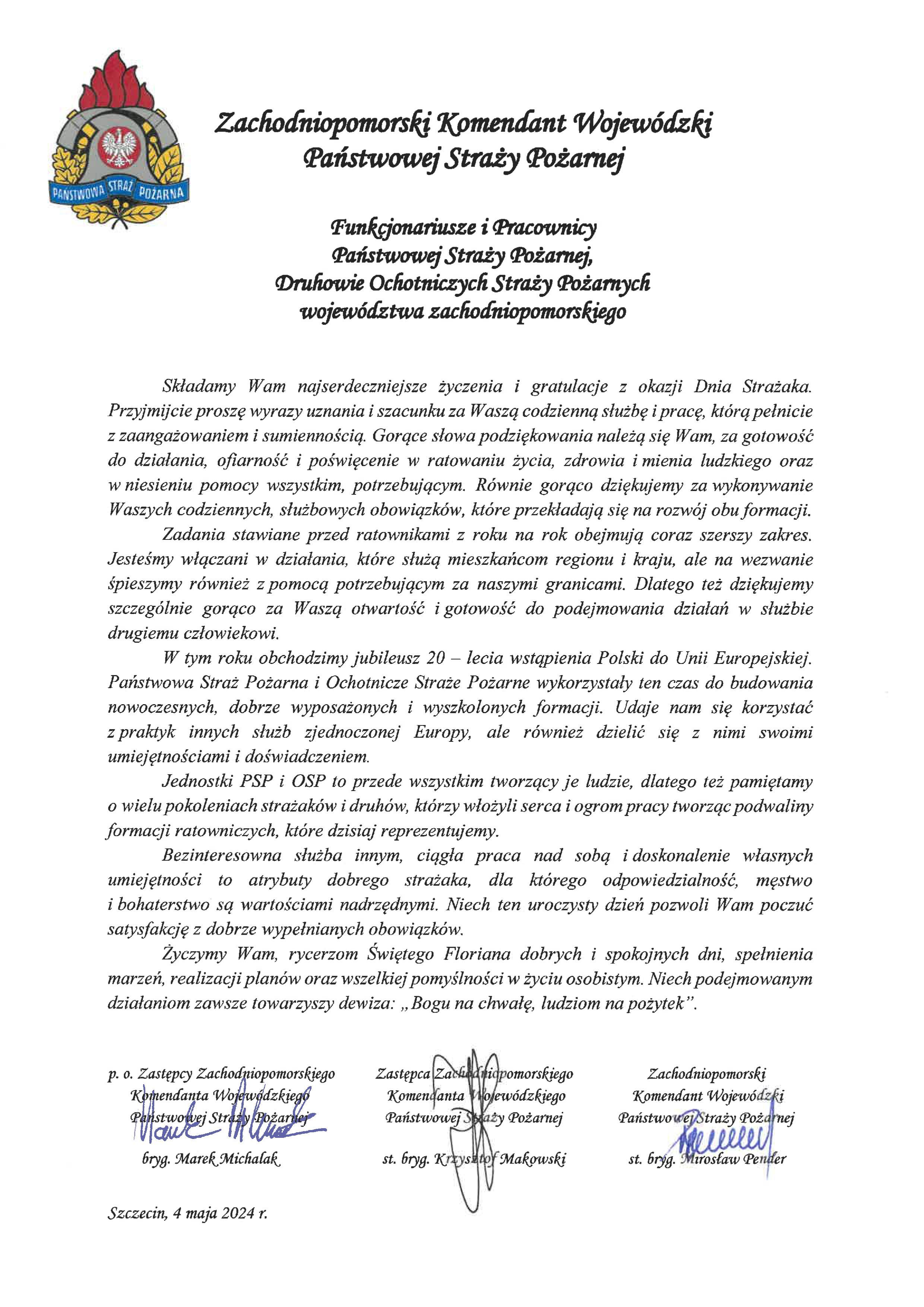 Czwarty maja daje okazję do radosnego manifestowania obecności straży pożarnych w systemie bezpieczeństwa narodowego i życiu społecznym każdej z naszych małych ojczyzn. Jest to czas zasłużonej satysfakcji z zaszczytów oraz materialnych i symbolicznych wyróżnień. Być może za najważniejszą nagrodę powinniśmy uznać powszechne zaufanie i okazywaną naszej formacji sympatię. Z tej okazji, do wszystkich Państwa kieruję szczere i serdeczne gratulacje.