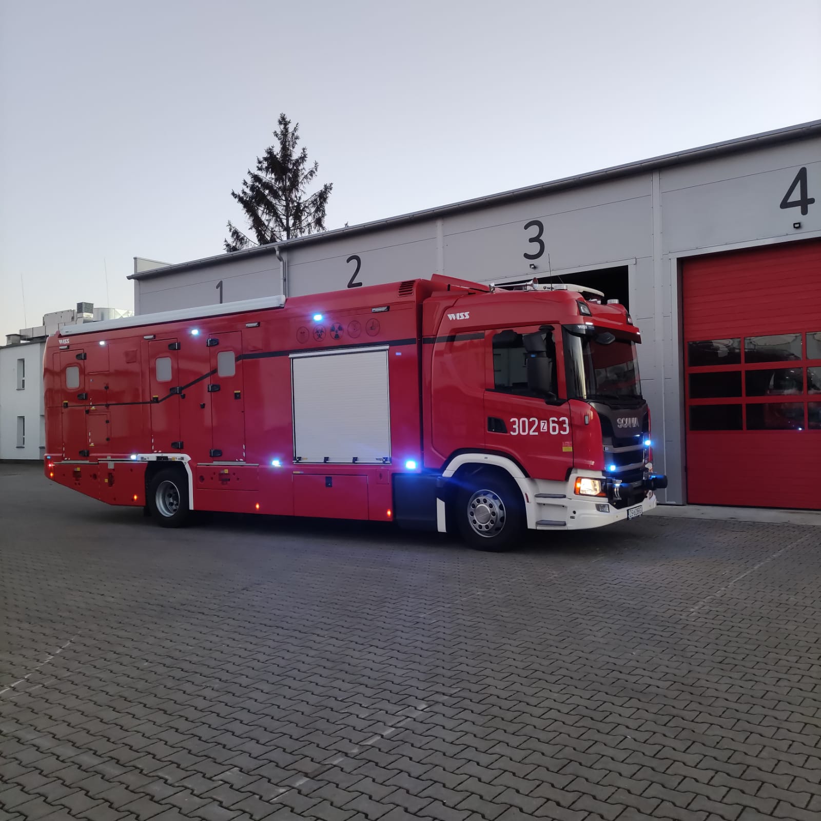 Samochód na podwoziu SCANIA do dekontaminacji przy zagrożeniach chemicznych wraz z wyposażeniem o wartości 4 821 600 zł w ramach programu „Usprawnienie systemu ratownictwa w transporcie kolejowym – etap I”.