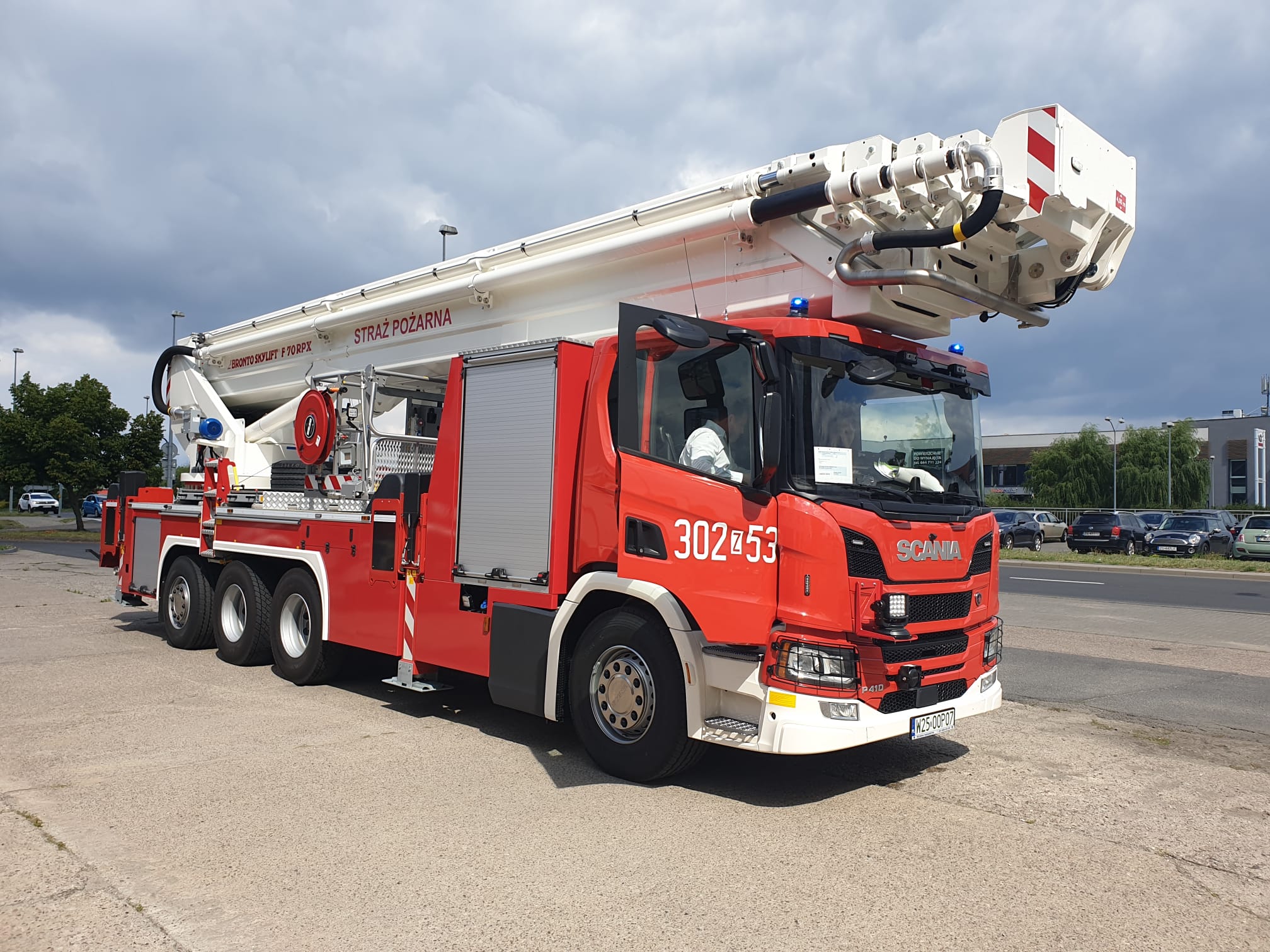 Podnośnik hydrauliczny na podwoziu SCANIA o wysokości ratowniczej 68 m o wartości 5 335 740 zł w ramach programu „Usprawnienie Systemu ratownictwa na drogach – etap IV”.