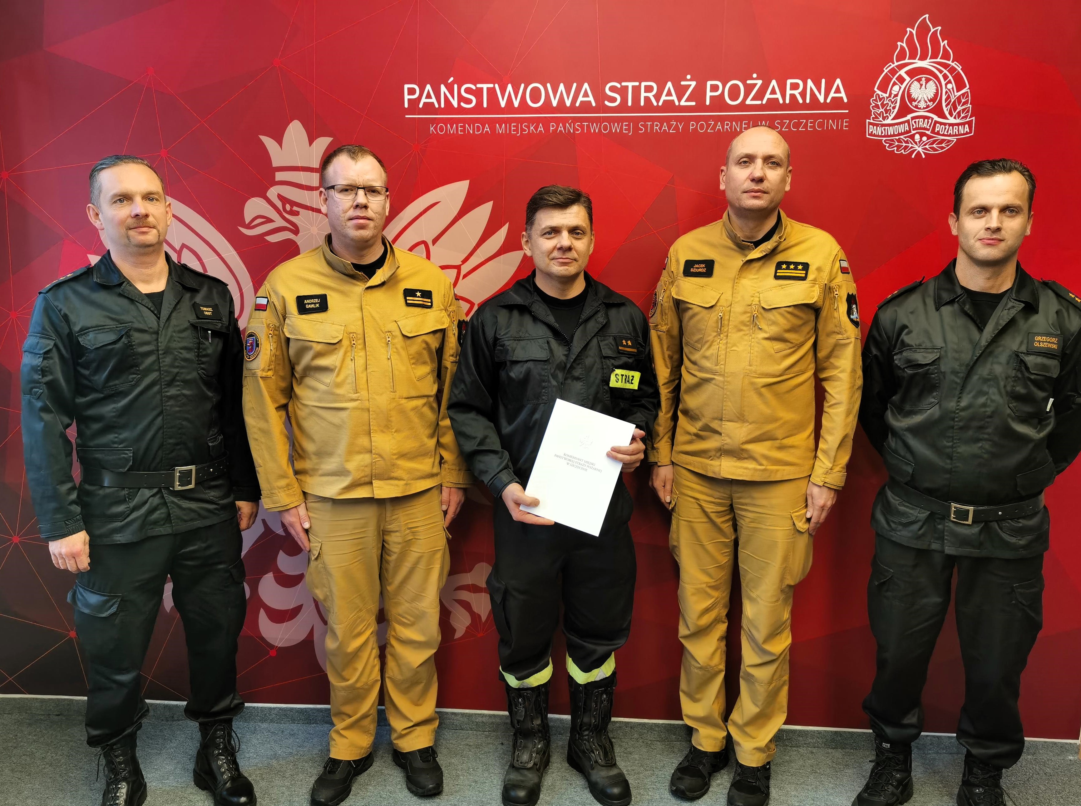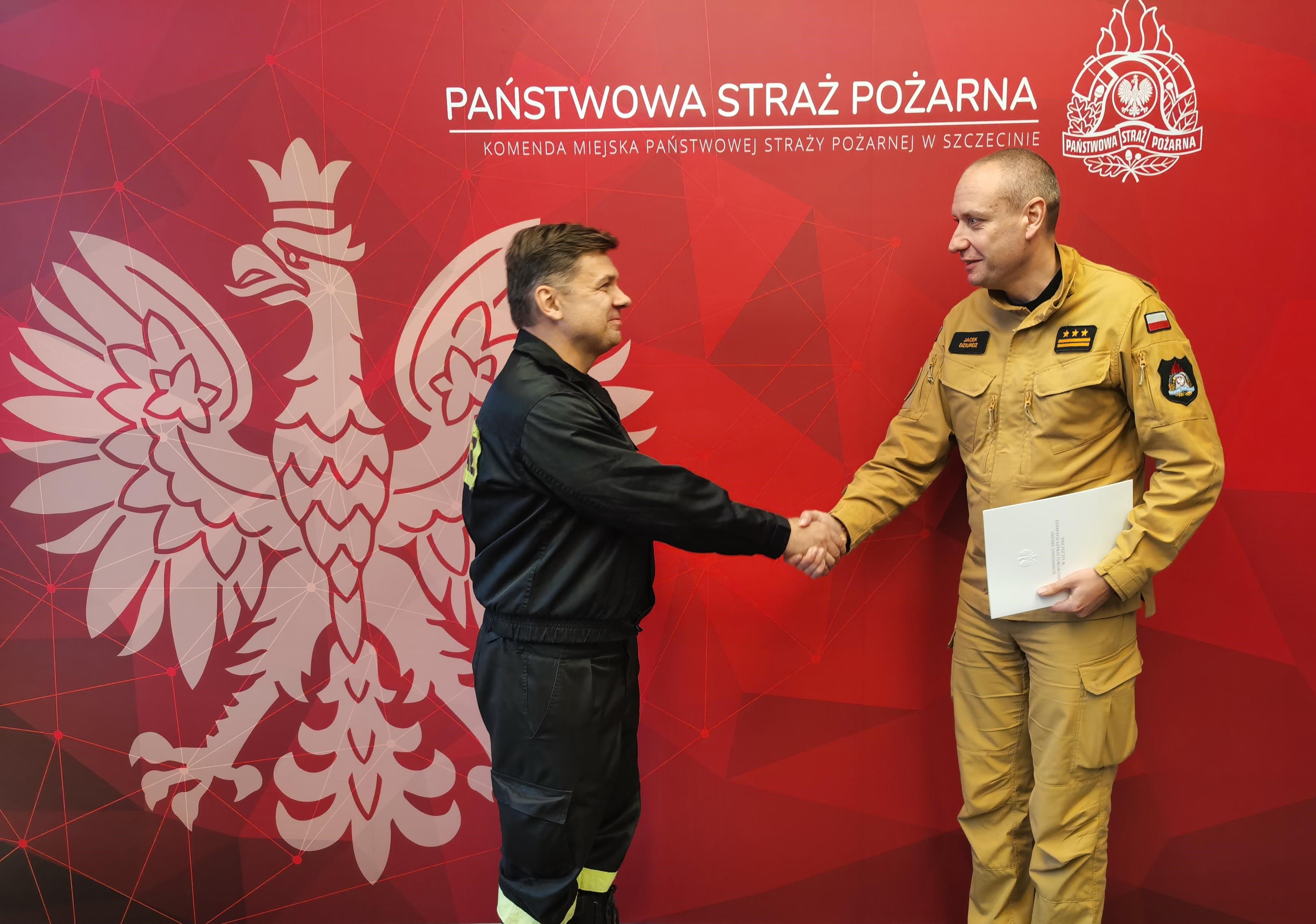 Komendant Miejski Państwowej Straży Pożarnej w Szczecinie wręczył nagrodę specjalną mł. kpt. Arturowi Burbo, który w czasie działań ratowniczych wskoczył do wody i uratował tonącego mężczyznę.