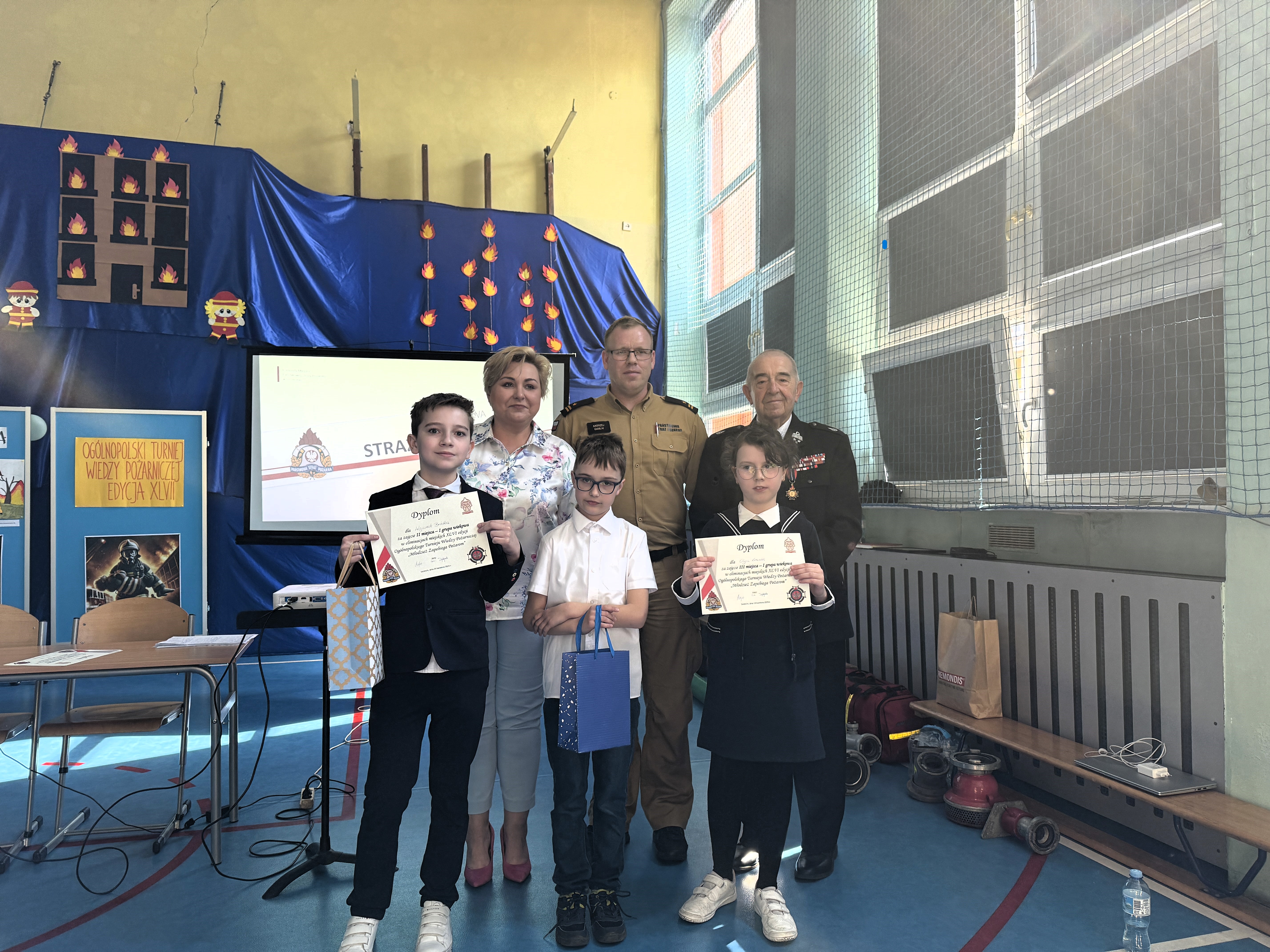 Nagrody wręczył Zastępca Komendanta Miejskiego Państwowej Straży Pożarnej w Szczecinie mł. bryg. Andrzej Gawlik, Prezes Zarządu Oddziału Miejskiego Związku OSP RP w Szczecinie dh. Henryk Jerzyk oraz Dyrektor Szkoły Podstawowej nr 63 w Szczecinie Pani Joanna Połeć-Trusiuk.