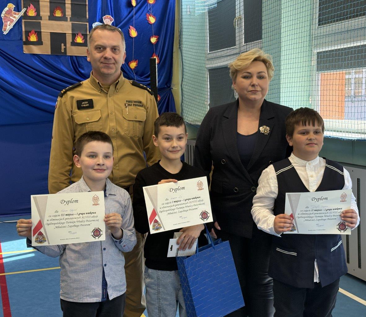 Nagrody wręczył Komendant Miejski Państwowej Straży Pożarnej w Szczecinie bryg. Jacek Cyburt oraz Dyrektor Szkoły Podstawowej nr 63 w Szczecinie Pani Joanna Połeć-Trusiuk.
