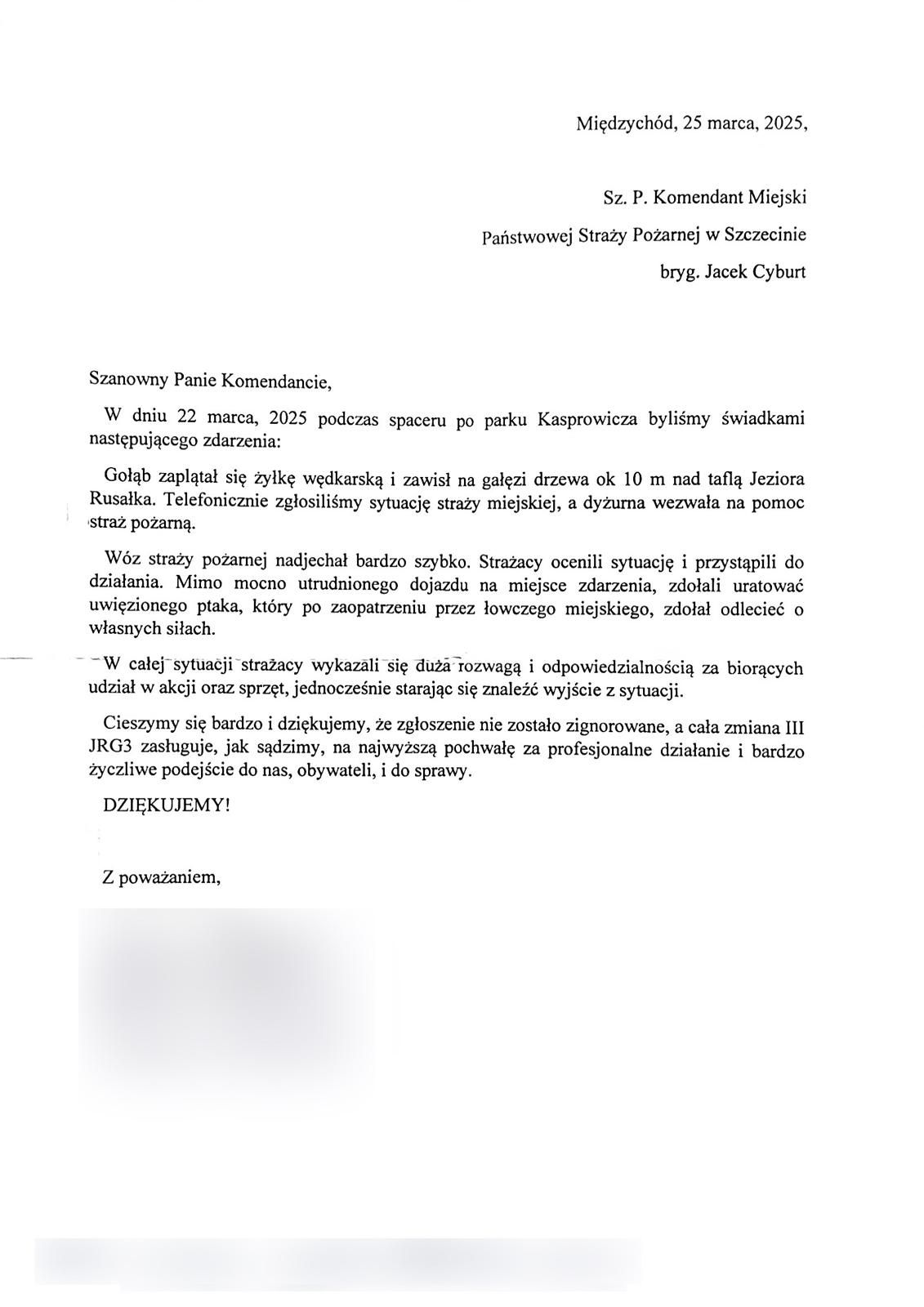 Komenda Miejska Państwowej Straży Pożarnej w Szczecinie otrzymała list z podziękowaniami za działania ratownicze podjęte przez strażaków III zmiany Jednostki Ratowniczo-Gaśniczej nr 3.