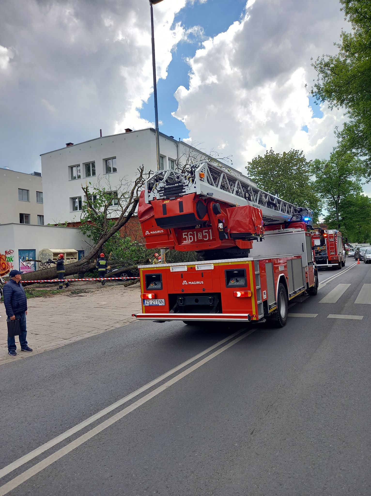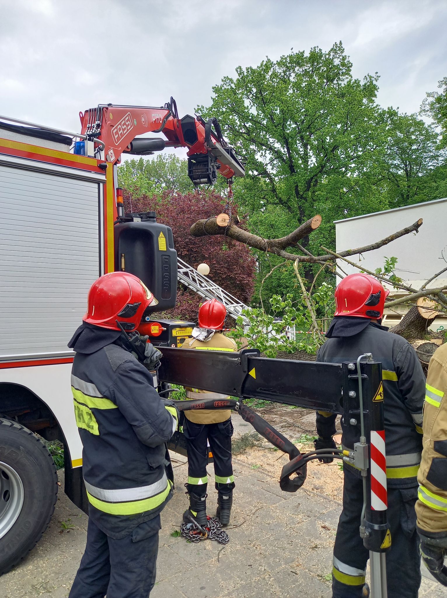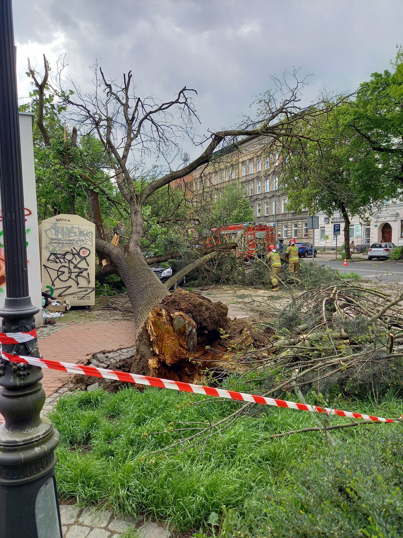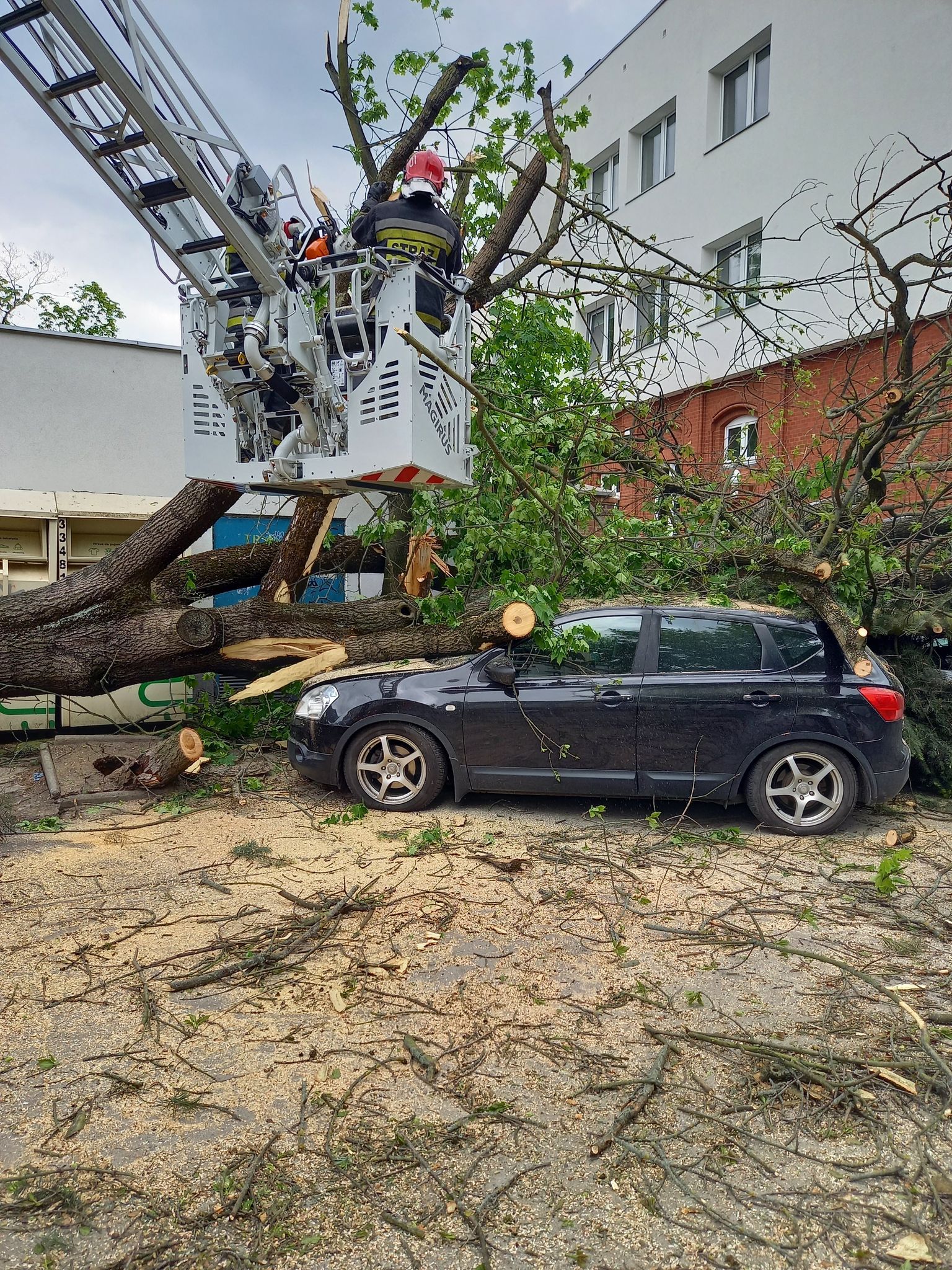 19 maja o godzinie 15:23 wpłynęło zgłoszenie do Stanowiska Kierowania Komendanta Miejskiego Państwowej Straży Pożarnej w Szczecinie o znajdującym się na chodniku przy ul. Kopernika powalonym drzewie na trzech samochodach,. Na miejsce działań zadysponowano 3 zastępy, w tym zastęp ratownictwa technicznego. Działania zastępów polegały na zabezpieczeniu miejsca zdarzenia. Następnie przy pomocy SCD – 42 i dźwigu HDS wydobyto gałęzie i konary zalegające na trzech przygniecionych samochodach osobowych, umożliwiając dotarcie do pojazdów. Drewno pocięto i zabezpieczono.