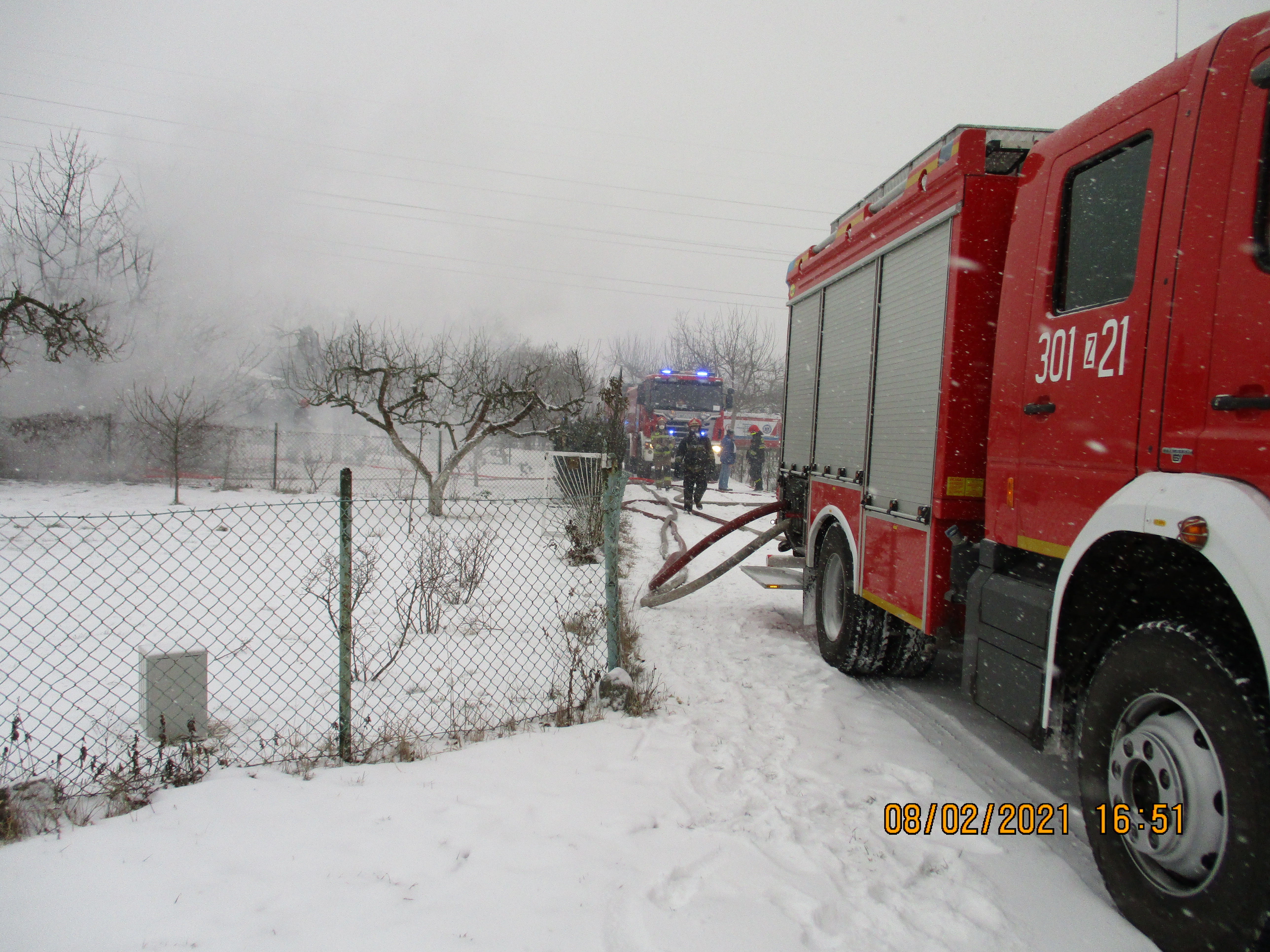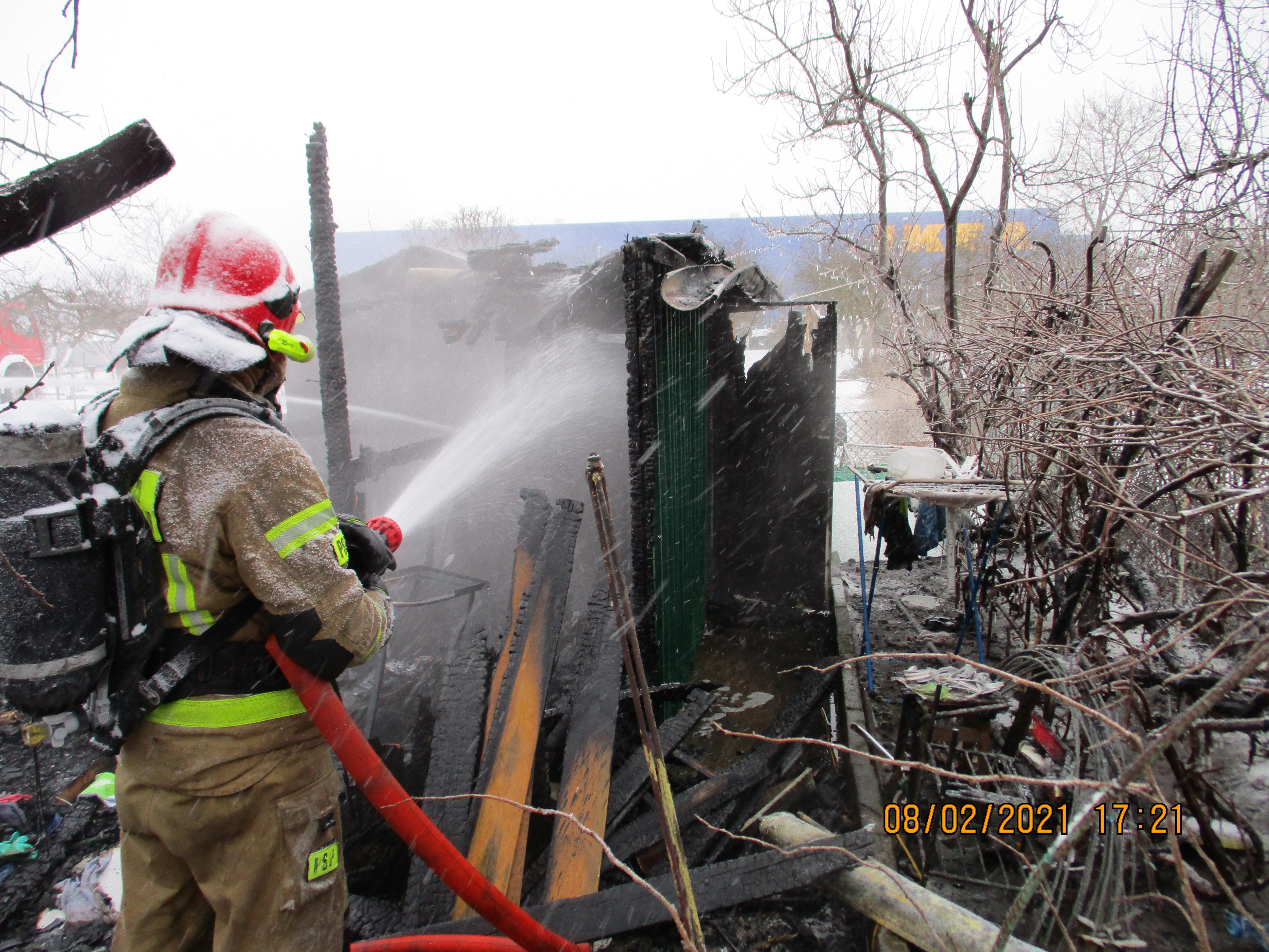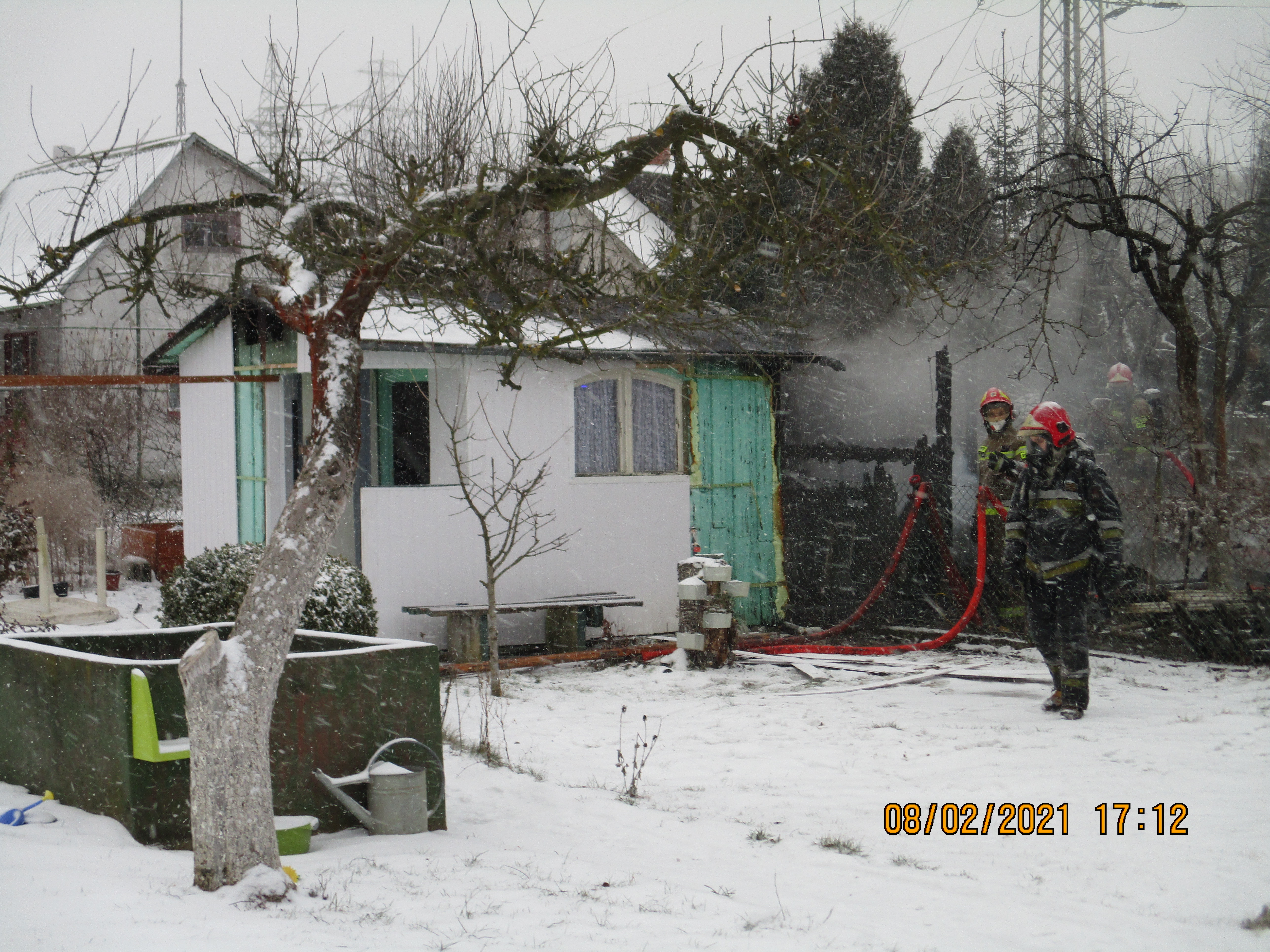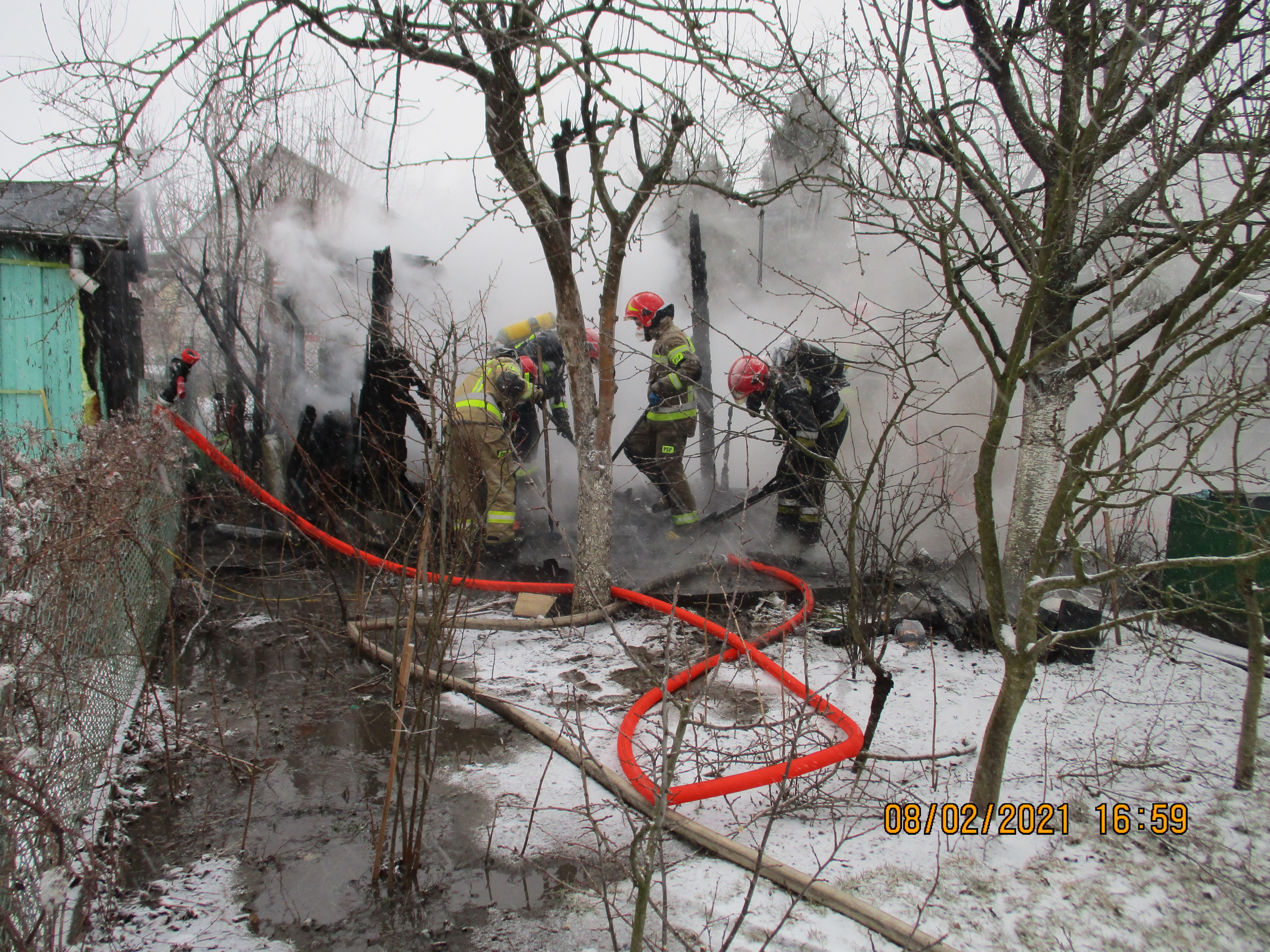 Dnia 08.02.2021 roku o godz.15:19 otrzymano zgłoszenie o pożarze altany na ogródkach działkowych przy ulicy Białowieskiej. Po przybyciu zastępów PSP na miejsce zdarzenia zastano w pełni rozwinięty pożar drewnianej altany. Działania zastępów polegały na zabezpieczeniu miejsca zdarzenia następnie podano dwa prądy wody w natarciu na palącą się altanę oraz jeden prąd wody w obronie zagrożonej pożarem altanki usytuowanej na sąsiedniej działce.