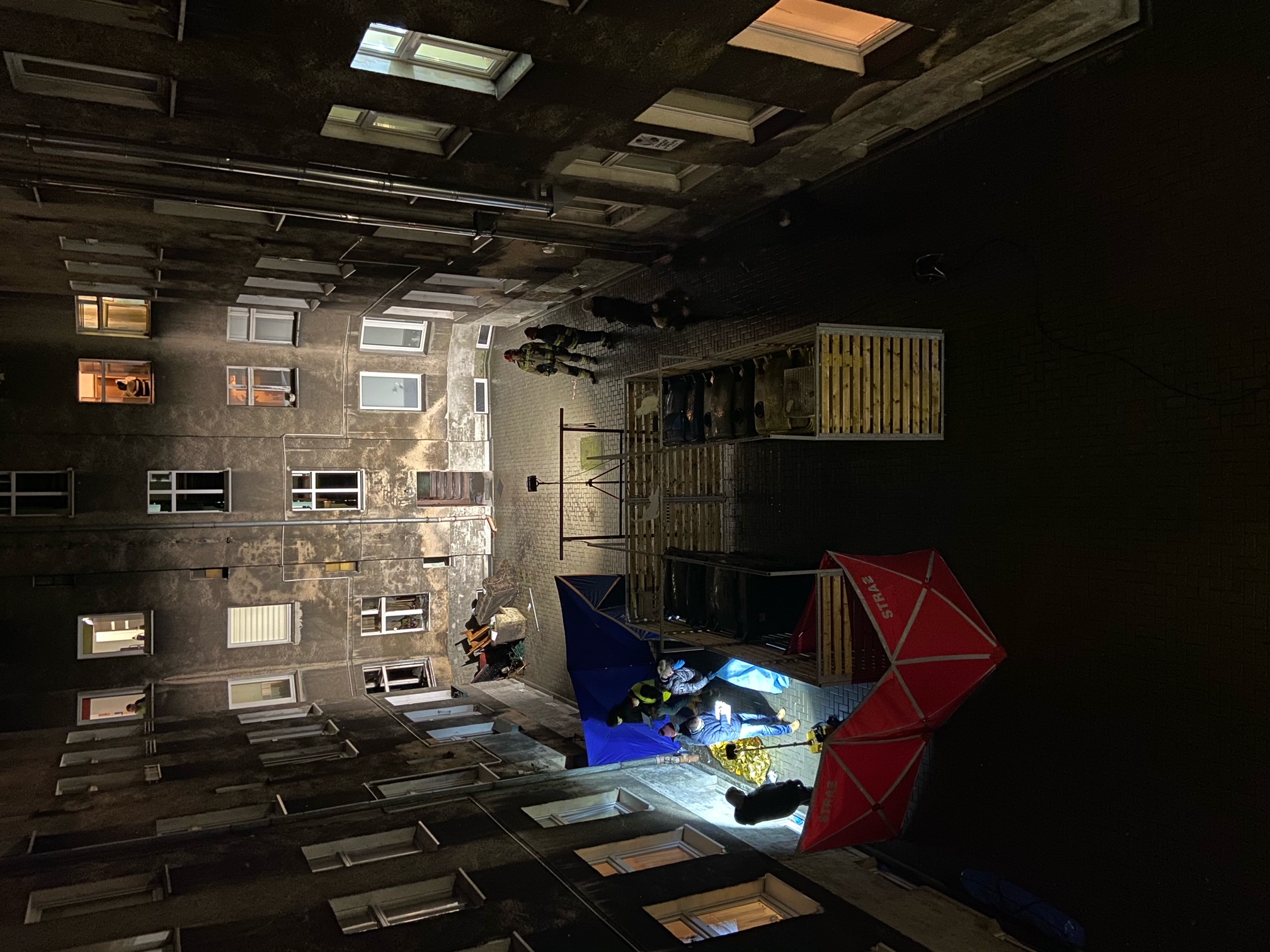 Działania zastępów polegały na podaniu dwóch prądów gaśniczych wody do mieszkania. Jeden przez drzwi wejściowe drugi przez okno. Dokonano oddymienia klatki schodowej. W trakcie działań w mieszkaniu znaleziono dwóch mężczyzn, którzy zostali przekazani zespołowi ratownictwa medycznego. Ratownicy rozpoznali zgon u dwóch mężczyzn.